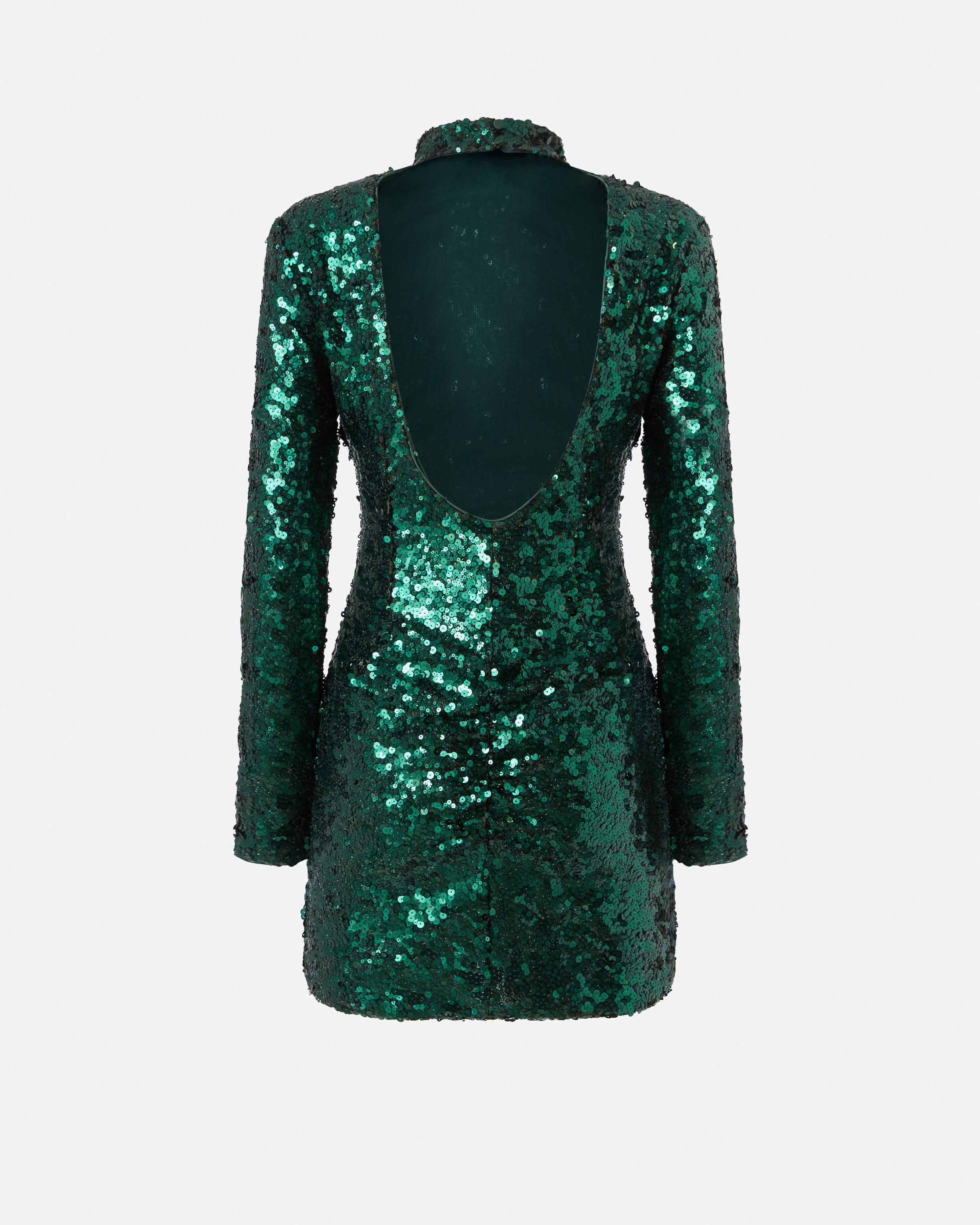 Vestito aderente ed extracorto, realizzato con una base in tulle bistretch e caratterizzato da collo alto, maniche lunghe e profondo scollo a U sul retro con bottoni in raso da allacciare dietro il collo. Il tessuto principale è interamente ricamato con paillettes di diverse dimensioni e finiture, cucite in sovrapposizione per creare un effetto tridimensionale. Il gioco di paillettes conferisce al capo un effetto visivo ricco e dinamico, regalando profondità e luminosità al design. Accendi le tue occasioni speciali e serate di festa con questo abito da sera pensato per dare un valore unico alla tua femminilità, soprattutto se abbinato a un paio di scarpe décolleté dal tacco alto.