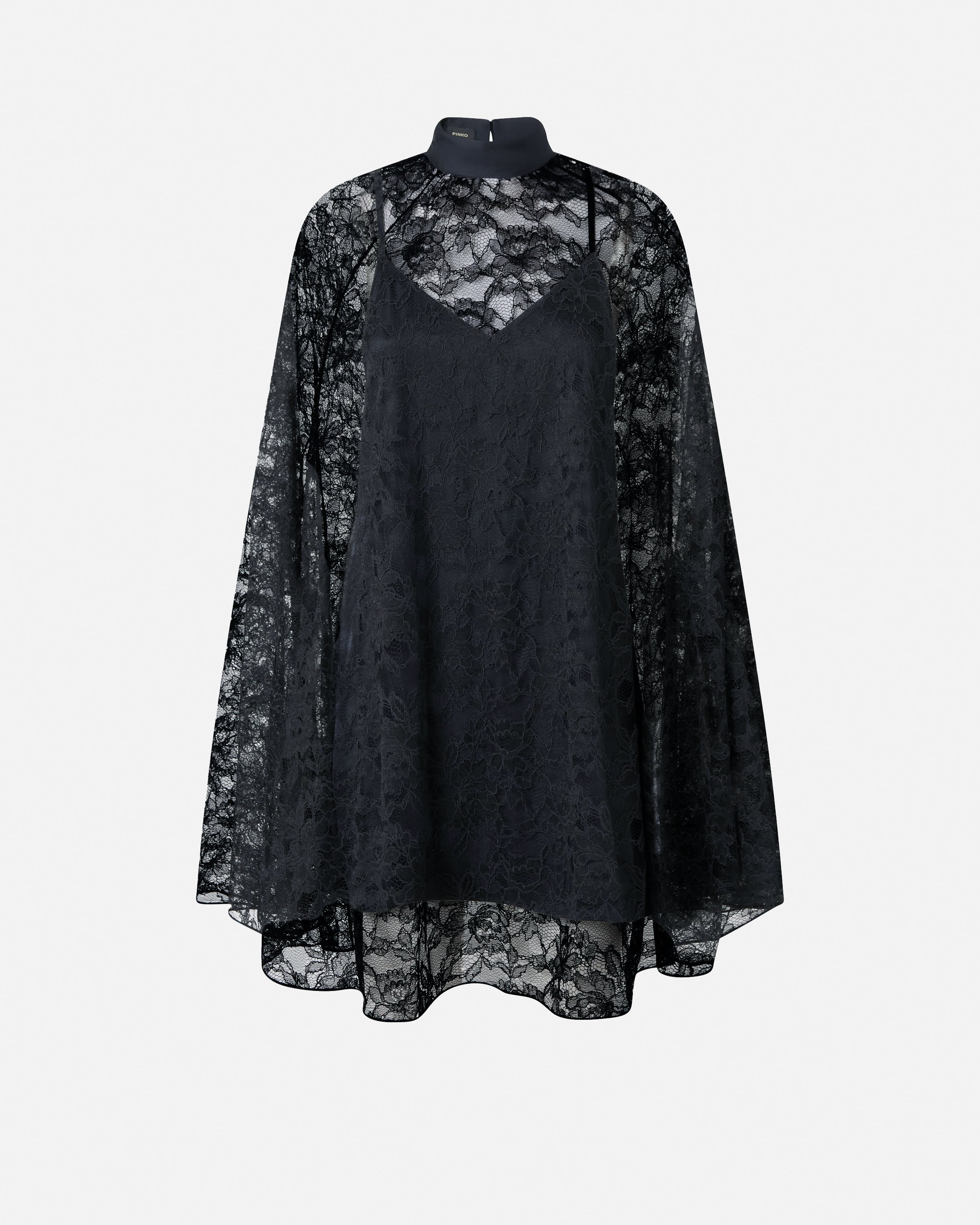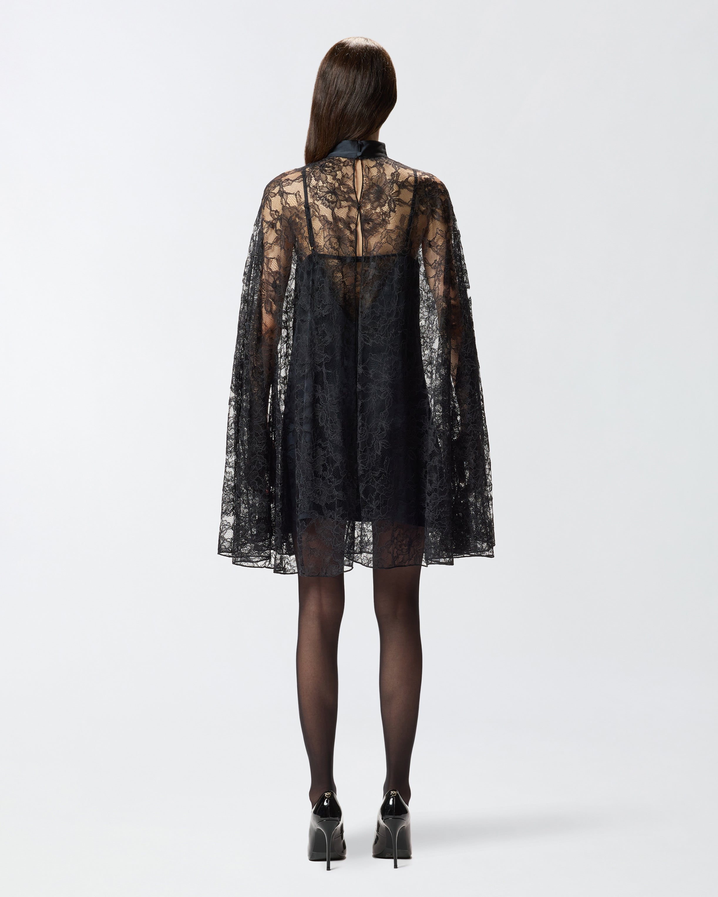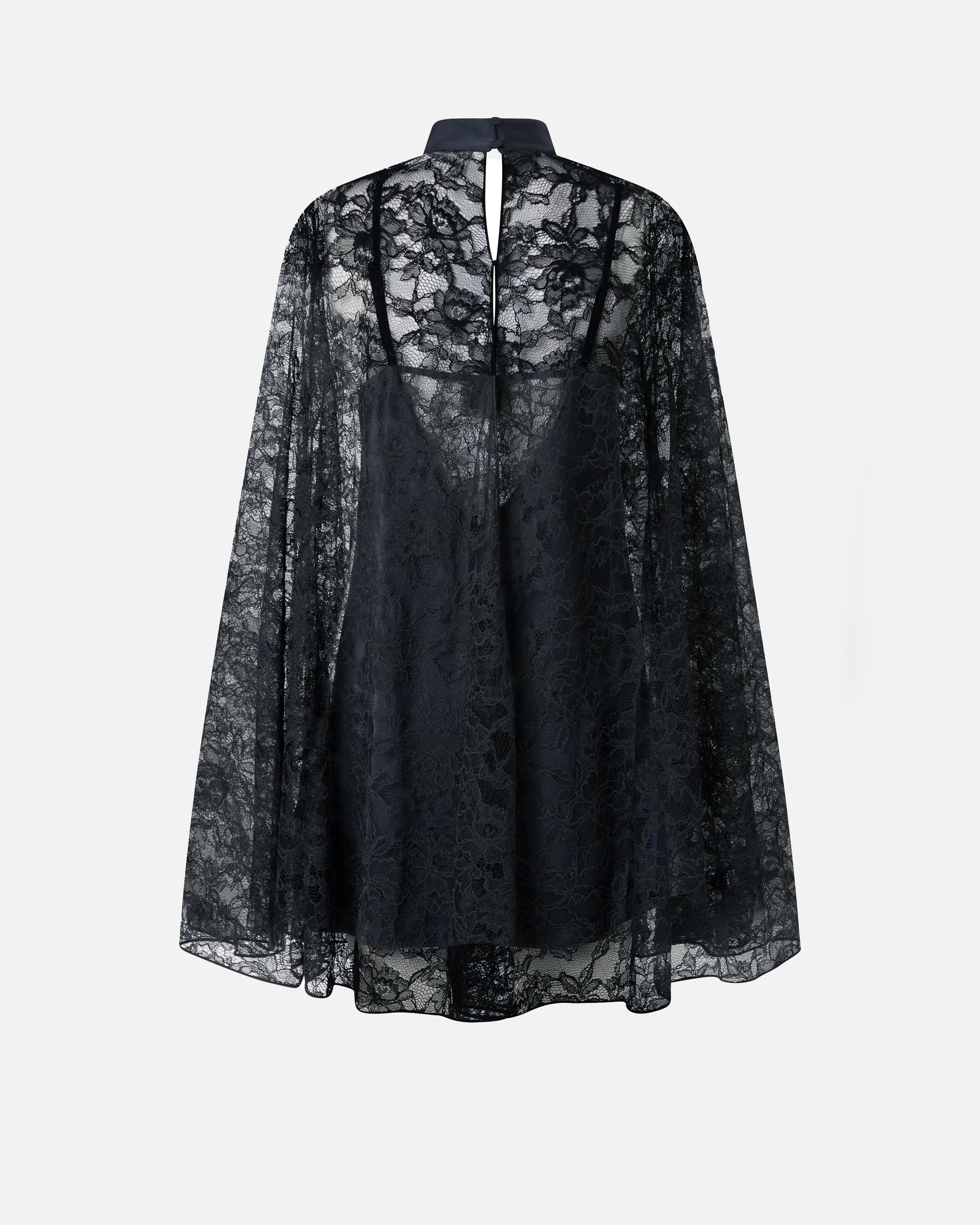 Abito corto a collo alto caratterizzato da una linea morbida e da ampie maniche lunghe con spacco sul davanti che permette al braccio di uscire leggermente. Il pizzo rebrodè dal motivo floreale, molto leggero e finemente lavorato, ricopre tutto il capo e viene scandito dal caratteristico cordoncino e da dettagli in raso, come il collo e la sottoveste. Il taglio minimalista del design lo rende perfetto per le occasioni eleganti e non solo.