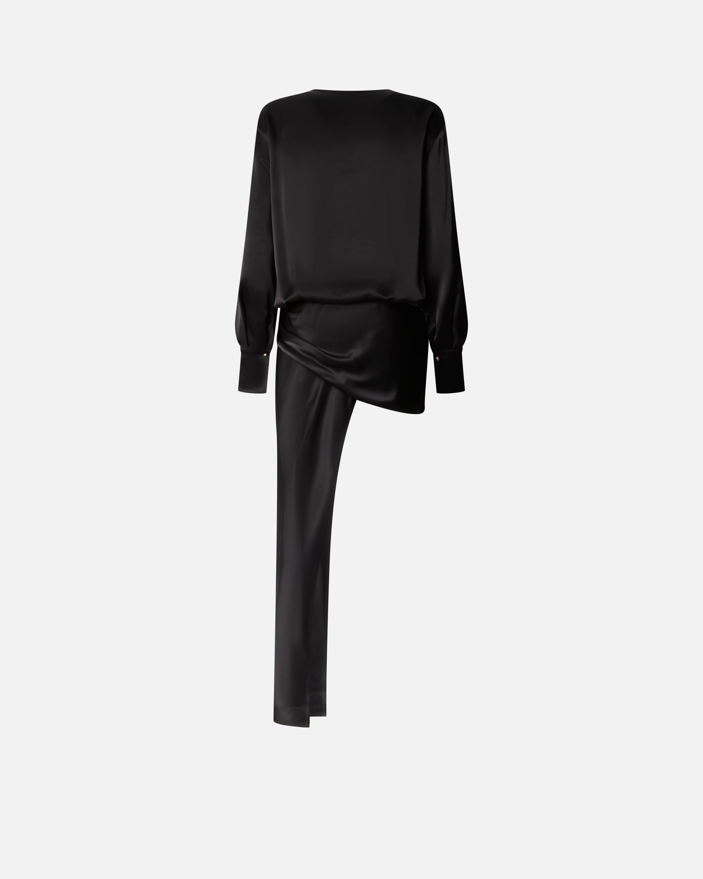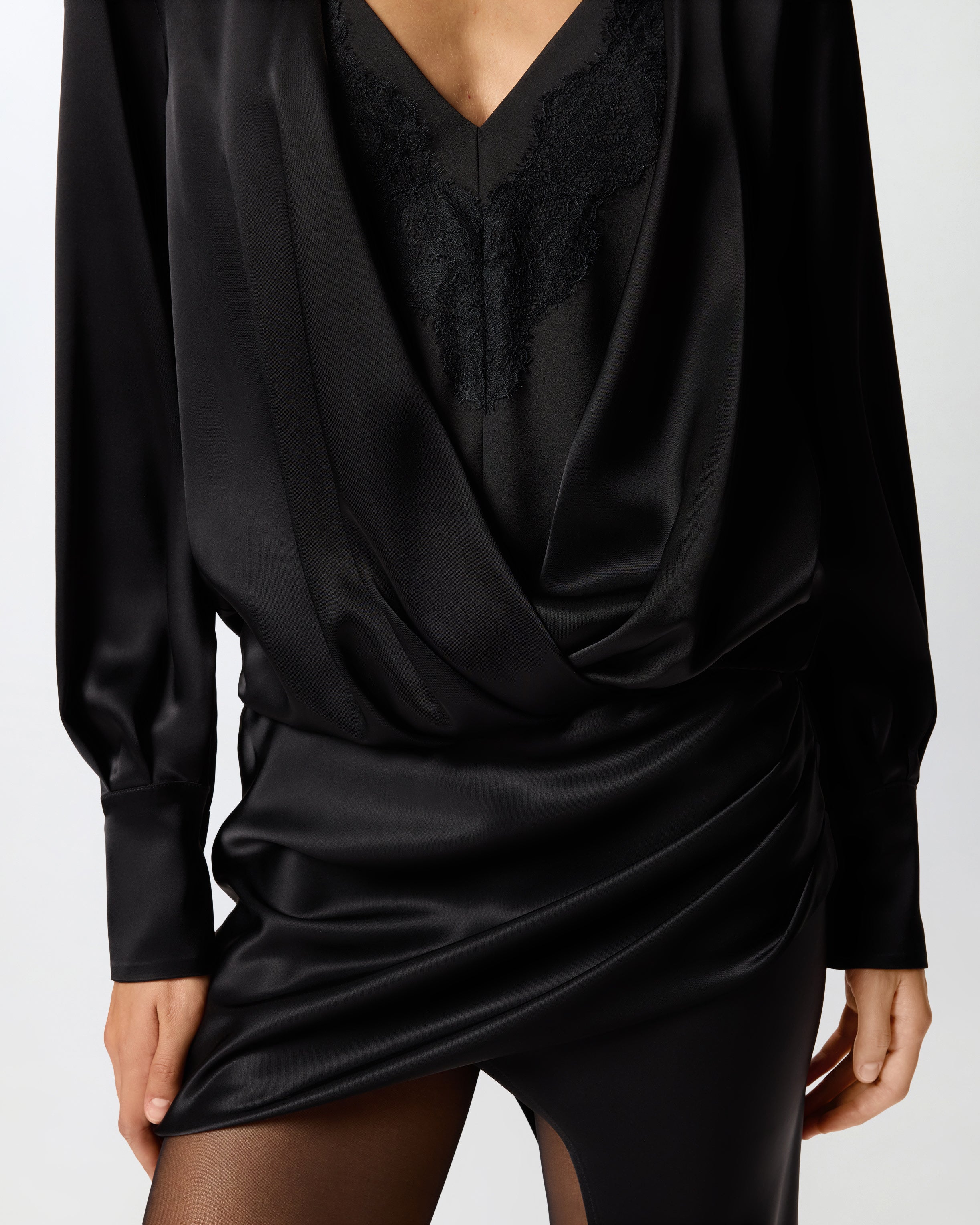 Abito corto con strascico laterale, dotato di zip invisibile a lato e di maniche con bottone a boule color oro. Il raso lucido conferisce una lucentezza unica e una mano particolarmente morbida al capo. Il capo è completato da un tocco di sensualità dato dal top lingerie con pizzo a contrasto. Indossa questo design per un effetto fluido e scivolato che esalta con eleganza e raffinatezza le linee e la silhouette femminile.