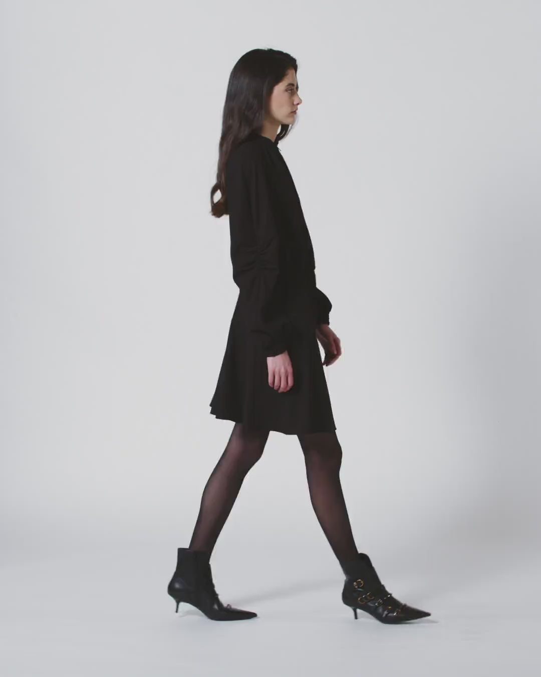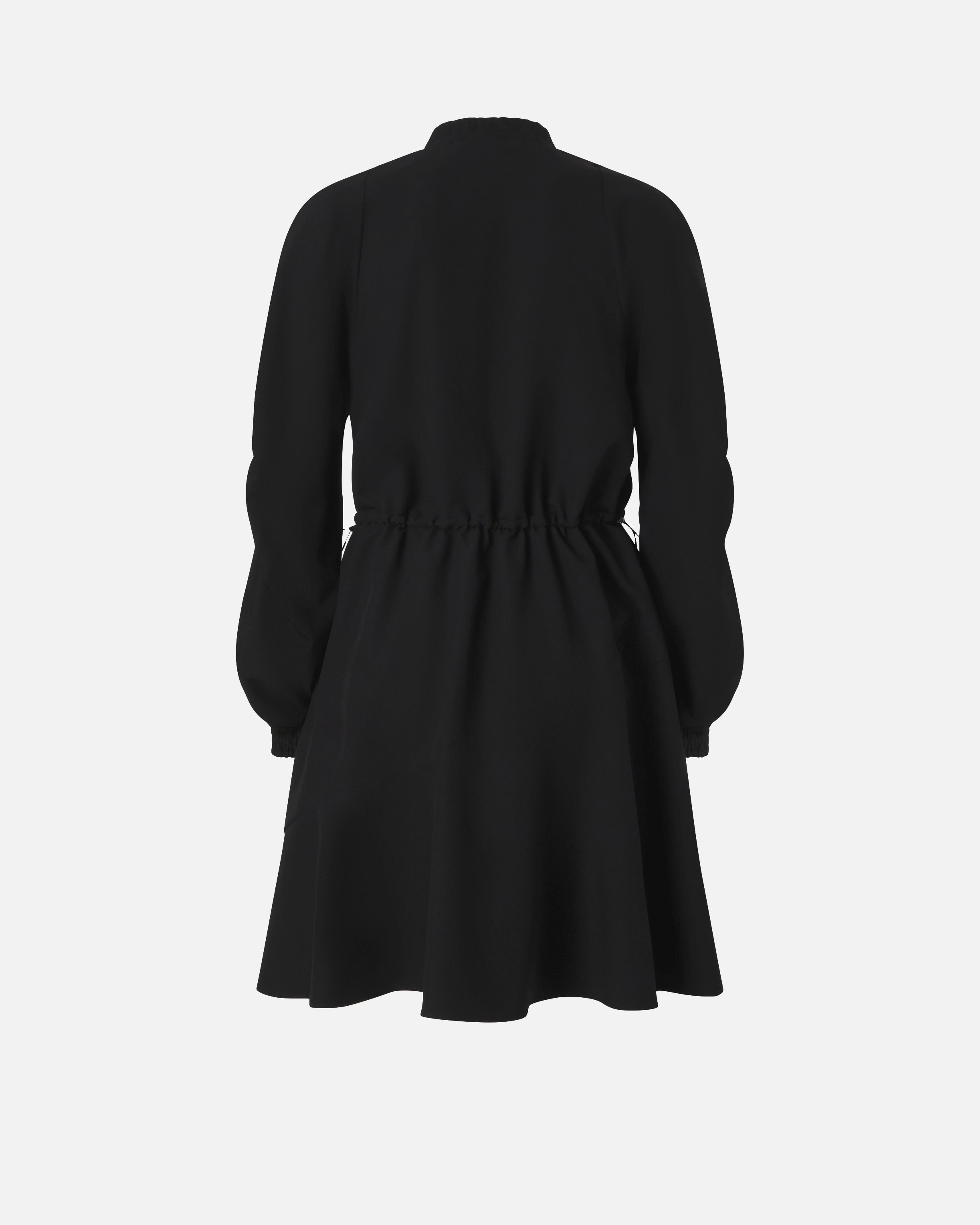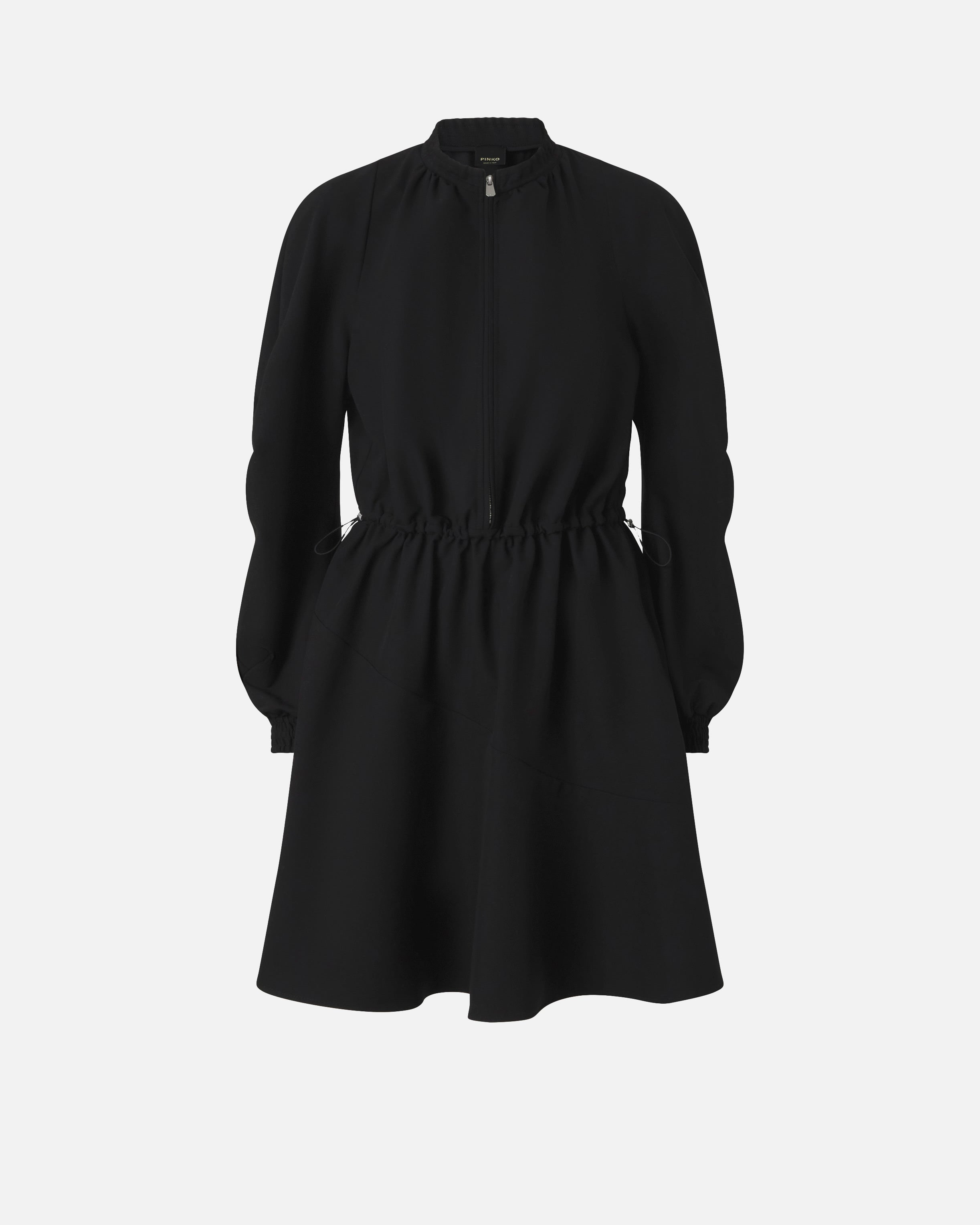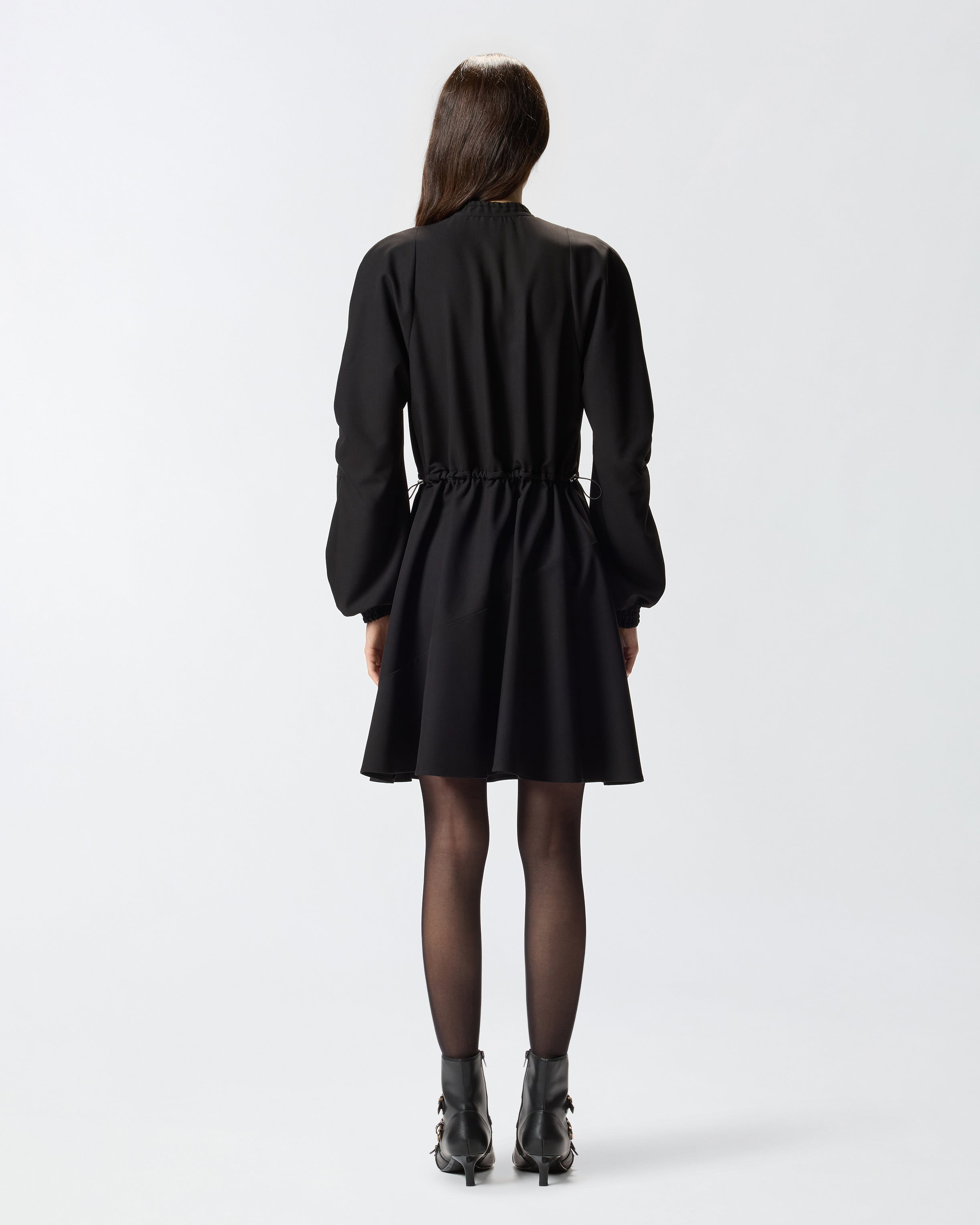 Abito corto in tessuto tecnico di viscosa stretch fluido con gonna leggermente svasata, collo alla coreana e maniche lunghe a sbuffo rifinite da polsino elasticizzato. In vita è presente una comoda coulisse d'ispirazione trekking per regolare l'indosso. Il modello presenta una vestibilità sfiancata, più aderente sui fianchi. Chiusura con zip davanti. Quest'abito è tanto elegante quanto versatile: indossalo con un paio di ballerine per un look da giorno, eleva il tuo stile da serata speciale con un paio di tacchi alti.
