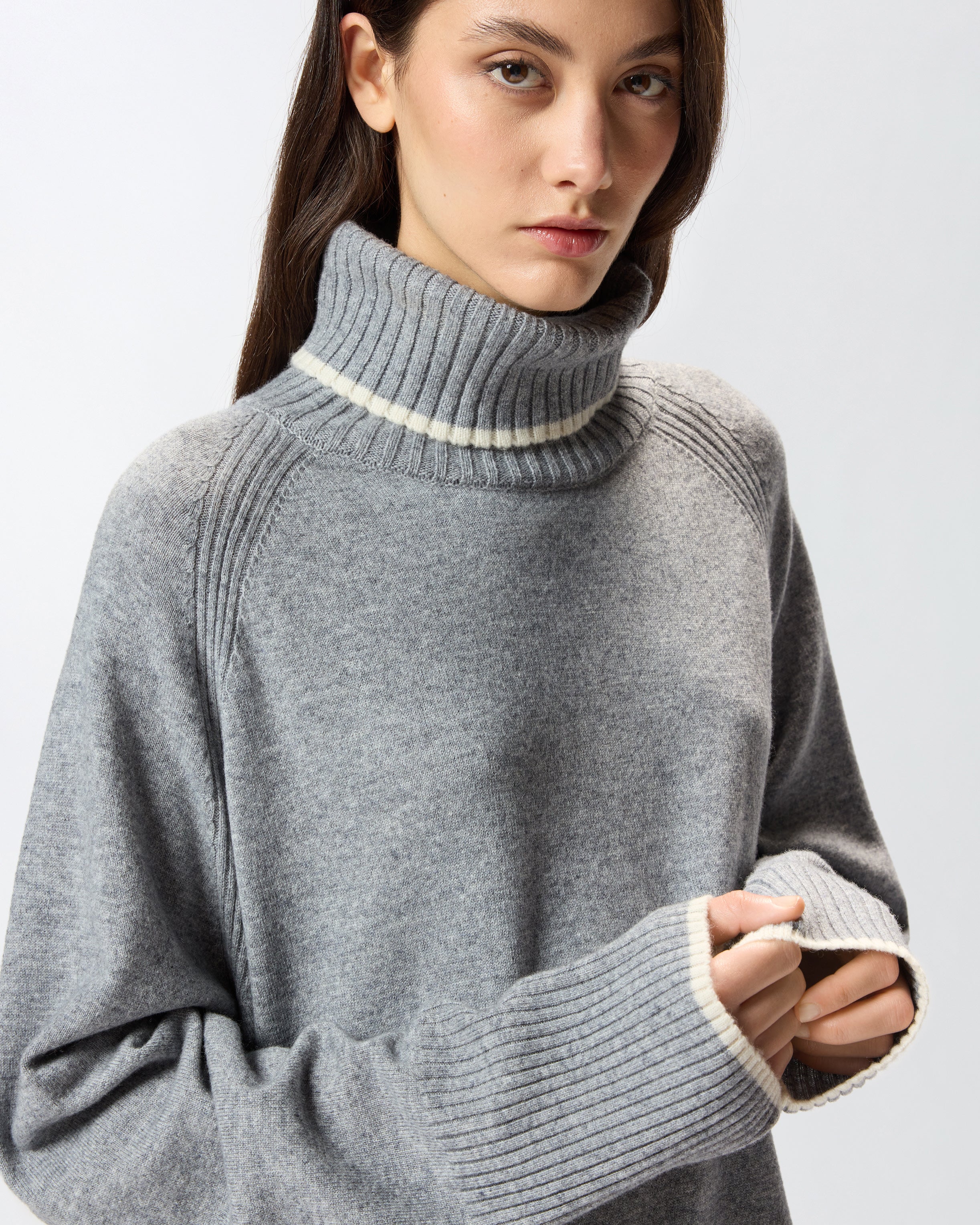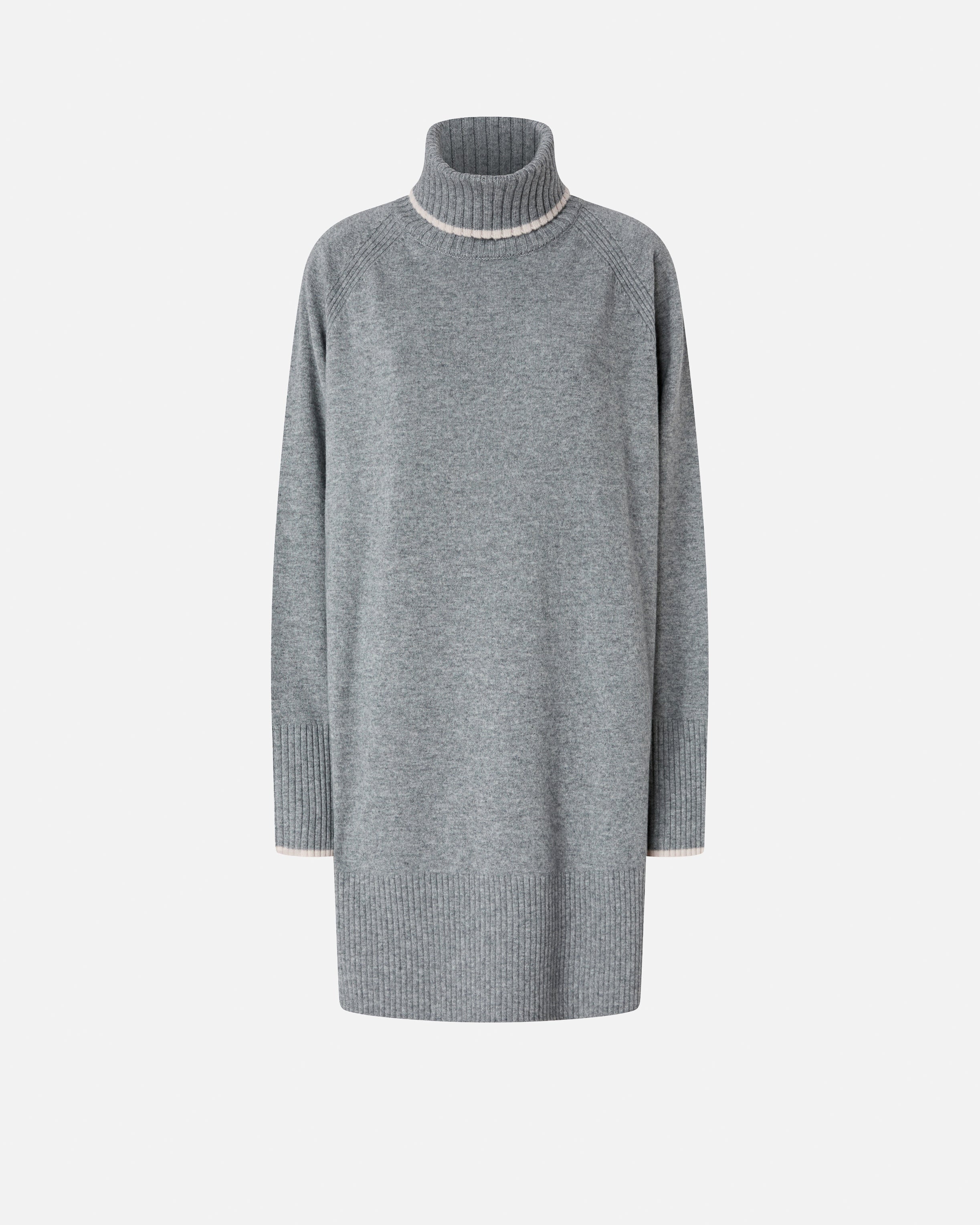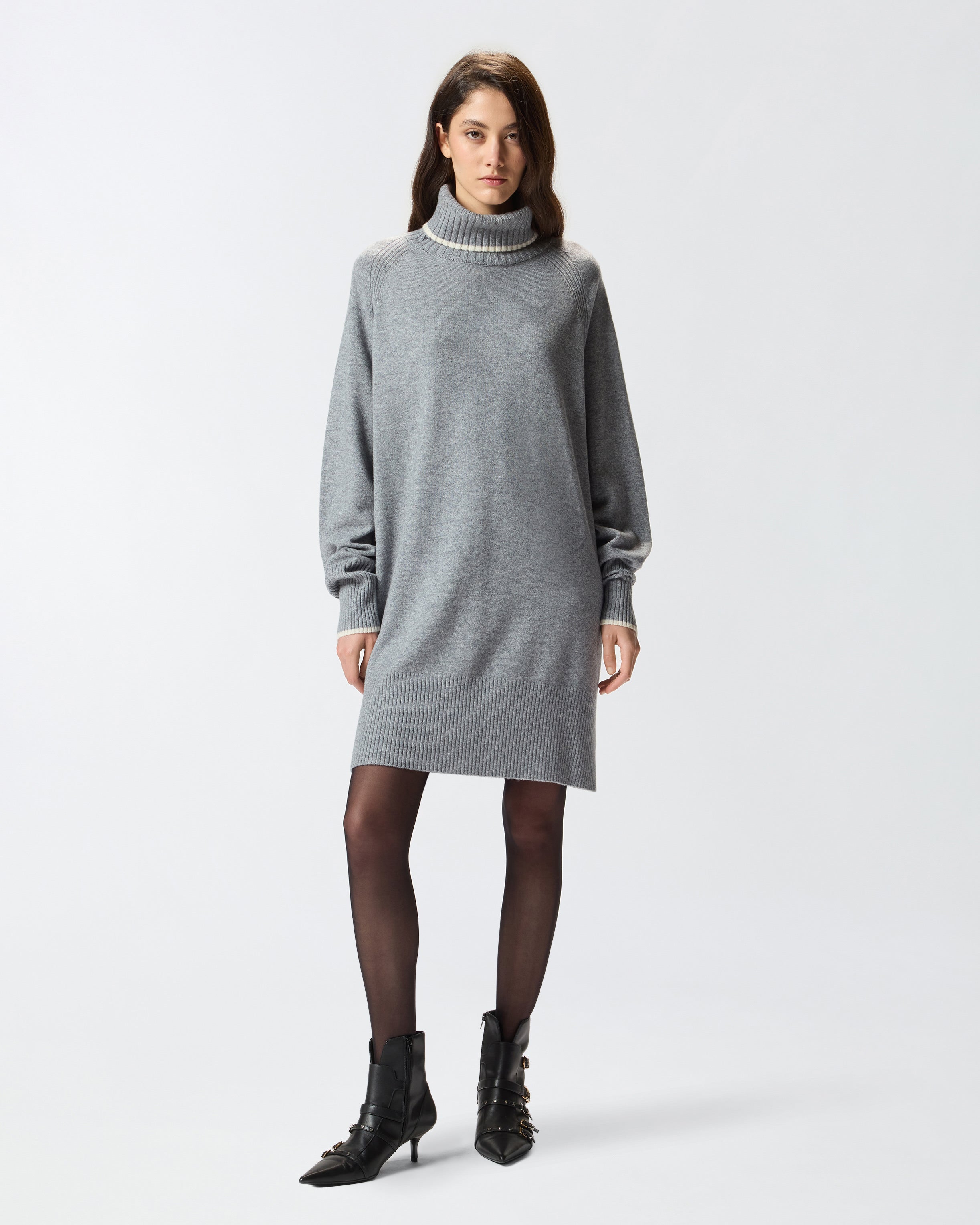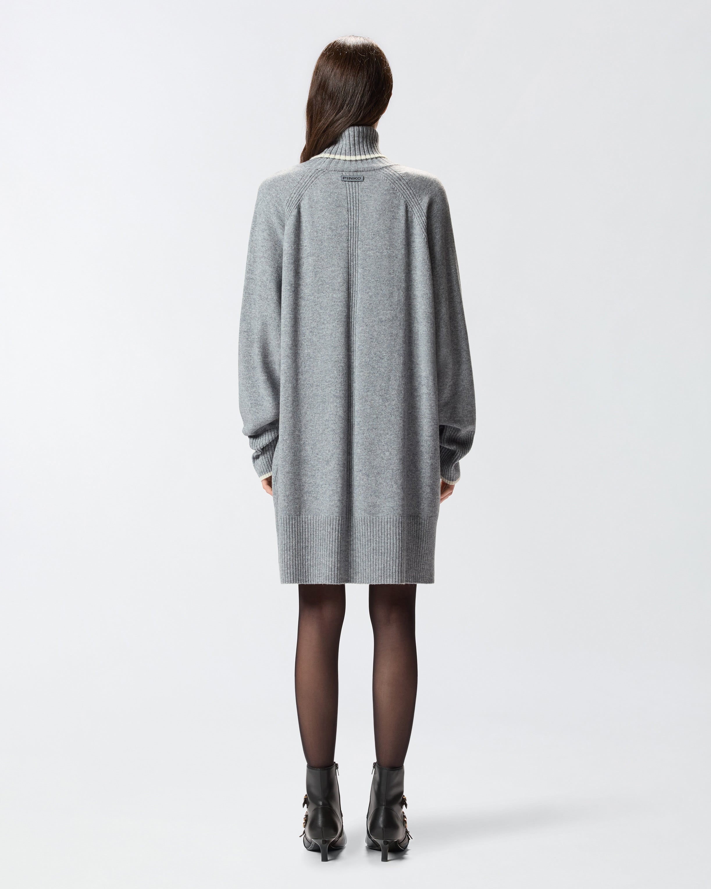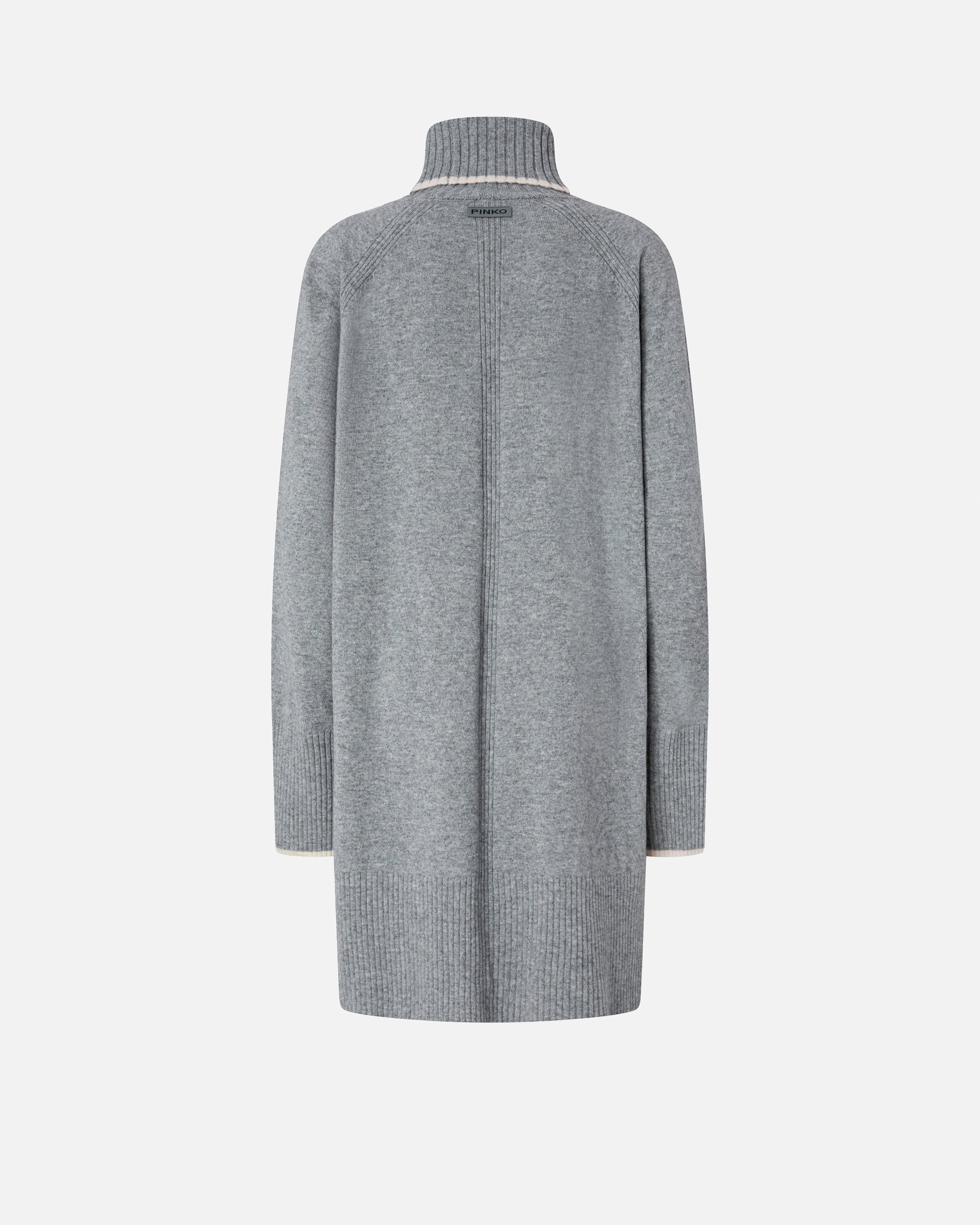 Abito corto dalla silhouette ampia in soffice maglia di misto lana merino e cashmere con orli a contrasto in corrispondenza delle maniche lunghe e del collo stile dolcevita. Il capo è stato sottoposto a prove di finissaggio per ridurre al minimo la possibile formazione di pilling, garantendo una maggiore morbidezza e durabilità del tessuto. Collo, orlo e polsini sono lavorati a coste, mentre il tocco finale è dato dall'etichetta tono su tono con logo lettering PINKO dietro al collo.