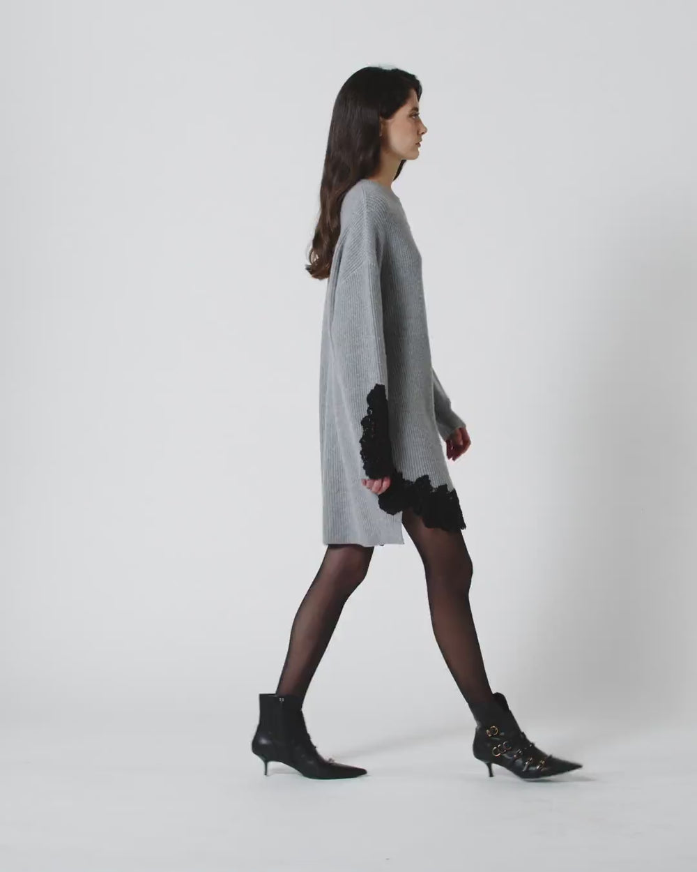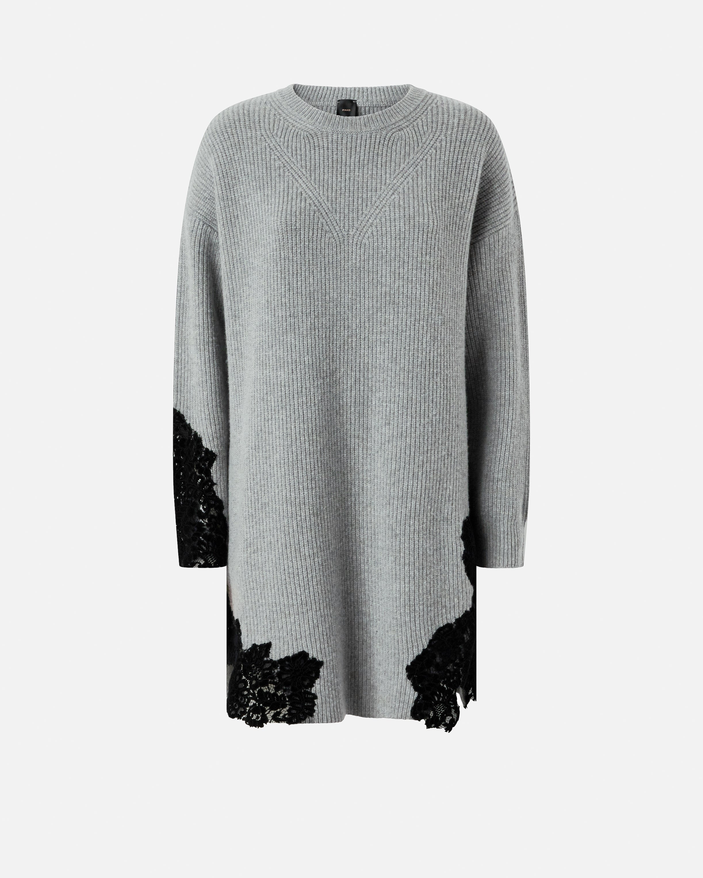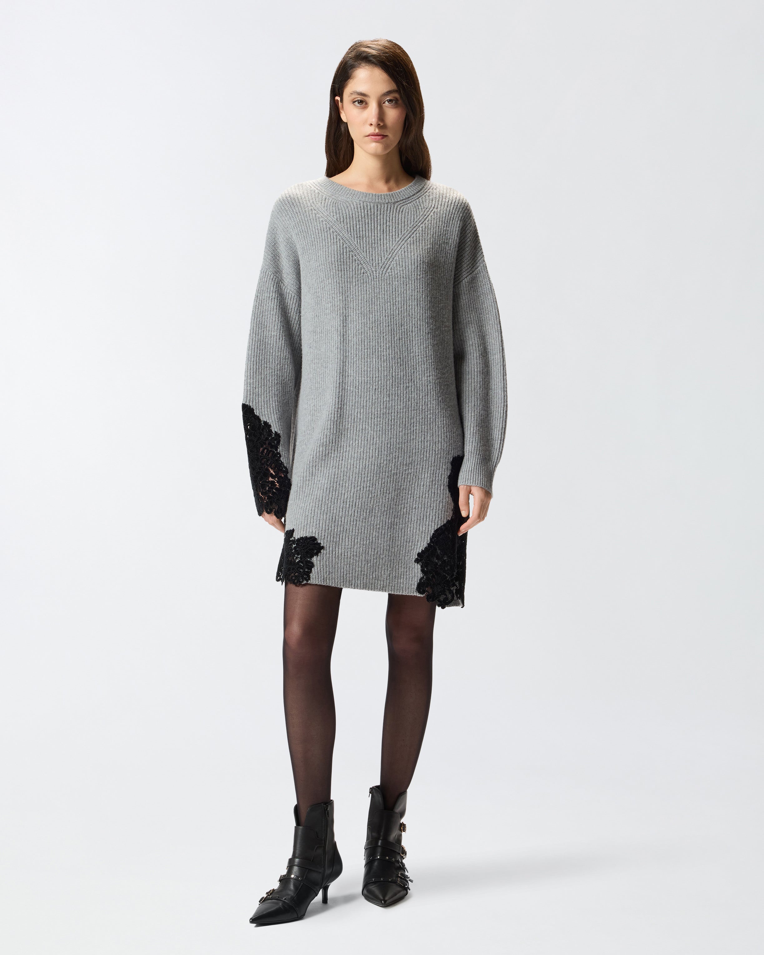 Abito corto in maglia di misto lana lavorata a costa inglese: un filato che offre un equilibrio perfetto tra comfort e morbidezza. Il dettaglio che impreziosisce il design è l’intarsio realizzato a mano con pizzo floccato su una manica e sull'orlo. Il capo è stato sottoposto a prove di finissaggio per ridurre al minimo la possibile formazione di pilling, garantendo una maggiore morbidezza e durabilità del tessuto. Il tocco finale è dato dall'etichetta tono su tono con logo lettering PINKO dietro al collo. Aggiungi questo design al guardaroba per donare un twist ai tuoi outfit invernali.
