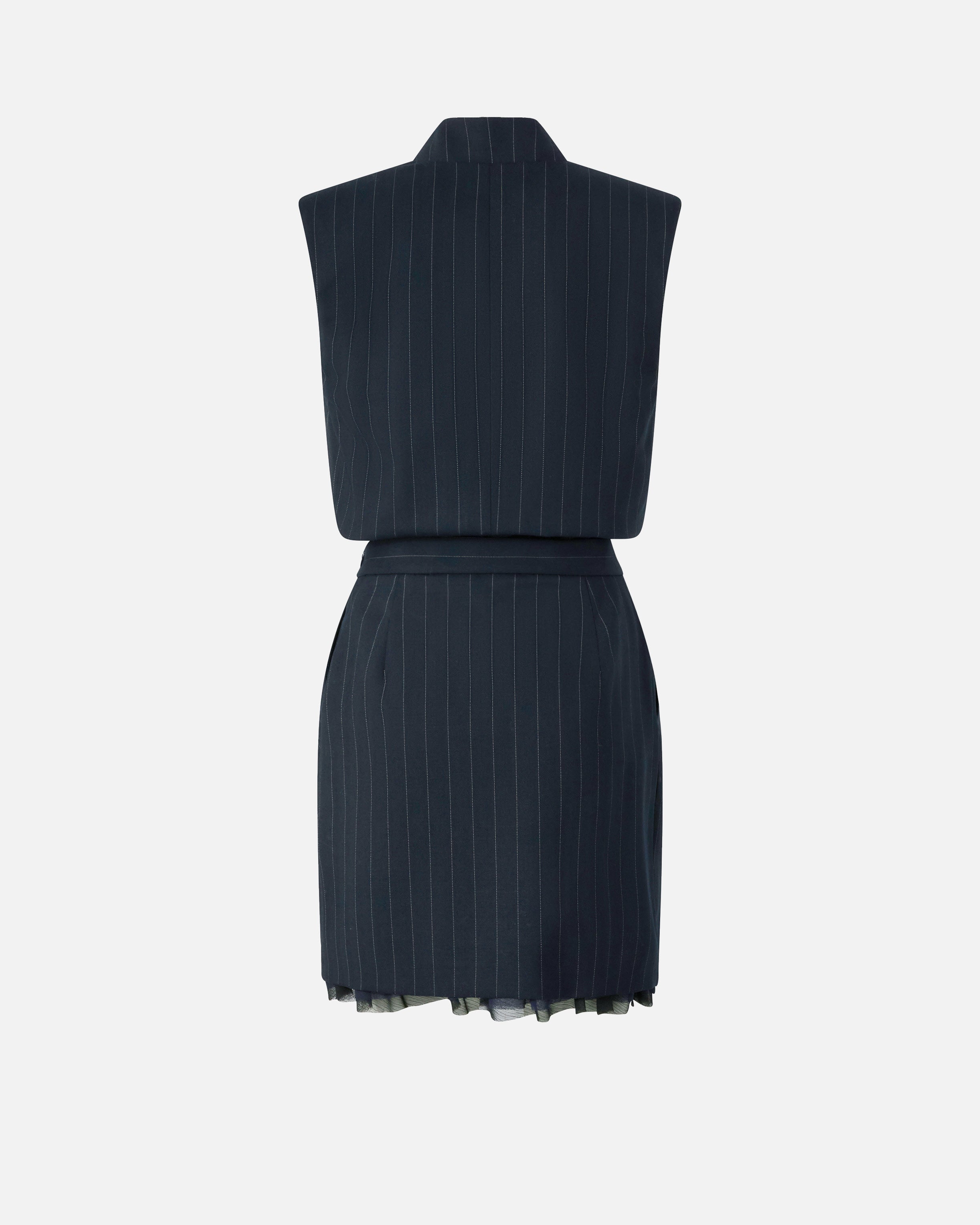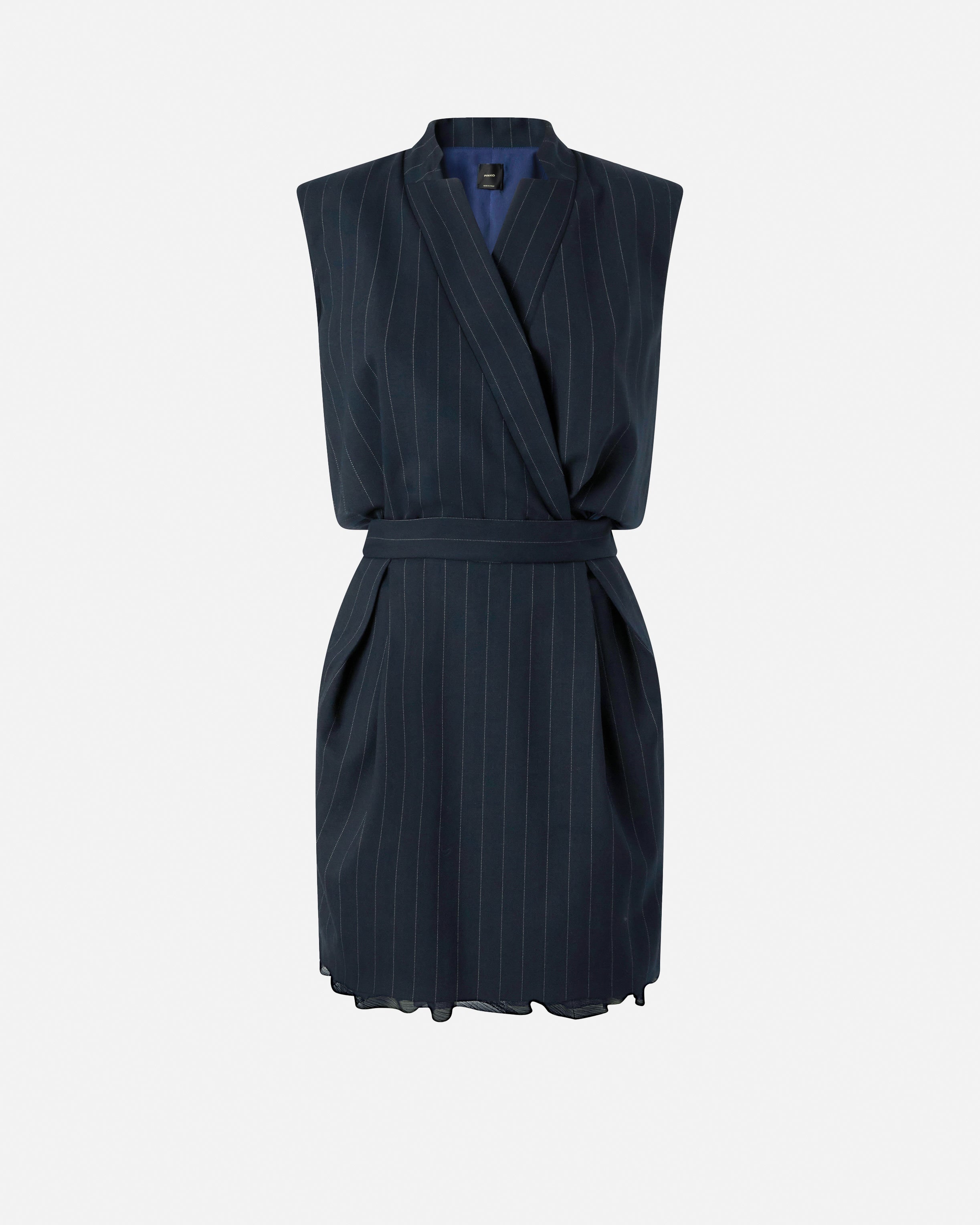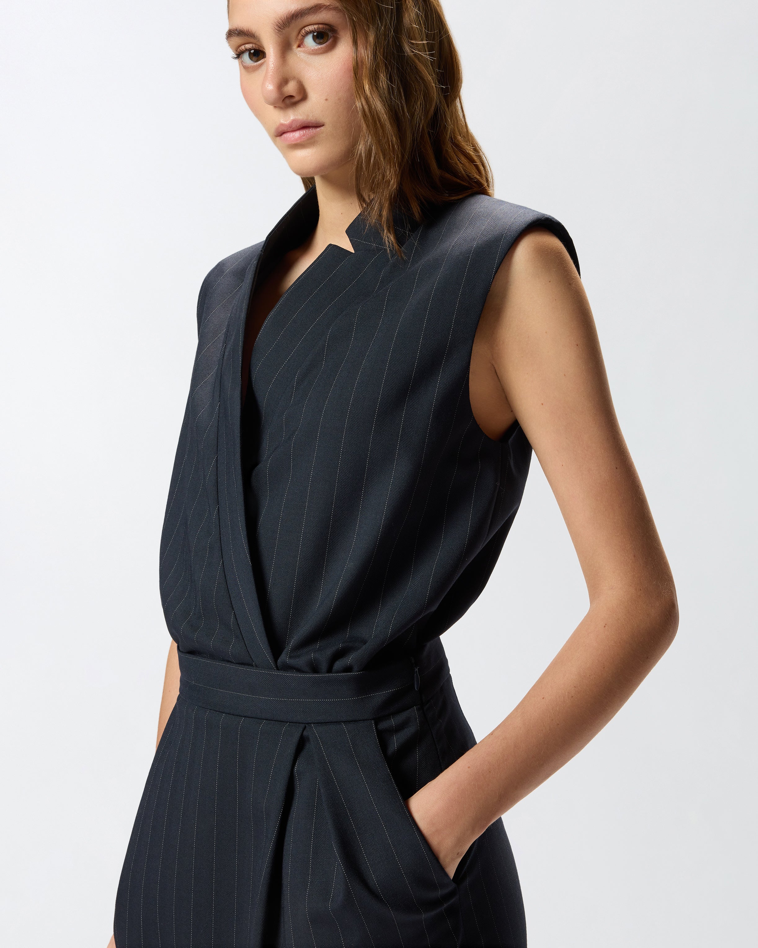 Abito corto senza maniche realizzato in un resistente tessuto di lana poly che previene la sgualcitura e caratterizzato da una particolare armatura a doppia resca che sottolinea il motivo gessato. Il vestito presenta un design a portafoglio con collo a revers, cintura in vita per sottolineare la silhouette e gonna a palloncino con doppia balza tagliata a vivo per donare un tocco di femminilità, in contrasto con il rigore del tessuto. Modello foderato.