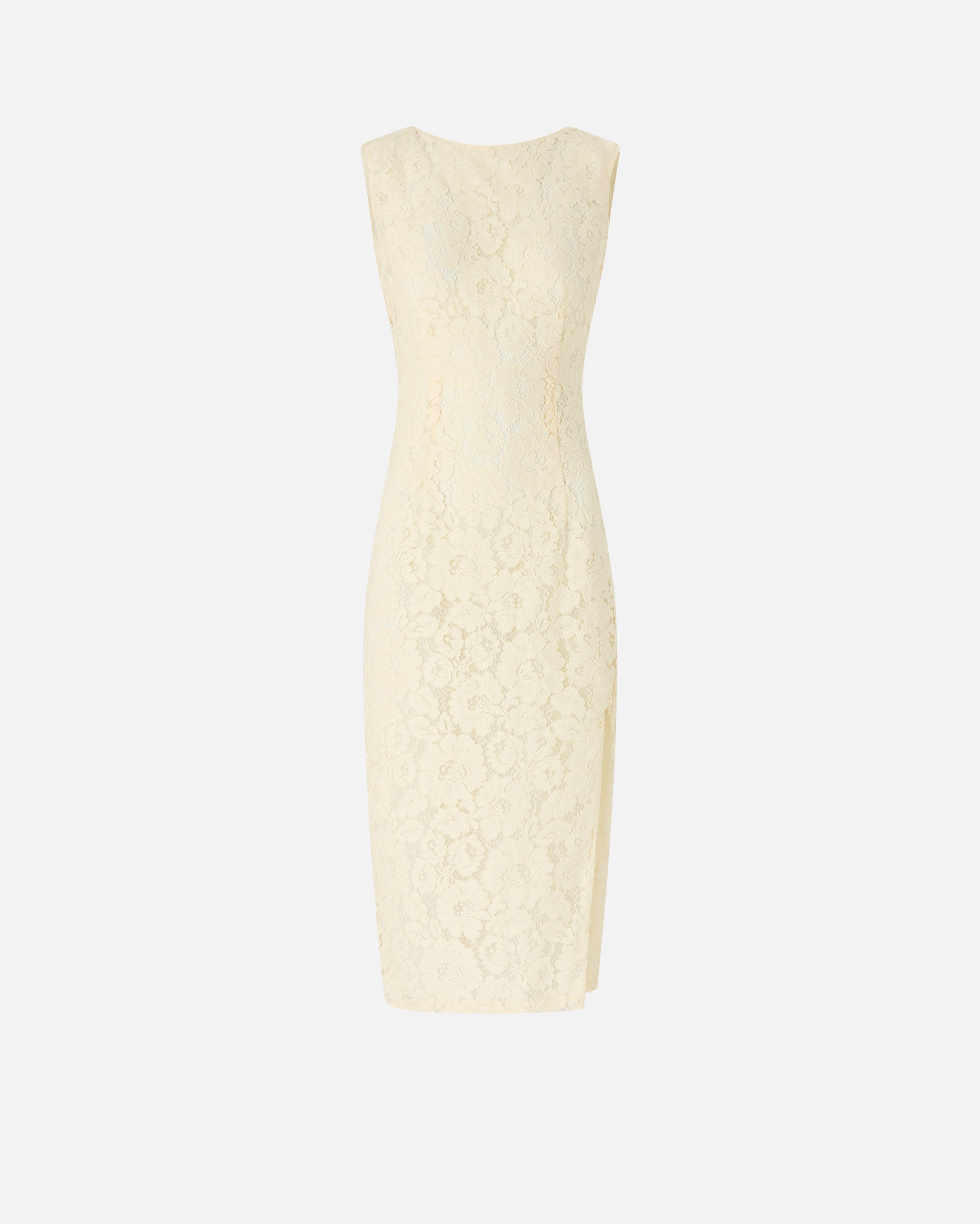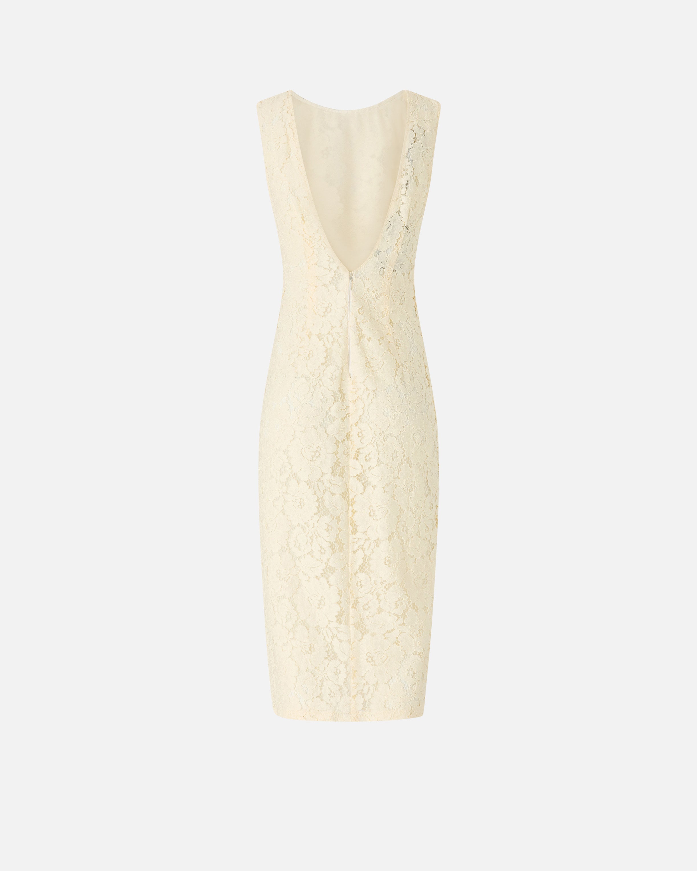 Abito dalla linea aderente caratterizzato da un design smanicato con scollo a barchetta sul davanti che si apre in un profondo scollo a V sul retro per un tocco di raffinata sensualità. La protagonista indiscussa del modello è però la lavorazione: un sofisticato pizzo rebrodé con ricchi motivi floreali ricamati in modo tale da risultare tridimensionali, per un effetto finale scenografico e seducente. Il capo, dotato di una comoda zip sul retro e di una fodera interna che facilita l'indosso, è rifinito inoltre da uno sfondo piega sul retro che dona profondità e da uno spacco laterale sul davanti che conferisce ulteriore fascino. Questo vestito elegante è perfetto per essere indossato nelle occasioni speciali, sia come outfit da sera sia come look da cerimonia.