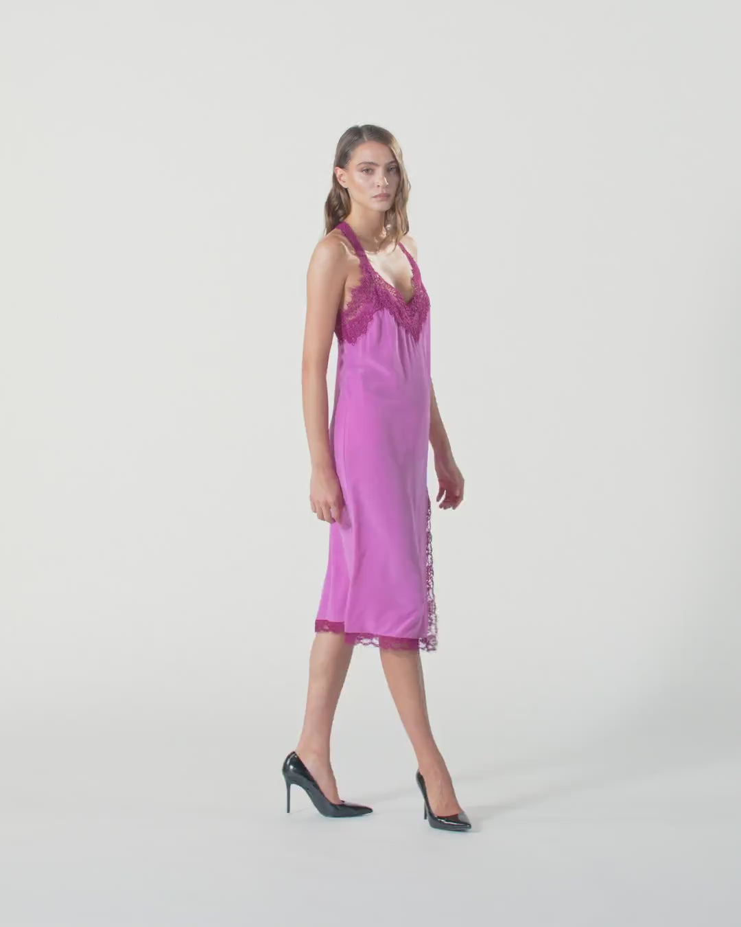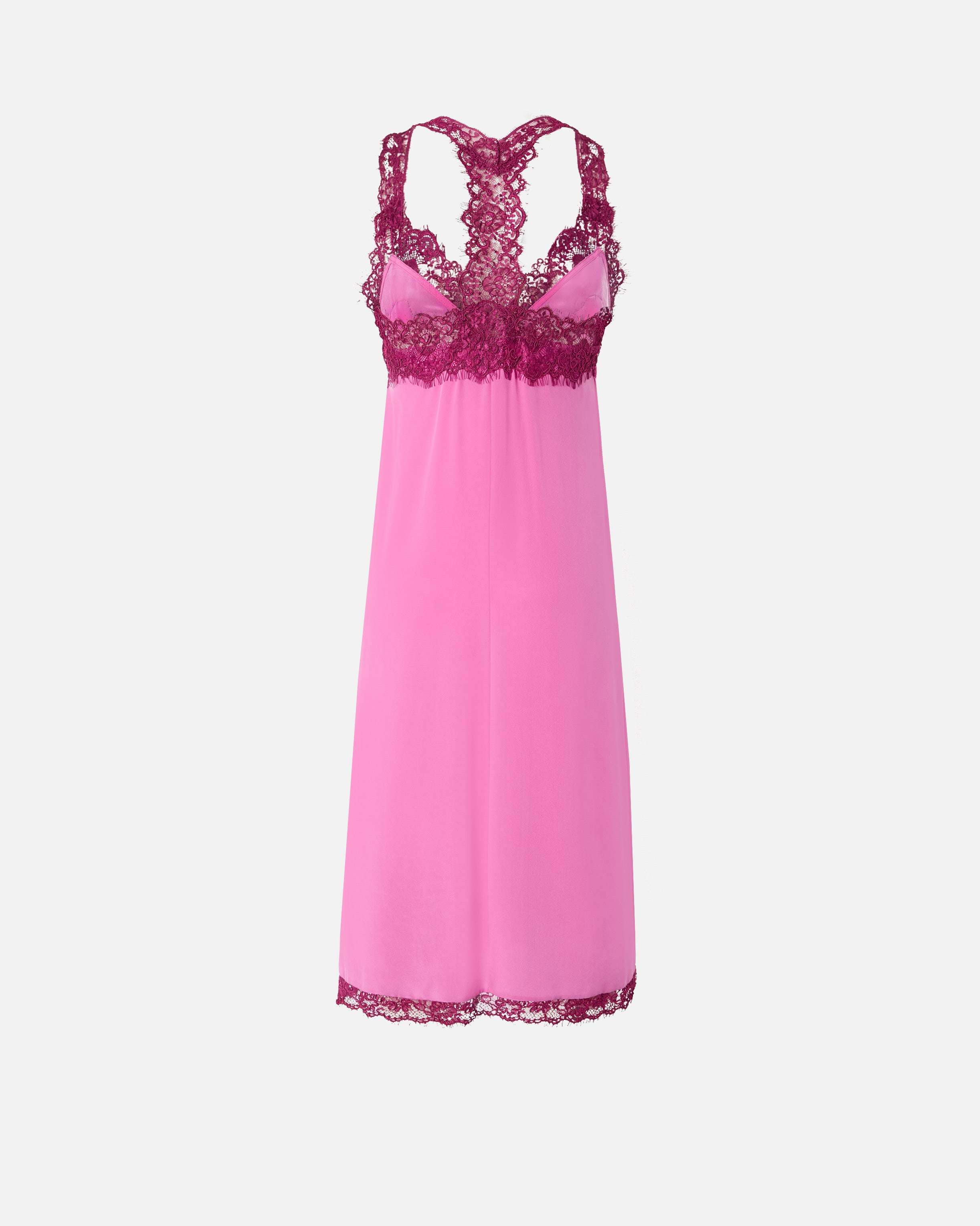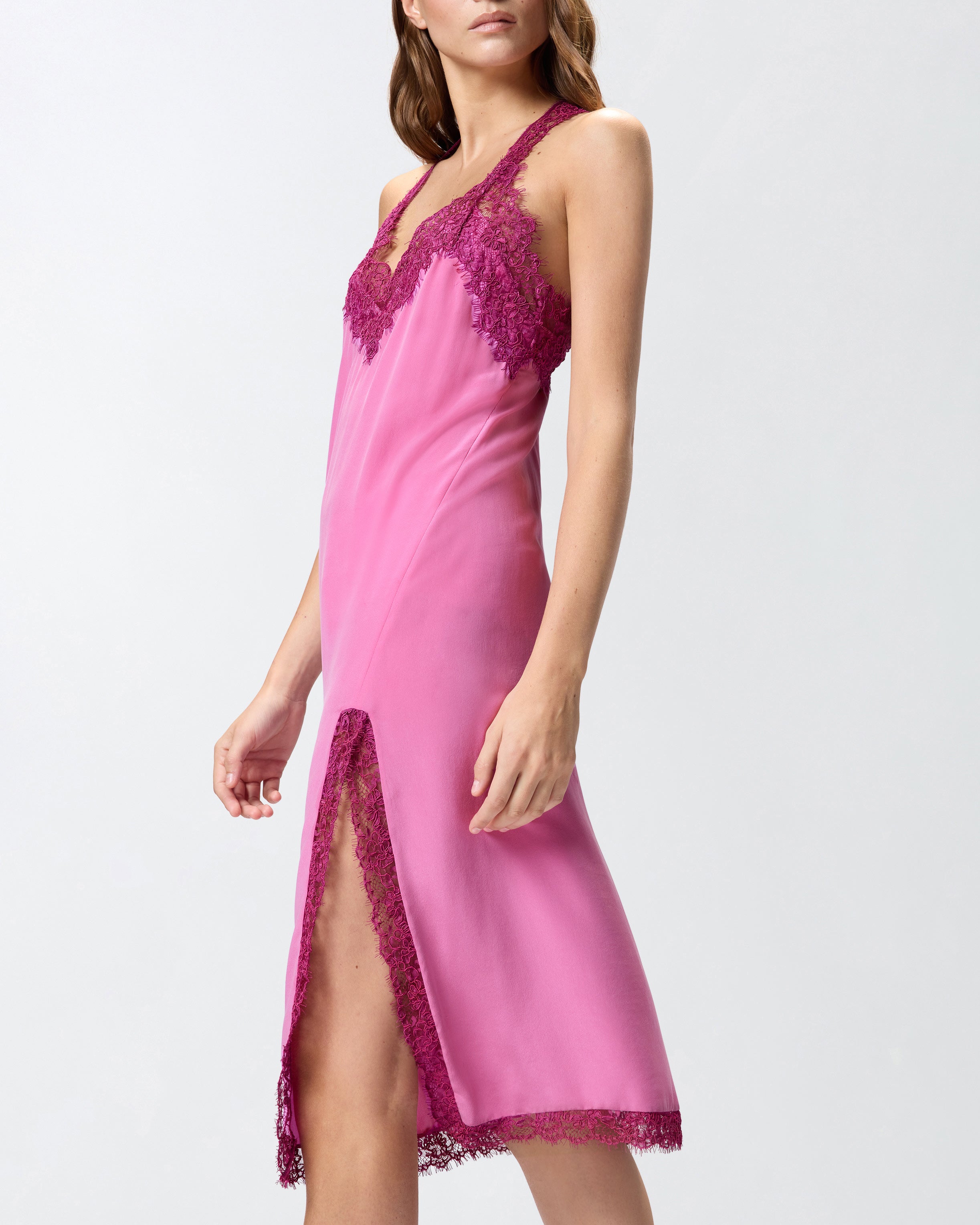 Abito lungo in stile lingerie realizzato in crêpe de Chine di seta. Il modello è profilato da dettagli in pizzo rebrodè sul fondo, sullo spacco diagonale sul davanti e sulle spalline che si incrociano sul retro formando una maxi spallina. Il capo offre una vestibilità morbida, perfetta per non rinunciare alla comodità. Quest'abito è tanto elegante quanto versatile: indossalo con un paio di ballerine per un look da giorno, eleva il tuo stile da serata speciale con un paio di tacchi alti.
