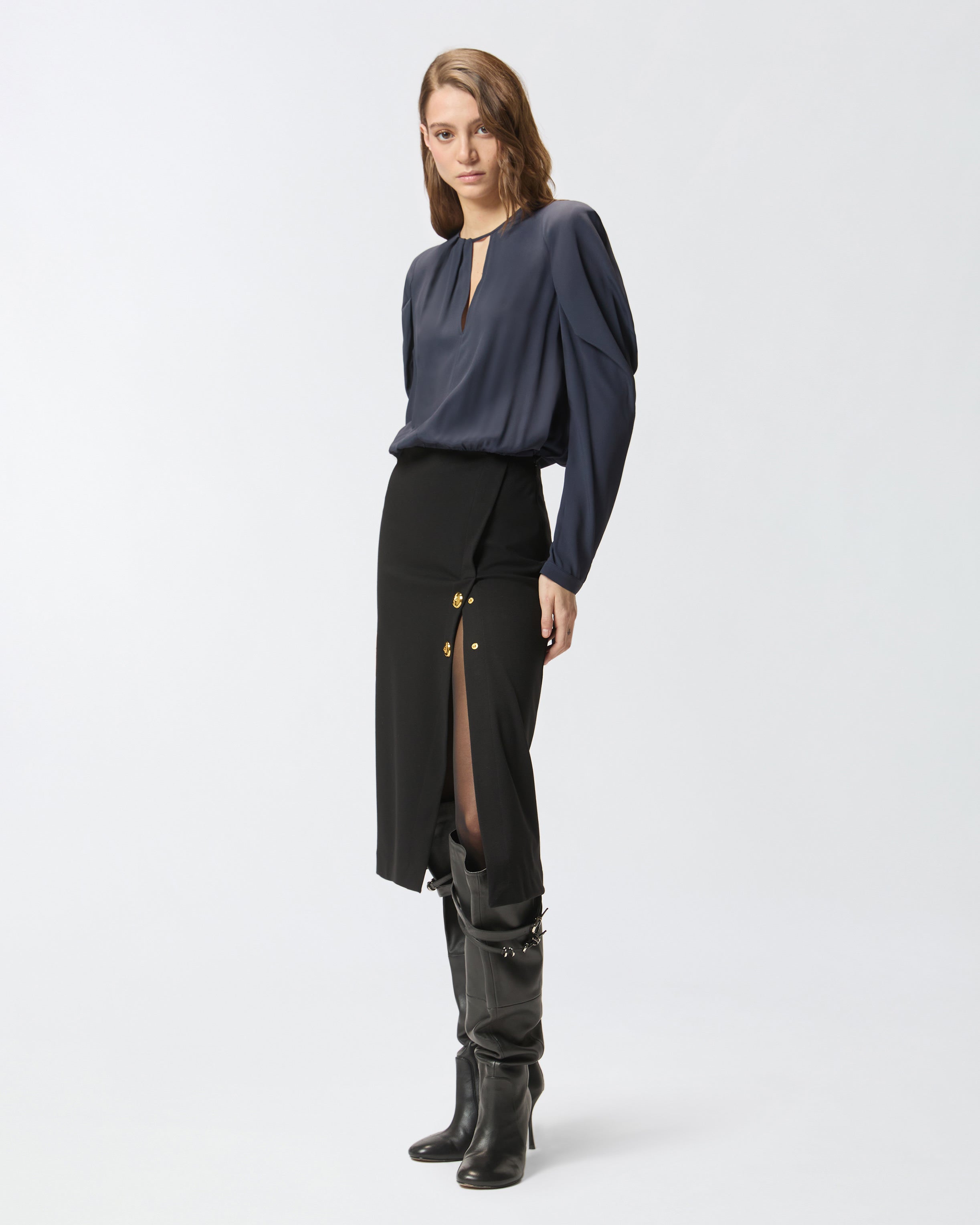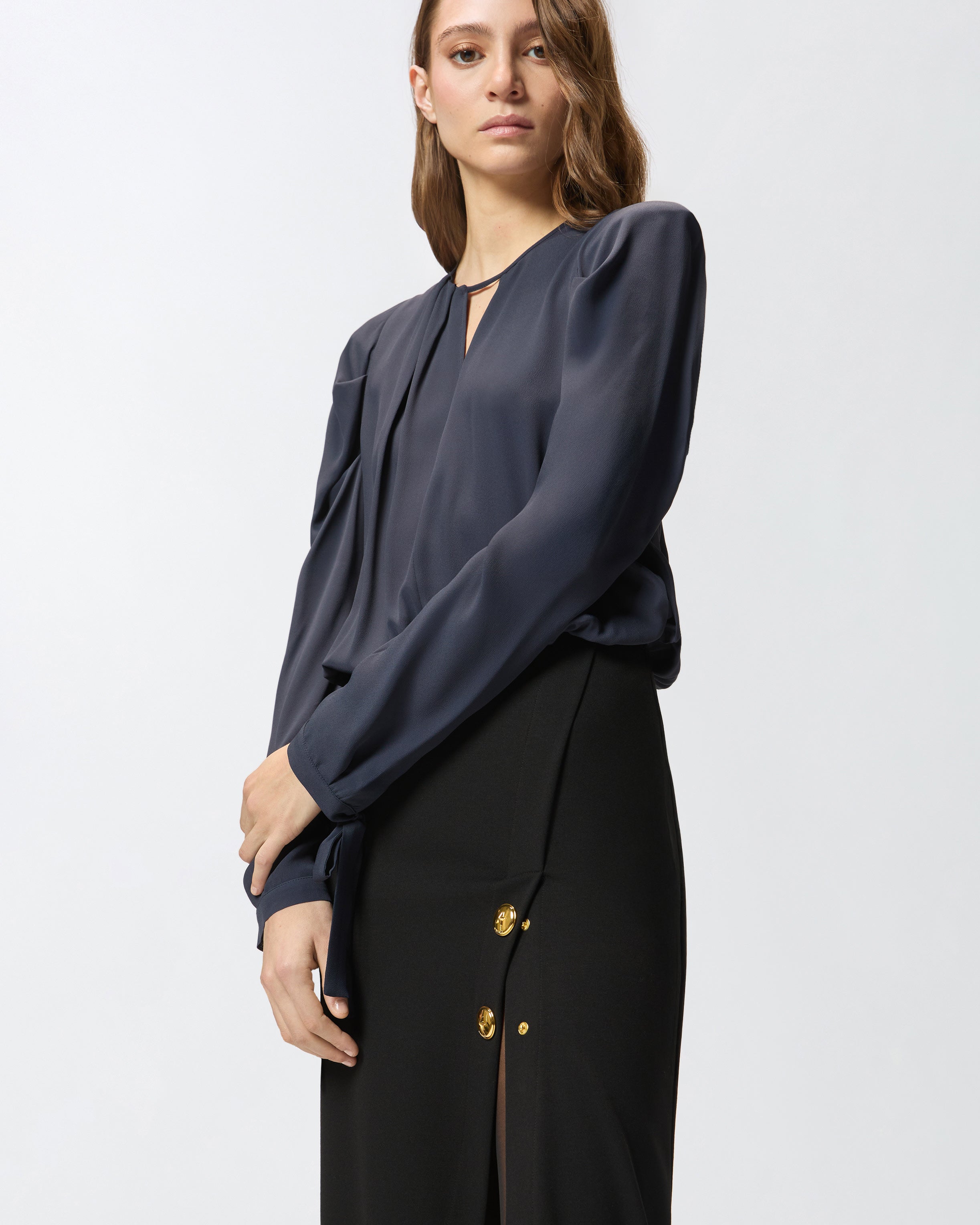 Abito longuette con gonna a tubino, girocollo definito da una profonda apertura a V sul davanti, e maniche lunghe drappeggiate completate da morbidi nastri da annodare al fondo. Il capo presenta una costruzione bimateriale, che combina un misto seta fluido per la parte superiore, a un tessuto tecnico di viscosa stretch lavorato a punto stoffa per la gonna. Il davanti è scandito inoltre da bottoni metallici decorati da stella. Il modello presenta una vestibilità sfiancata, più aderente sui fianchi. Chiusura a goccia sul retro del collo e con zip sul fianco della gonna. Perfetto come outfit elegante per una serata speciale o per un look da tutti i giorni dove il dress code richiama raffinatezza.