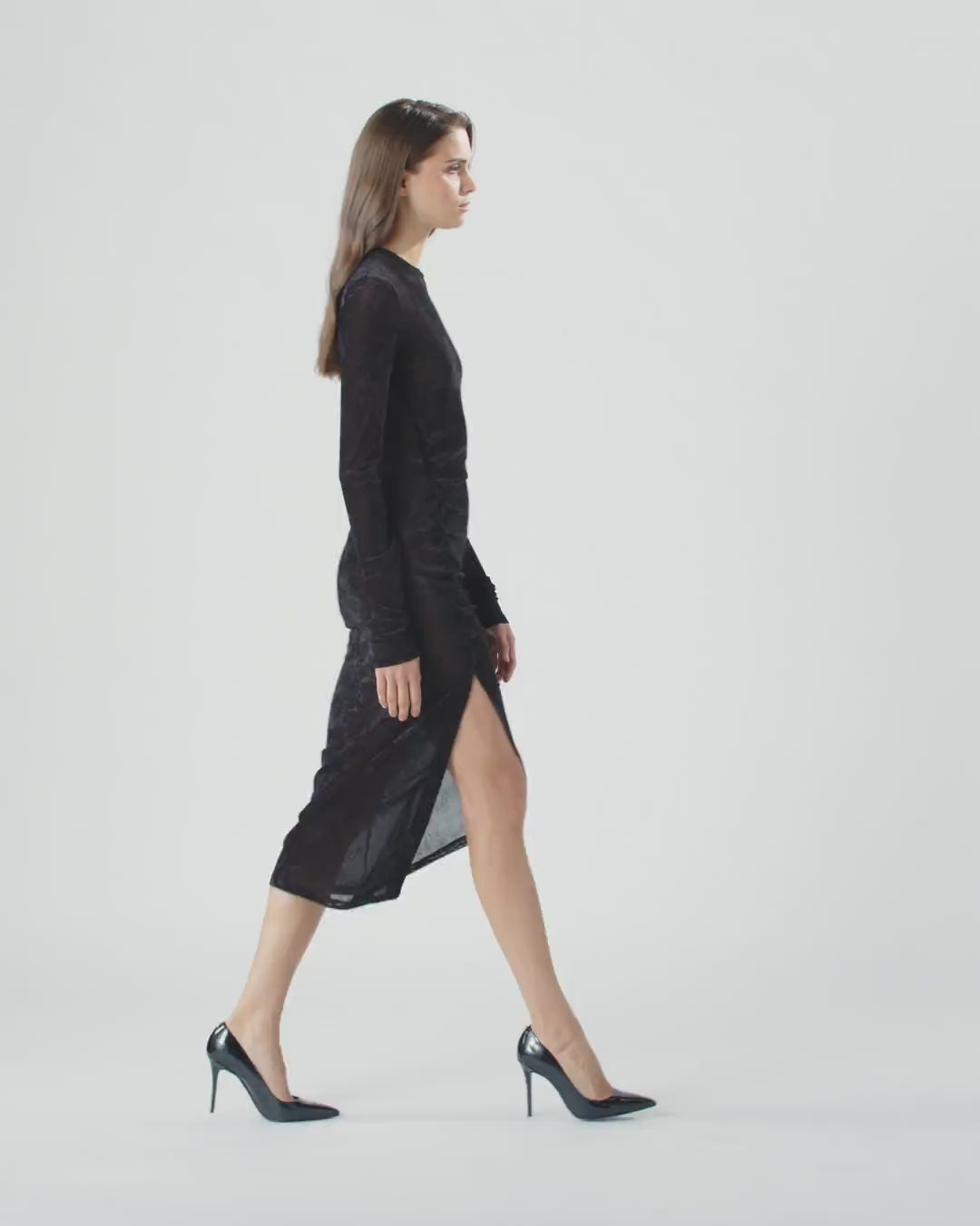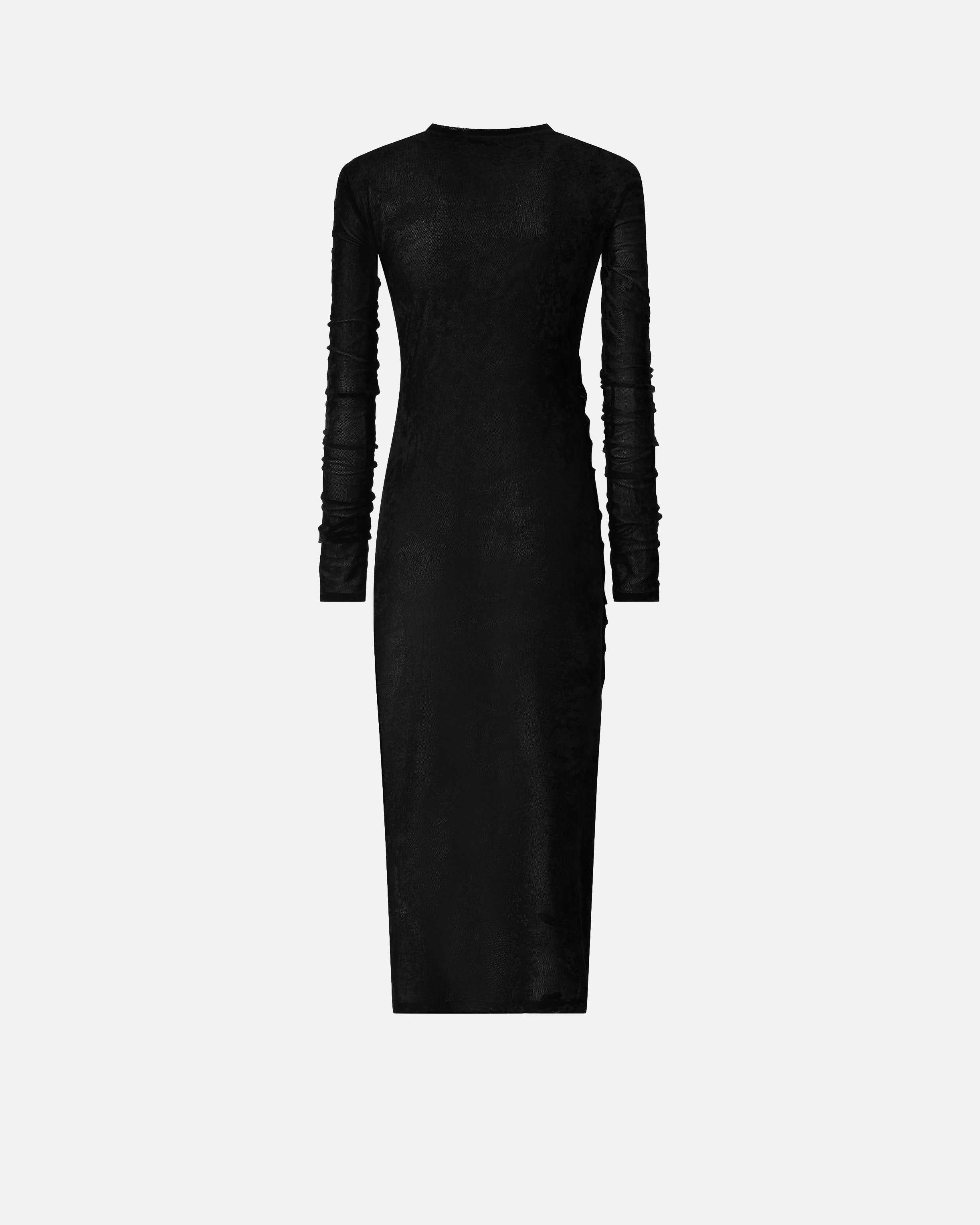 Abito lungo girocollo a maniche lunghe dalla vestibilità aderente e realizzato in tulle a retina super stretch. La lavorazione a cui è sottoposto il capo conferisce al tessuto l’aspetto di un velluto martellato, mantenendo il comfort e l’elasticità del tulle. L’abbottonatura che crea un motivo di pieghe a lato e lo spacco generoso sulle gambe elevano l'essenzialità del design facendo la differenza: diventa la star indiscussa della serata con un vero e proprio look da red carpet.