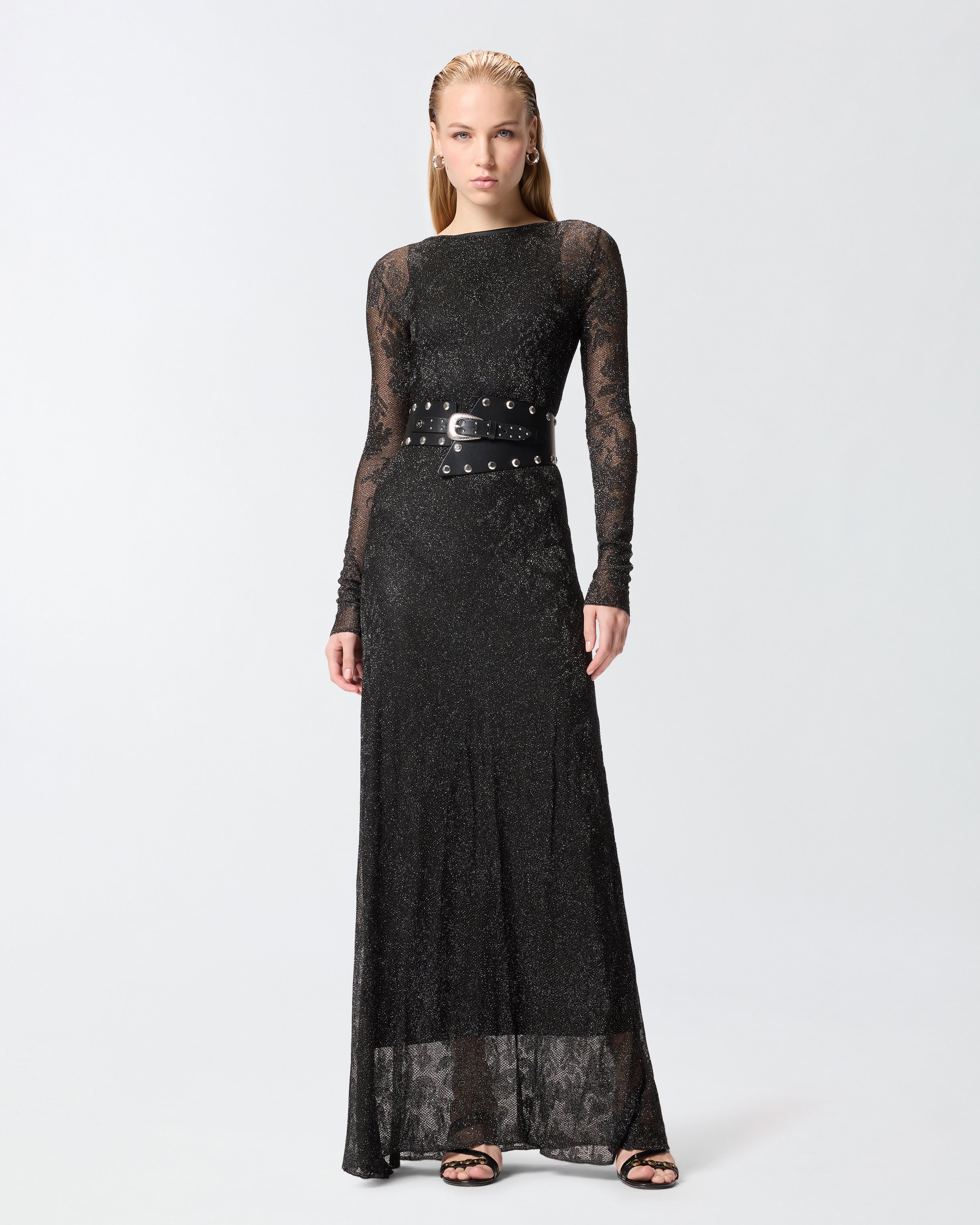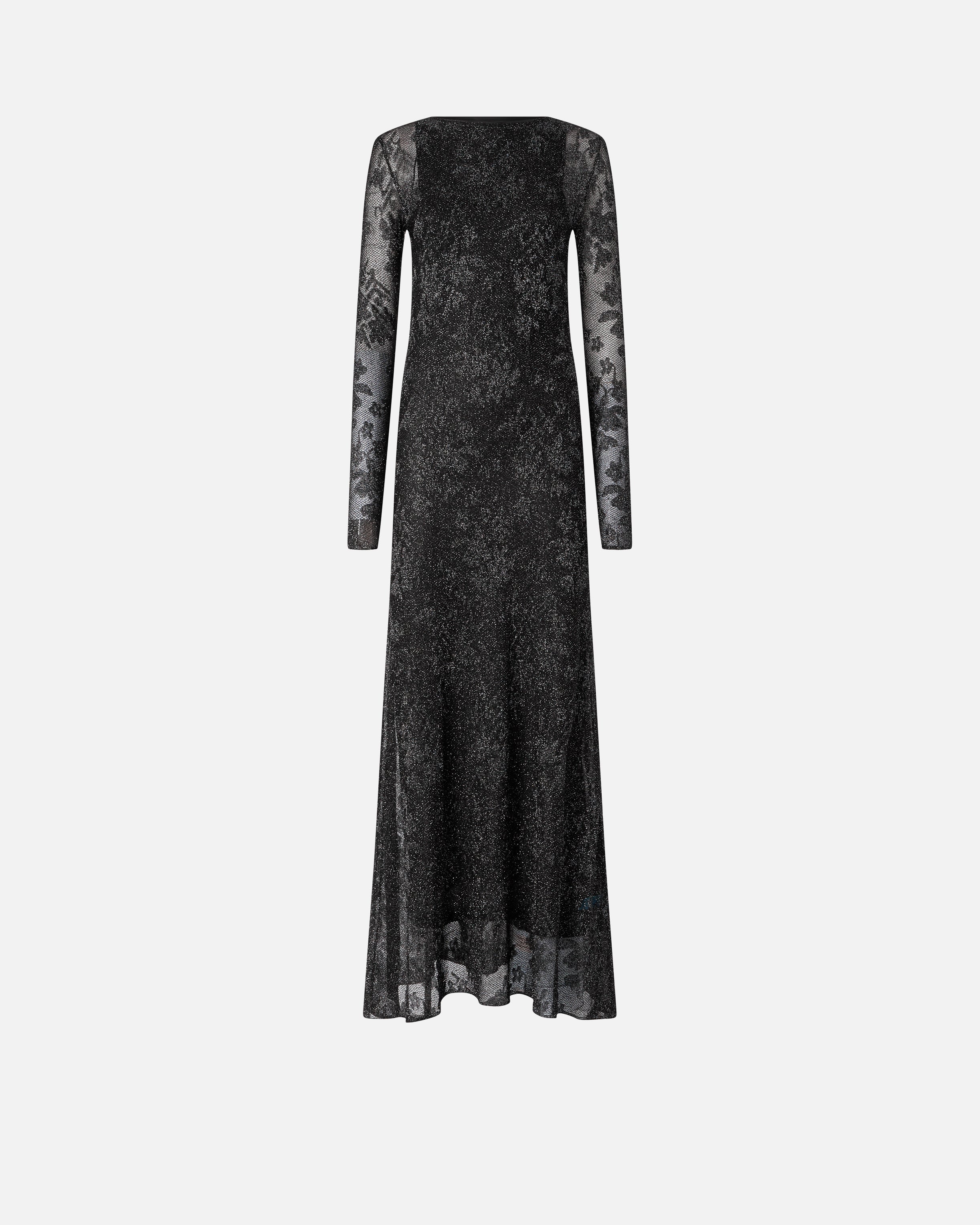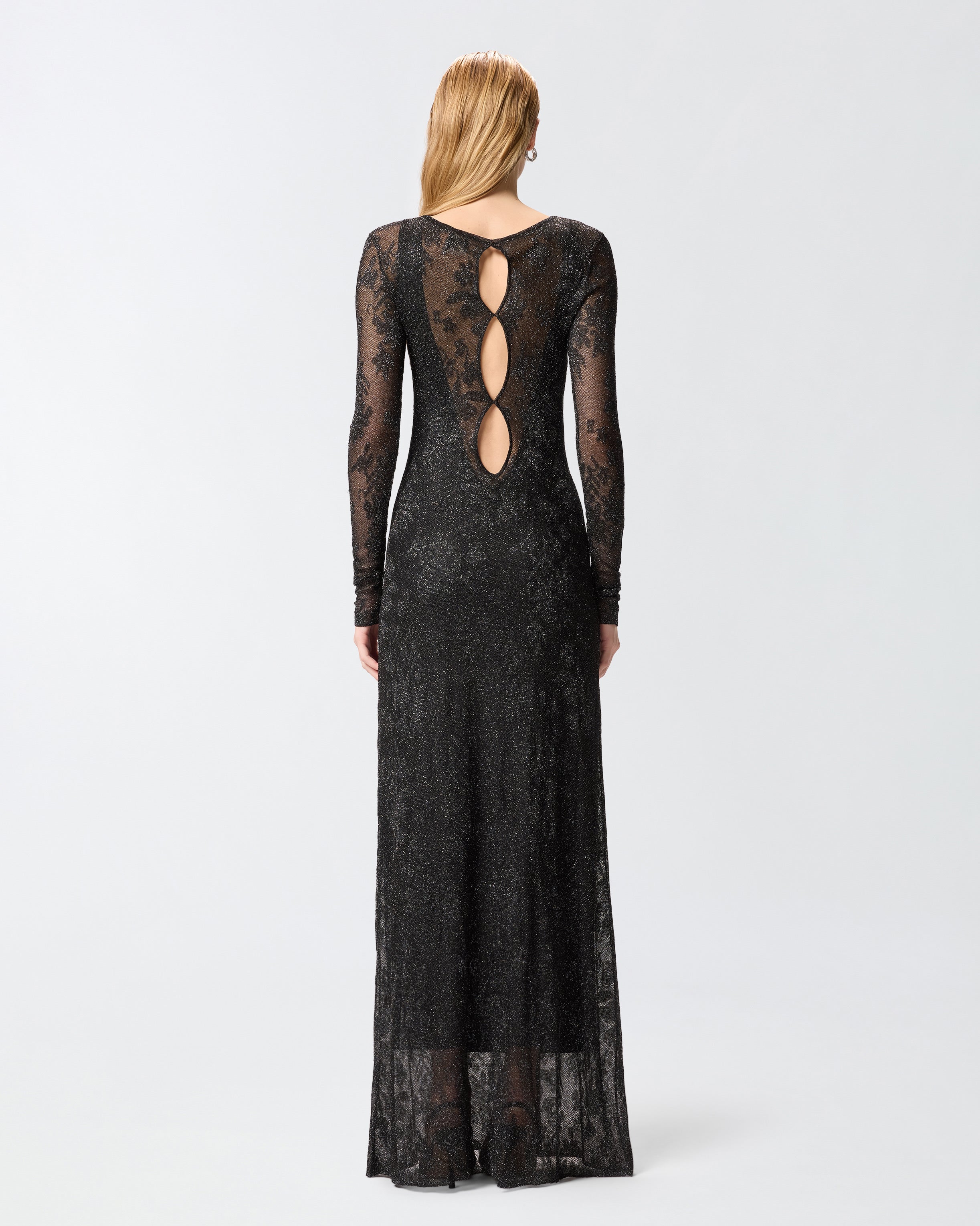 Abito lungo con parte superiore più aderente e gonna morbida, leggermente svasata al fondo. Il modello mostra una ricchezza di dettagli e lavorazioni senza pari: alla fodera interna smanicata con profondo scollo sul retro, pensata per bilanciare le trasparenze, è sovrapposto uno strato realizzato in un particolare tessuto jacquard a rete con fibra metallizzata, decorato da un disegno floreale in rilievo dal raffinato effetto pizzo. Questo rivestimento velato è completato da maniche lunghe, scollo leggermente a barchetta e tre cut-out out sul retro che lasciano intravedere la schiena scoperta: indossa il vestito con un paio di décolleté o di sandali alti per comporre look da sera preziosi e sensuali.