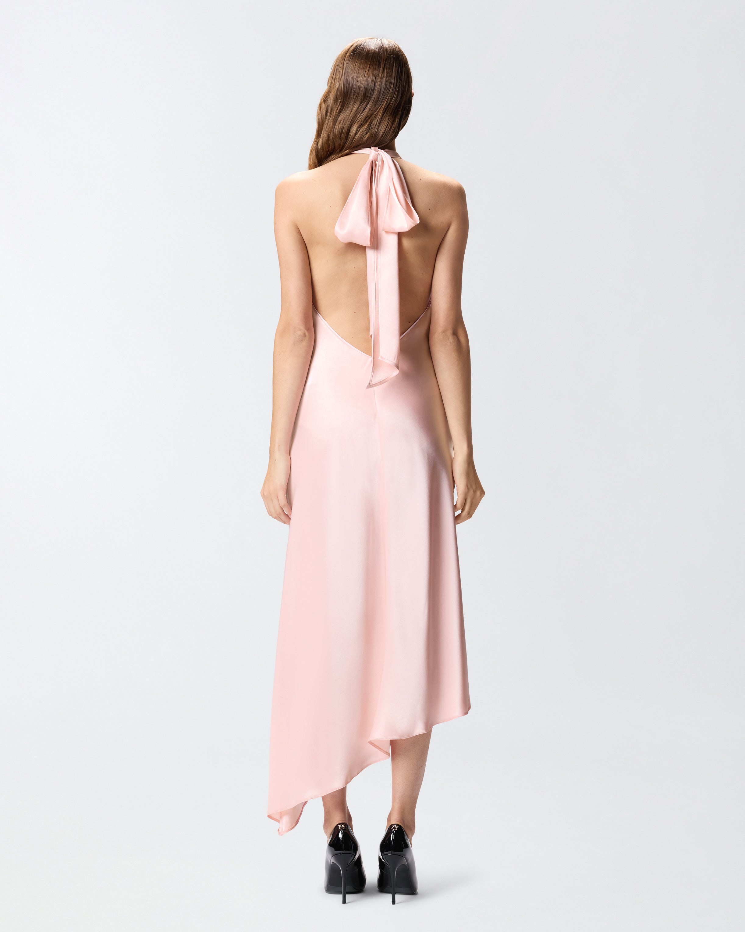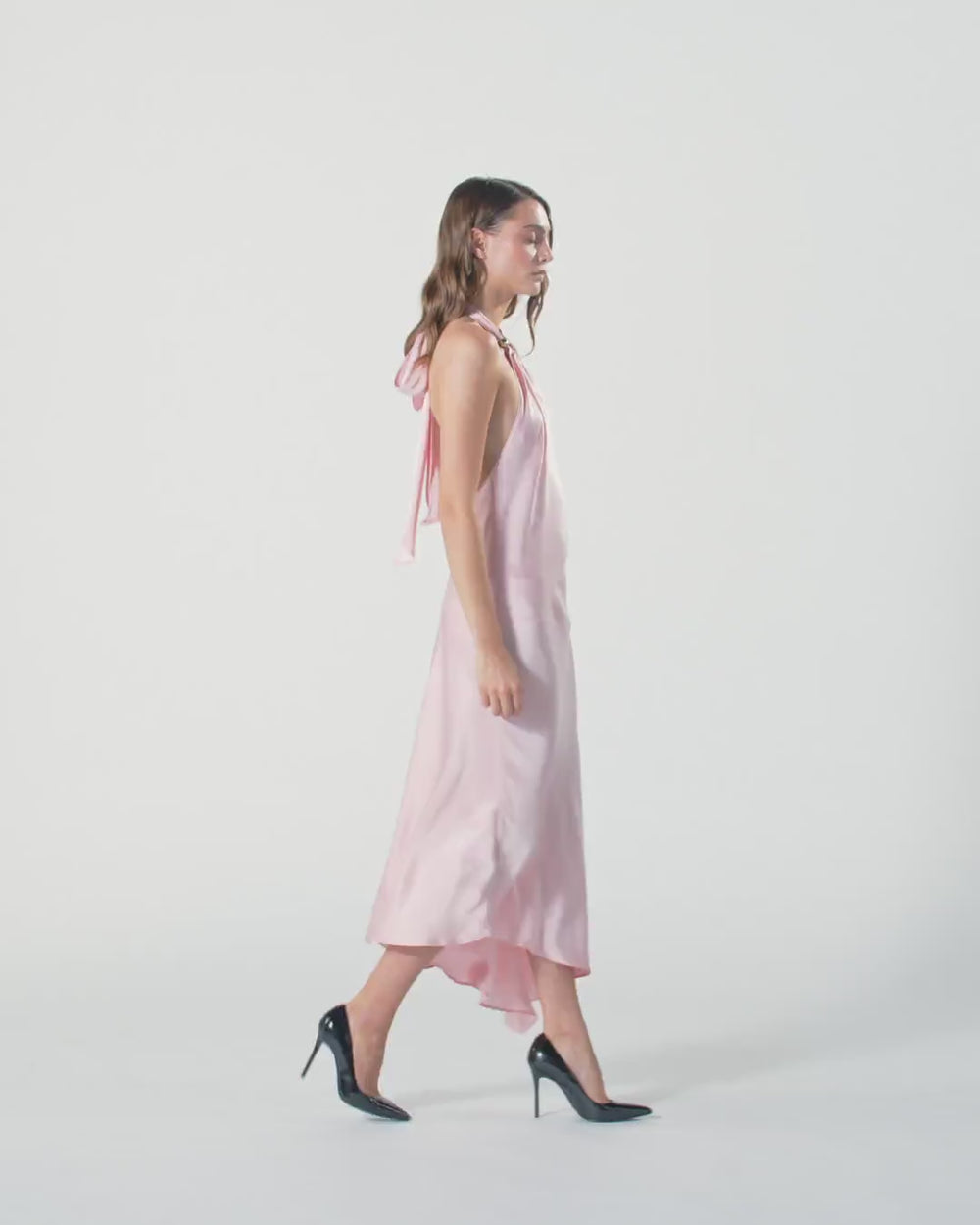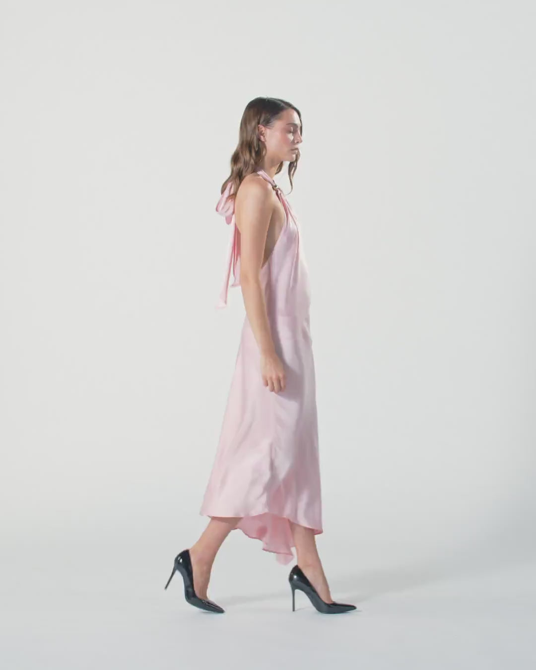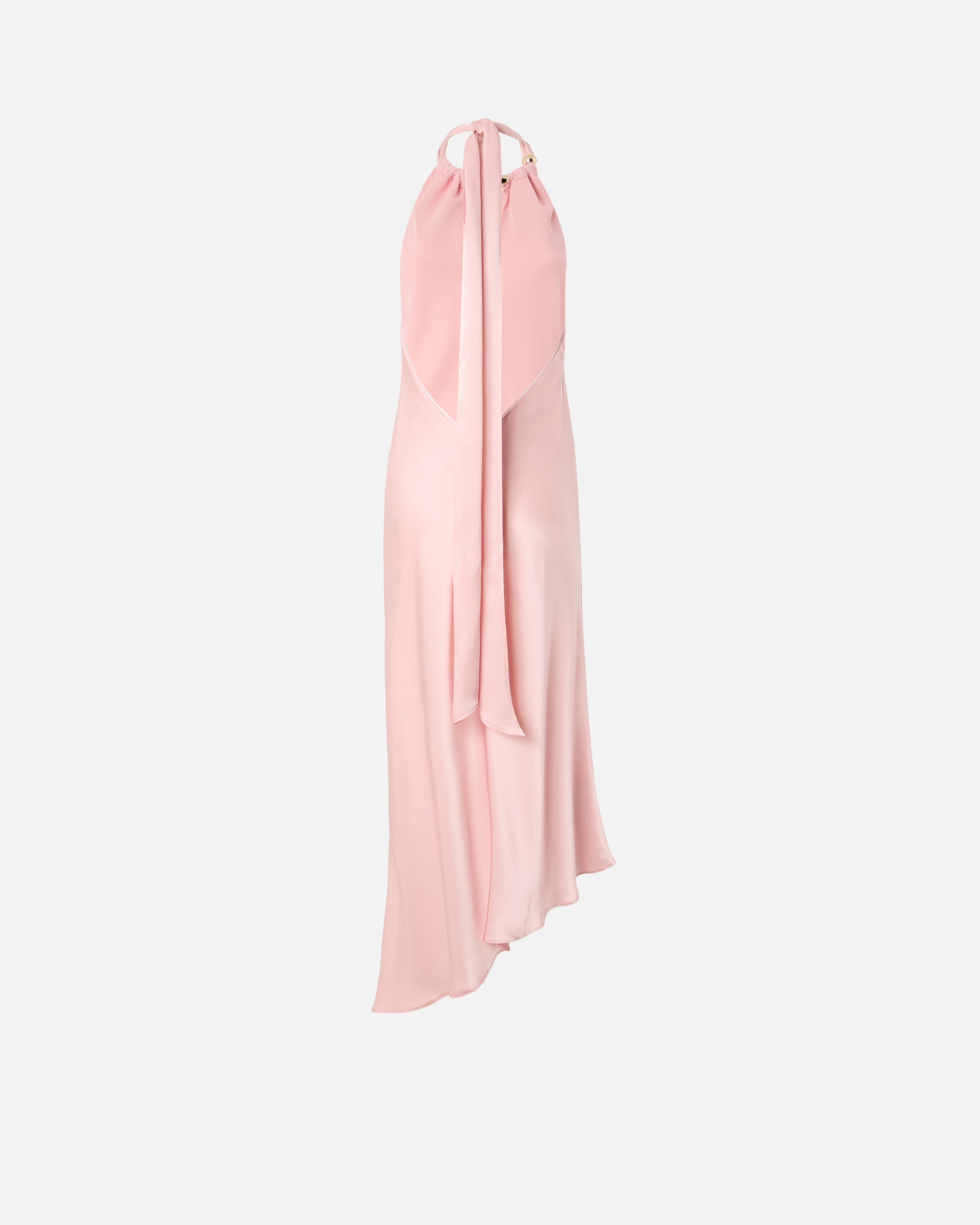 Abito lungo e aderente senza maniche, reso unico dall'orlo asimmetrico e impreziosito da boule in metallo in corrispondenza dello scollo all'americana. Un tocco di sensualità è dato dalla schiena scoperta accarezzata dal drappo legato al collo che cade libero regalando movimento. Il raso lucido conferisce una lucentezza unica e una mano particolarmente morbida al capo. Indossa questo design per un effetto fluido e scivolato che esalta con eleganza e raffinatezza le linee e la silhouette femminile.
