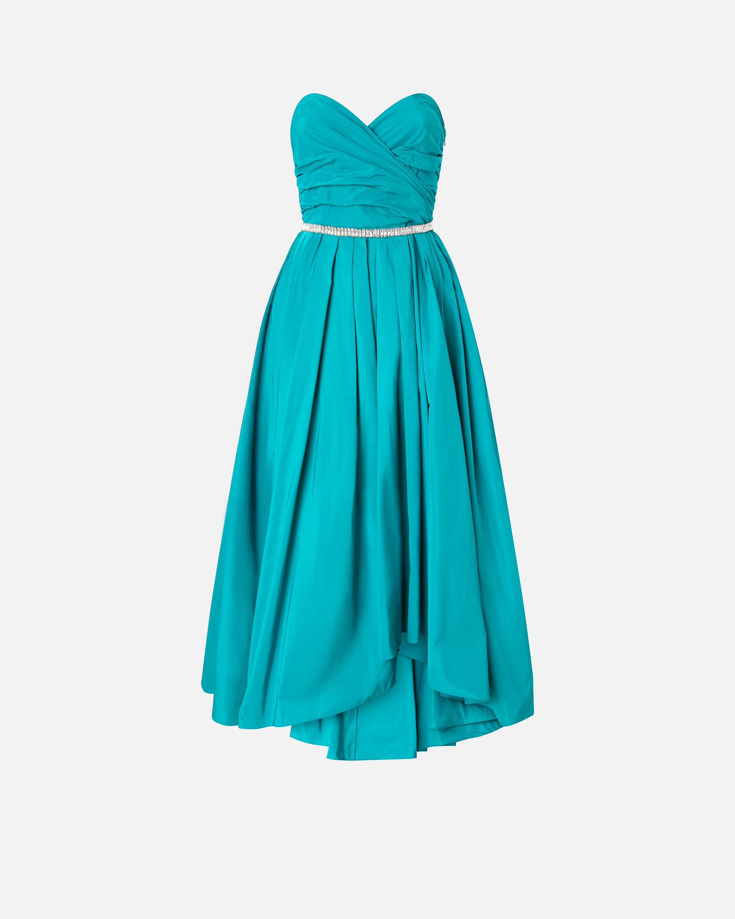 Abito lungo in leggero e lucente taffetà, caratterizzato da un corpino aderente e da una gonna voluminosa e svasata con morbide pieghe e spacco laterale. La linea femminile del bustino senza spalline è valorizzata dallo scollo sagomato e dal gioco di arricci, mentre l'interno delle coppe è dotato di tape per evitare che l'abito scivoli. Il capo, completo di una comoda chiusura con zip su un lato per facilitare l'indosso, è ulteriormente arricchito da un dettaglio scintillante che rispecchia appieno l'estetica PINKO: una cinturina rimovibile, da indossare in vita, con la parte da allacciare in tessuto coordinato e l'altra parte impreziosita da luminosi cristalli gioiello. Questo vestito elegante è perfetto per essere indossato nelle occasioni speciali, sia come outfit da sera sia come look da cerimonia.