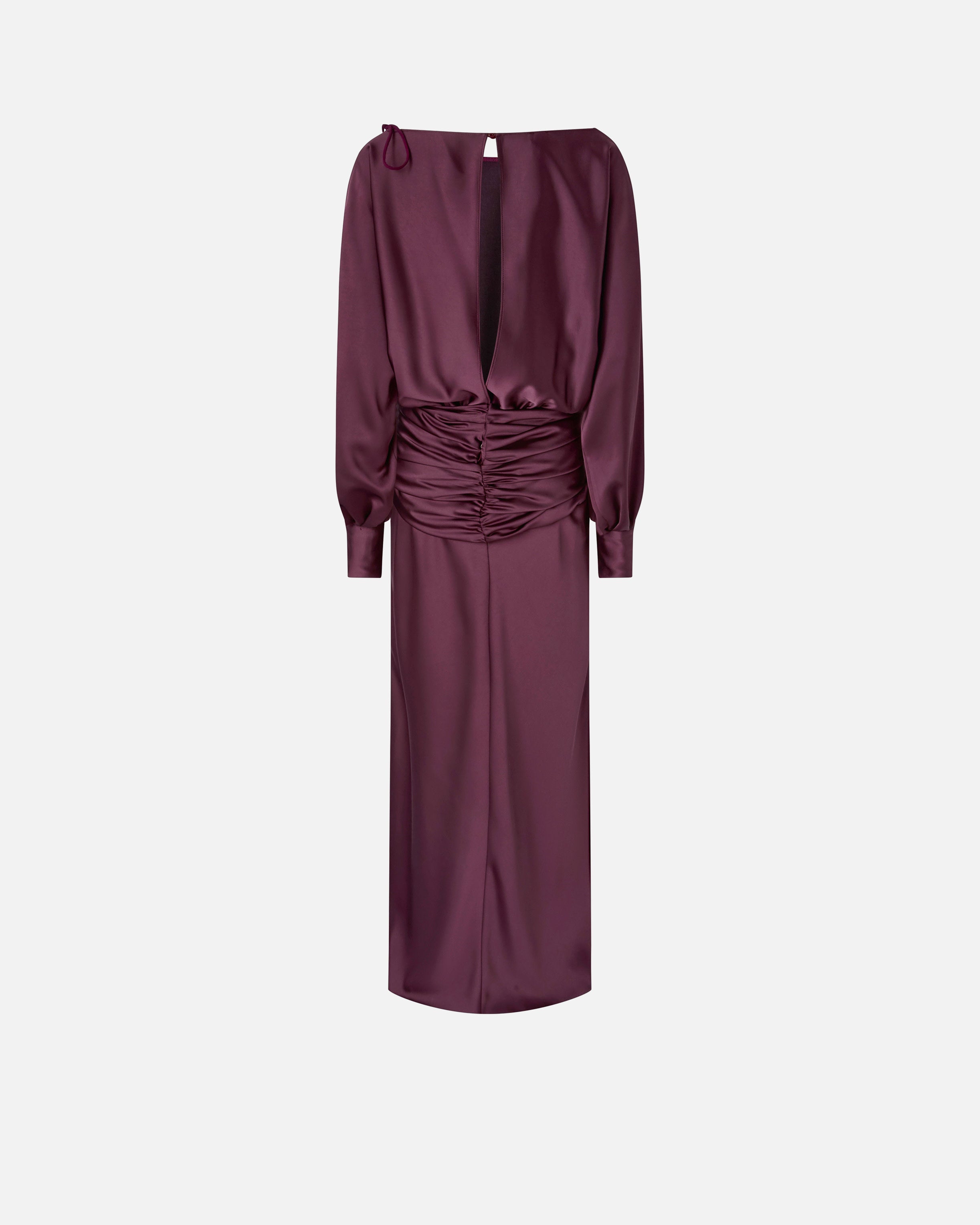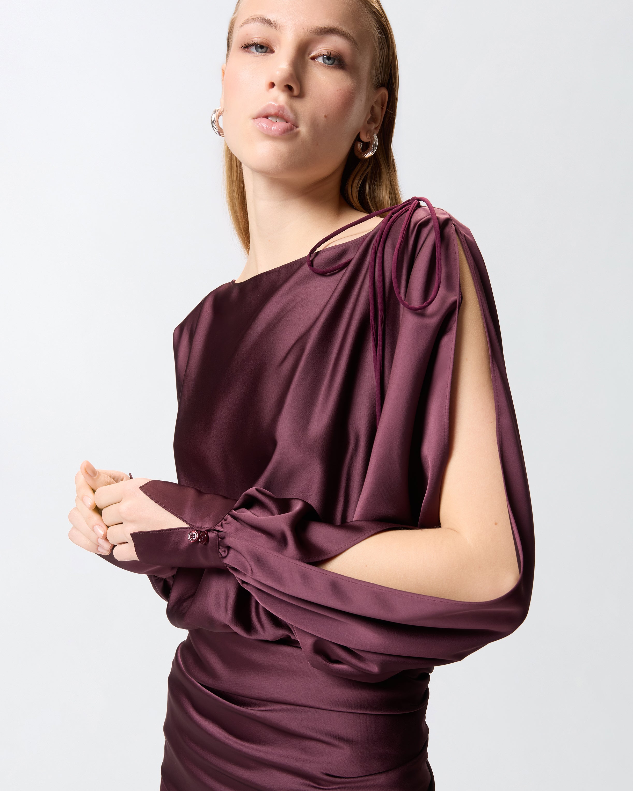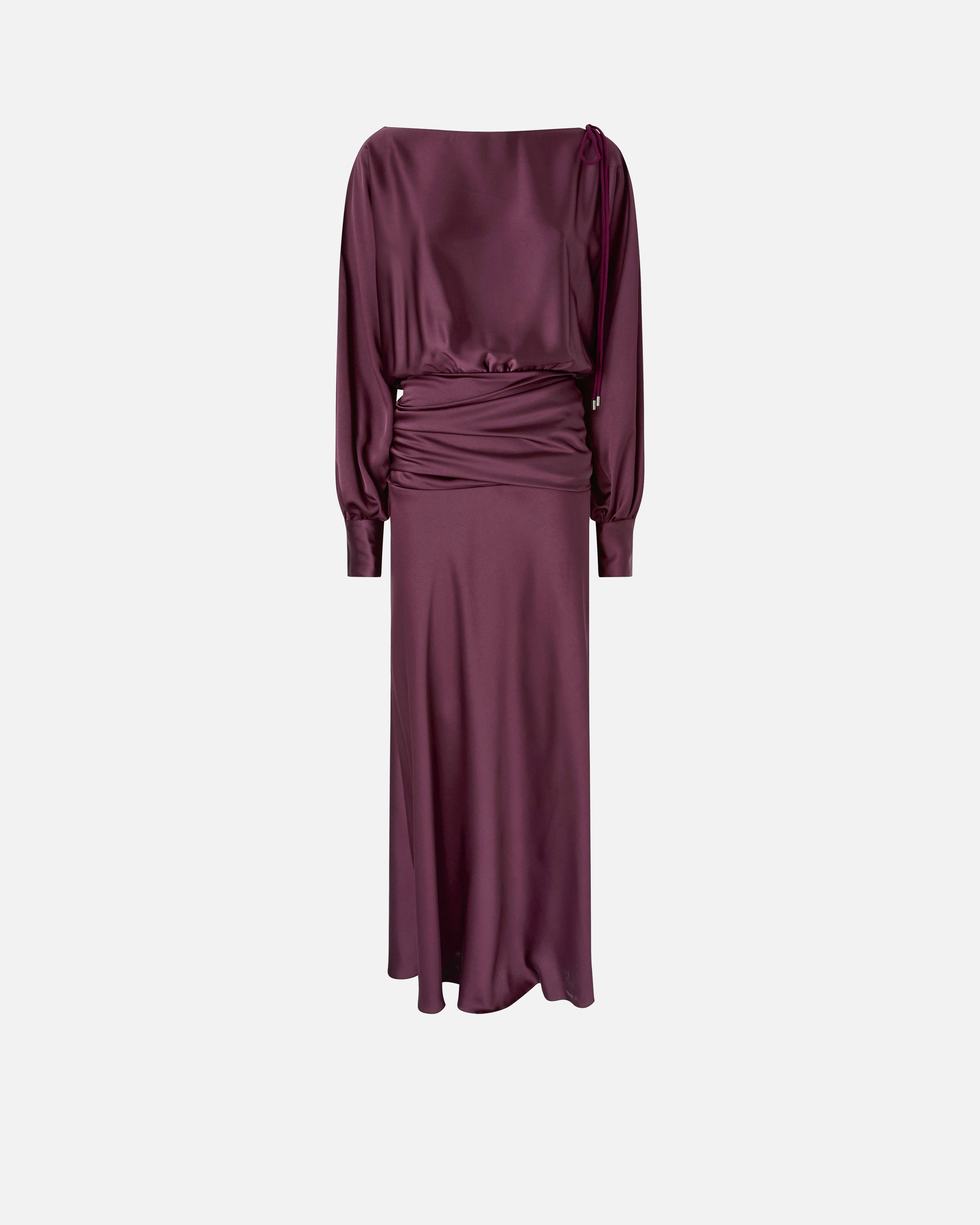 Abito lungo caratterizzato da una parte superiore con taglio in vita rimborsato, scollo a barchetta con nastrini da annodare su una spalla e maniche lunghe a palloncino con polsino alto, e da una gonna scivolata con orlo dall'effetto ondulato. Il modello è realizzato in morbido e lucente satin double face, per un aspetto raffinato e uniforme sia all'esterno sia all'interno, e presenta un elegante drappeggio in vita chiuso con zip invisibile e bottoncini per migliorare l'indosso senza sacrificare la fluidità della silhouette. Perfetto per un'occasione speciale o per una cerimonia, il vestito è completato da una fodera interna e da un lungo cut-out centrale che attraversa tutta la schiena, chiuso soltanto da un piccolo bottone posto alla base del collo.