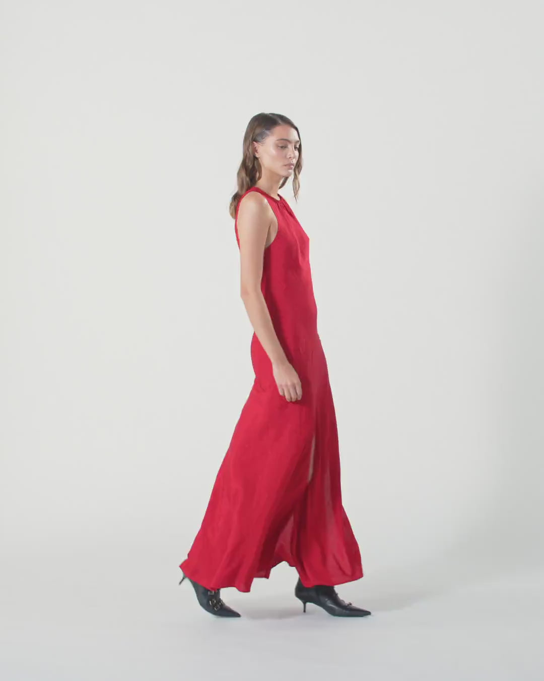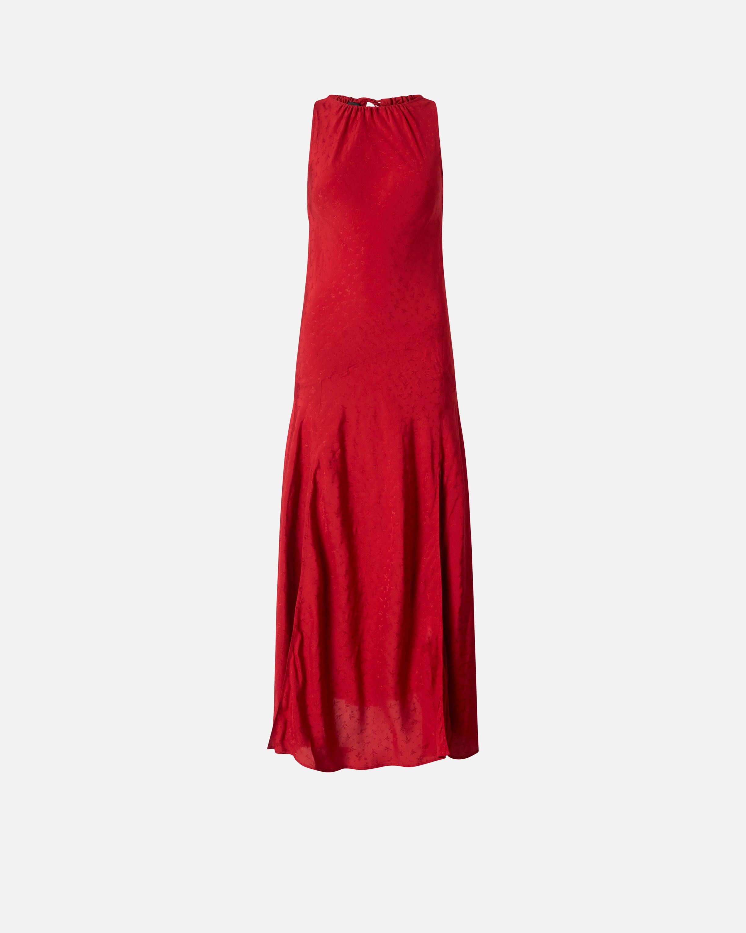 Abito lungo senza maniche con balza al fondo e collo tondo regolabile tramite coulisse che si apre in un taglio cut-out verticale sul retro. Il capo è realizzato in viscosa jacquard e la texture è personalizzata con un motivo con logo Love Birds. Il vestito presenta una vestibilità morbida, messa ancora più in risalto dallo strato di tessuto esterno effetto see-through che lascia intravedere il motivo sottostante. Indossalo tutti i giorni per avere praticità e femminilità in un unico capo da poter sfoggiare dall'ufficio fino all'aperitivo.