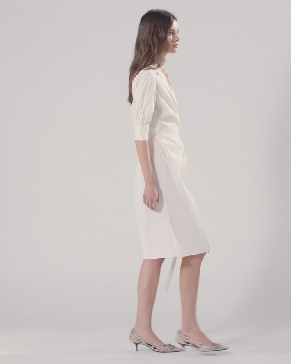 Abito midi con parte superiore definita da mezze maniche a palloncino con bottoni sul fondo e da un colletto a camicia con apertura a V e logo lettering PINKO ricamato in corsivo. Il capo si presenta in un popeline di cotone comfort dalla mano morbida ma compatta, ed è reso speciale dal design a portafoglio, che si chiude su un lato grazie al morbido nastro da infilare nel dettaglio ad anello. Il vestito, rifinito inoltre dalla vita elasticizzata e arricciata sul retro e dal raffinato carré posteriore con doppia piega, mostra una versatilità senza pari, perfetta per accompagnarti in diverse occasioni d'uso dalla mattina fino alla sera.