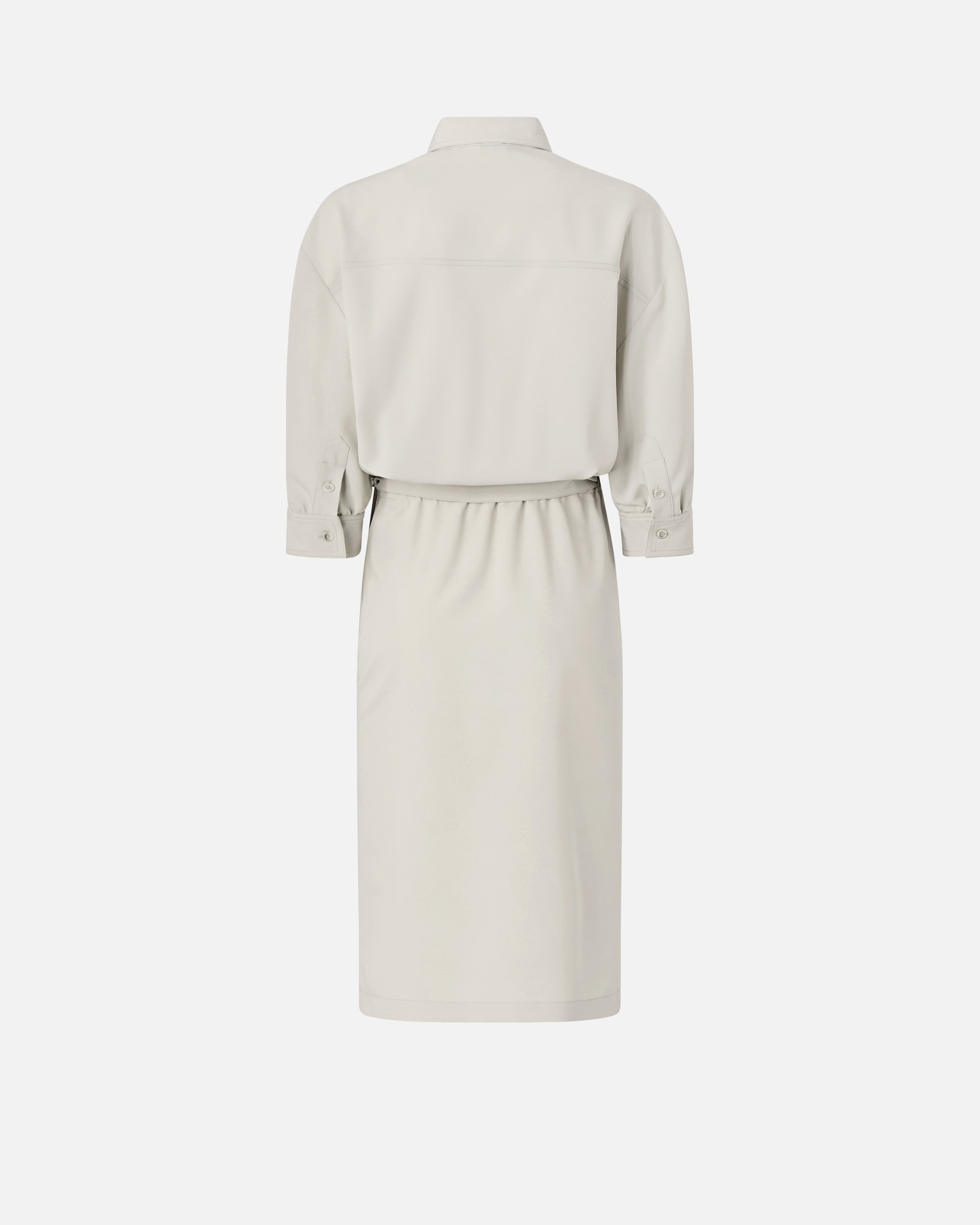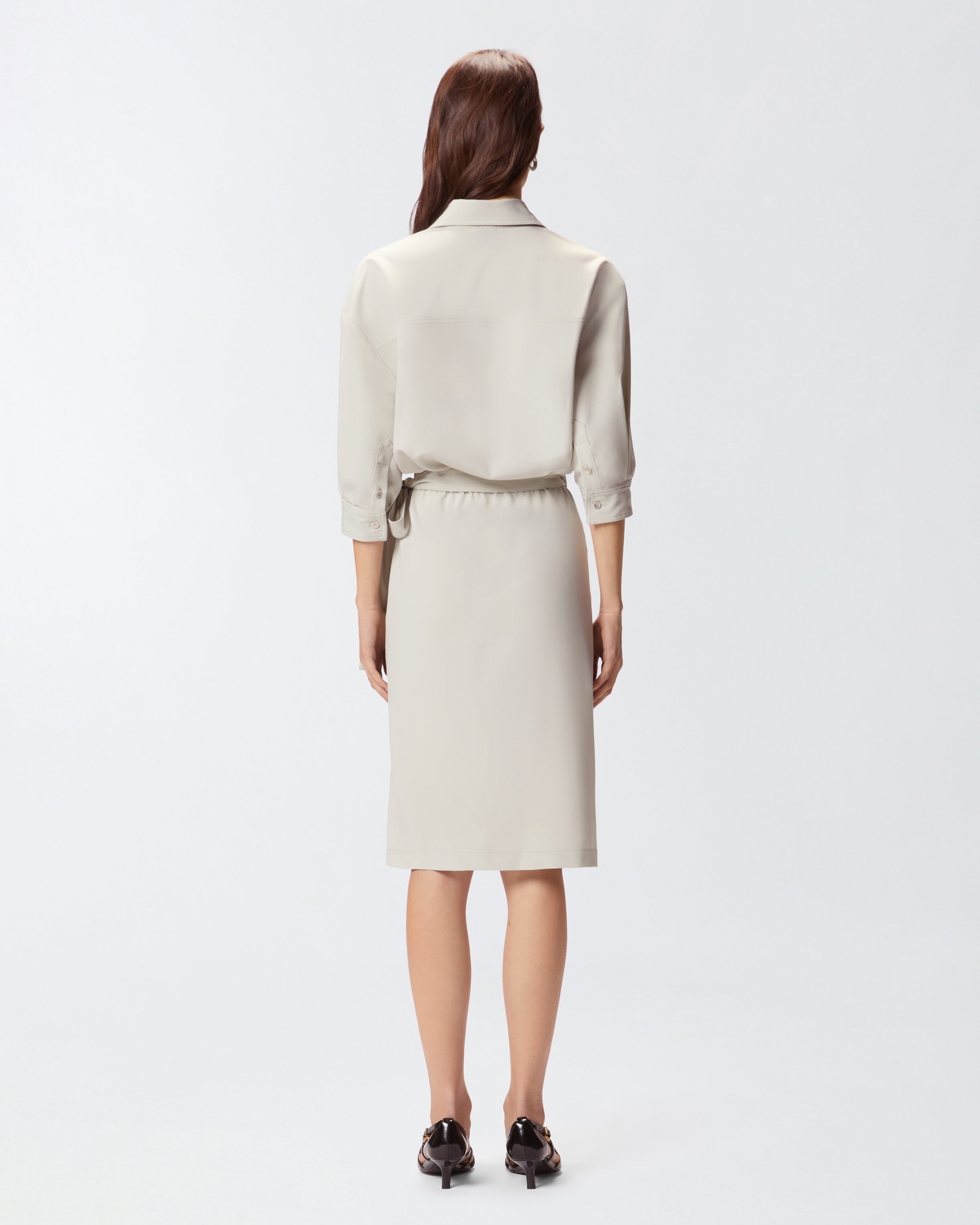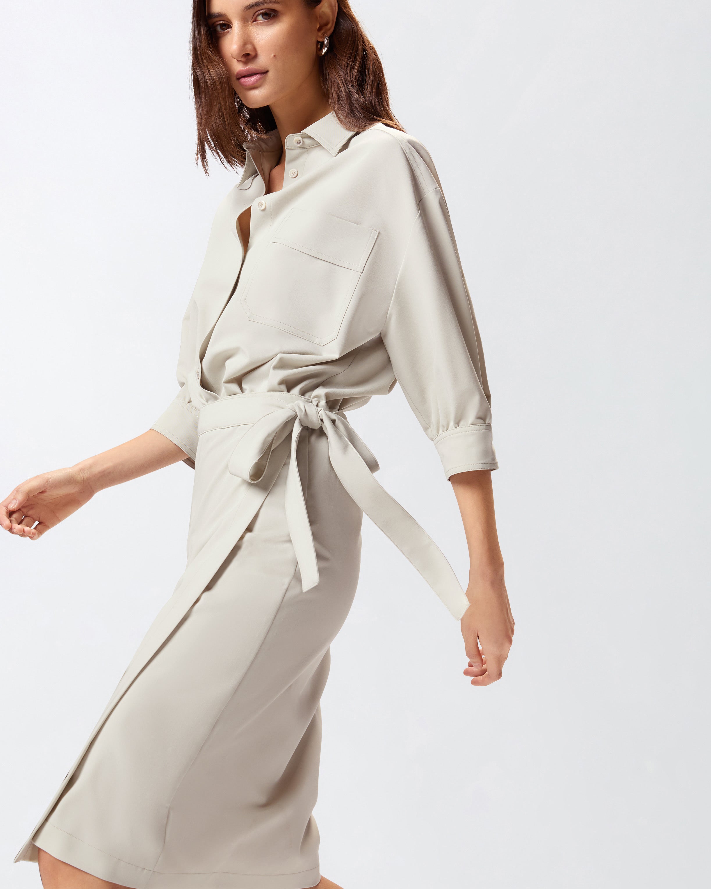 Abito midi realizzato in tessuto fluido di viscosa, ideale per accompagnare la figura senza costringere i movimenti. Il modello presenta una parte superiore più ampia e morbida, caratterizzata da un design a camicia con colletto classico, maniche a tre quarti con bottoni sul fondo, abbottonatura frontale e taschino applicato lato cuore, mentre la gonna, di stampo più elegante, si distingue per la linea aderente con chiusura a portafoglio da allacciare a fiocco su un fianco. Grazie alla sua versatilità, questo vestito si presta a essere indossato in diverse occasioni: ti basterà cambiare scarpe e accessori per adattarlo a eventi un po' più formali o a serate casual in compagnia.