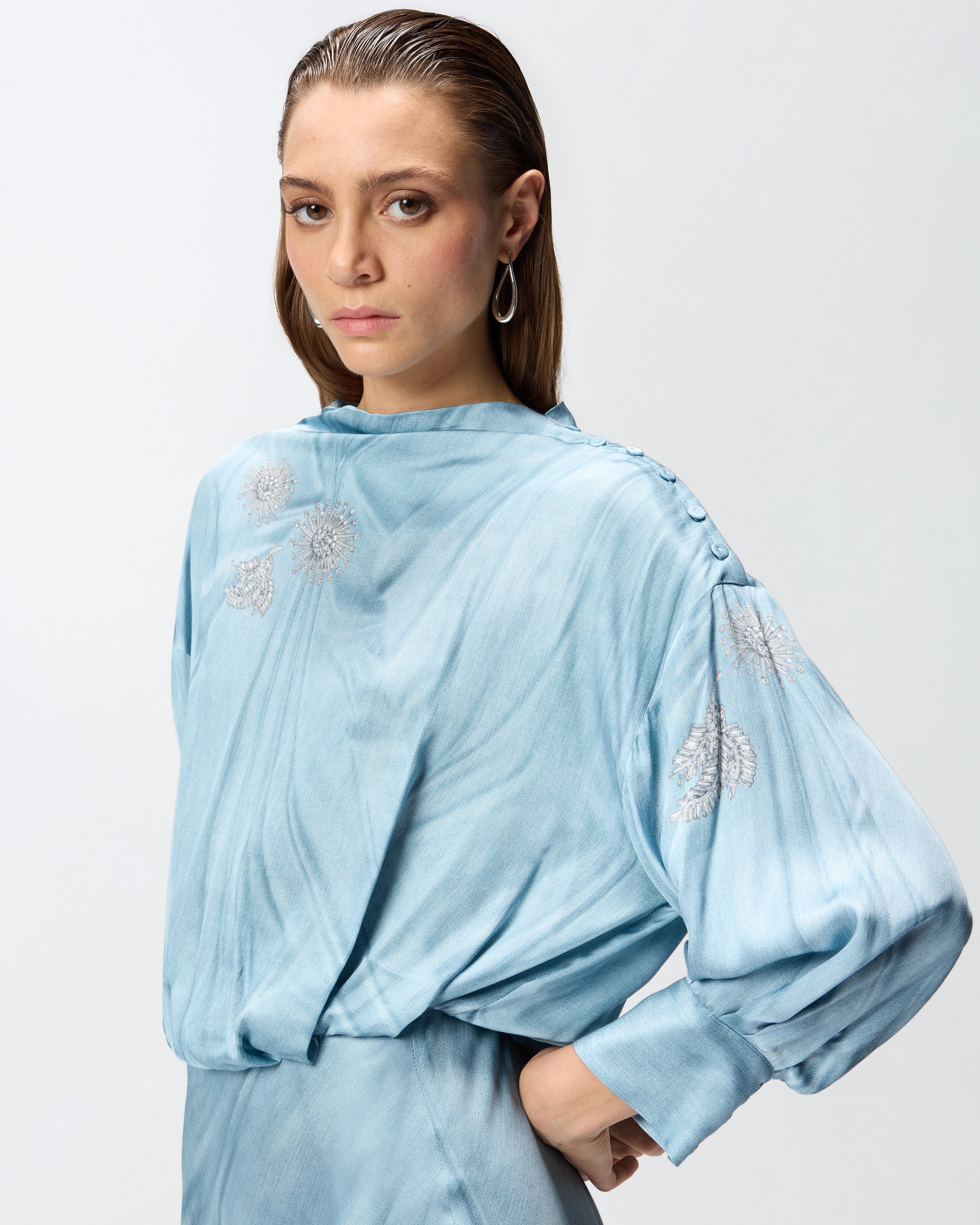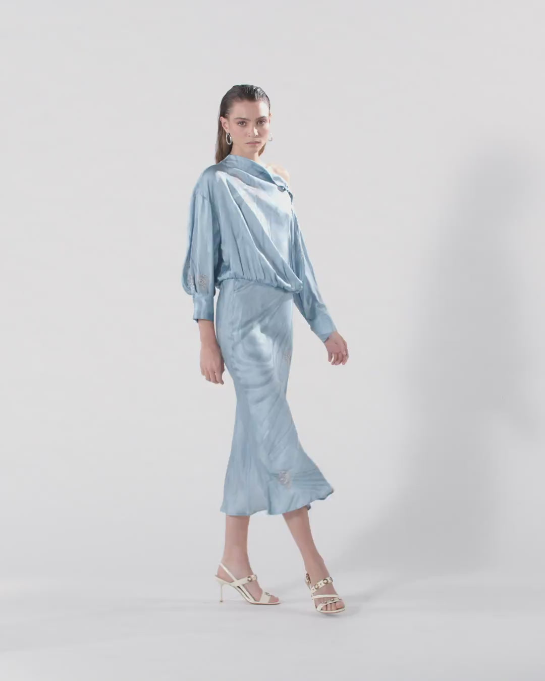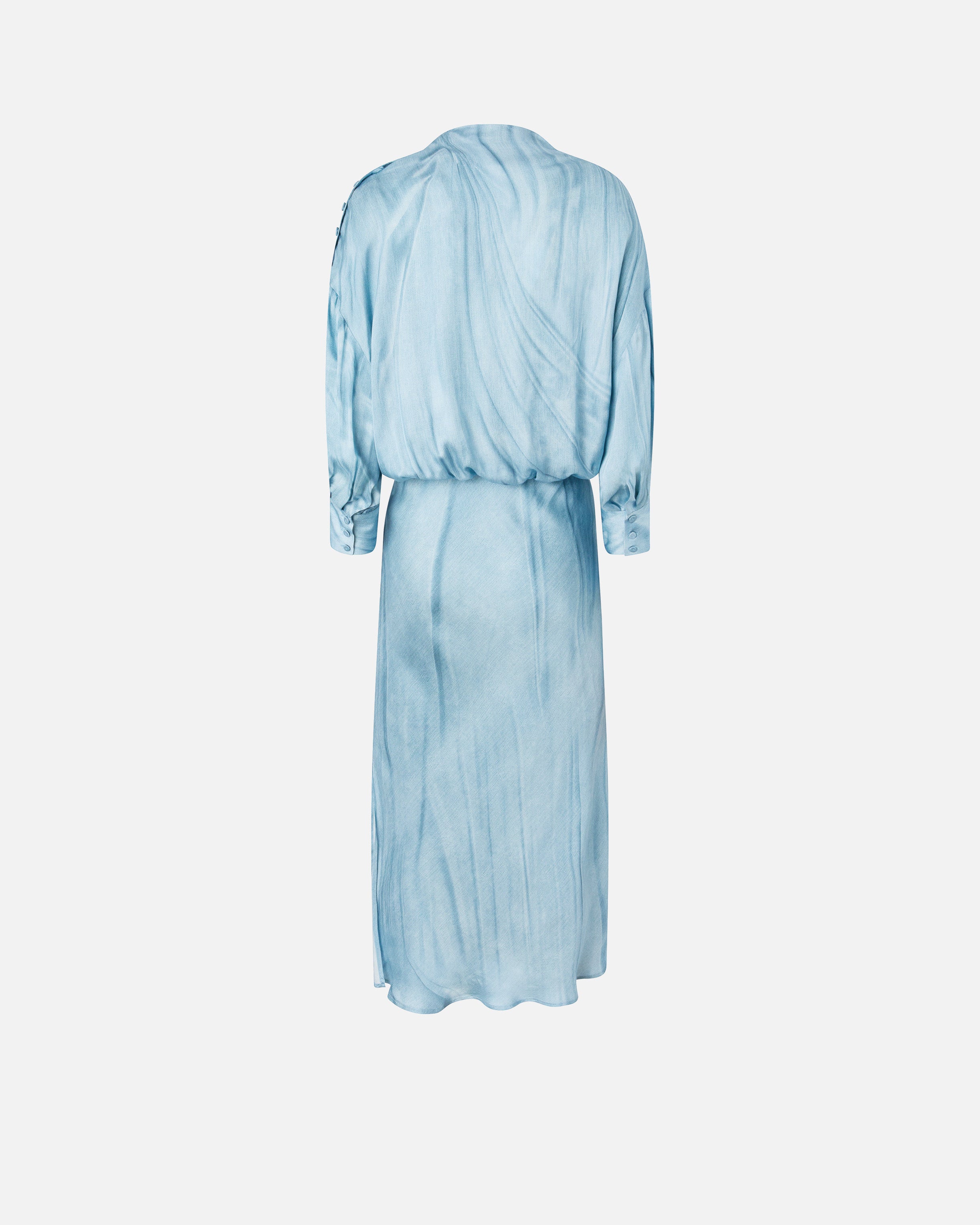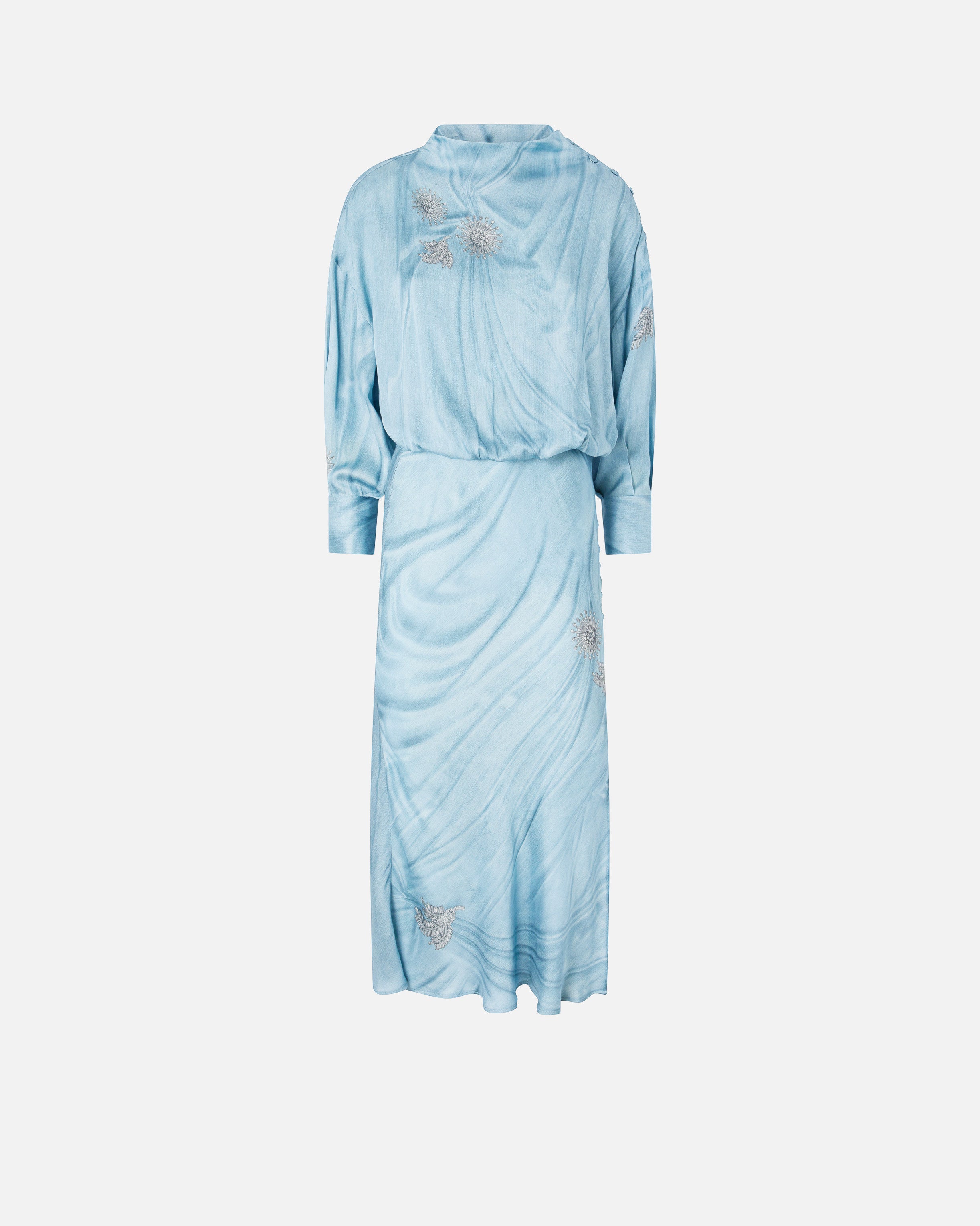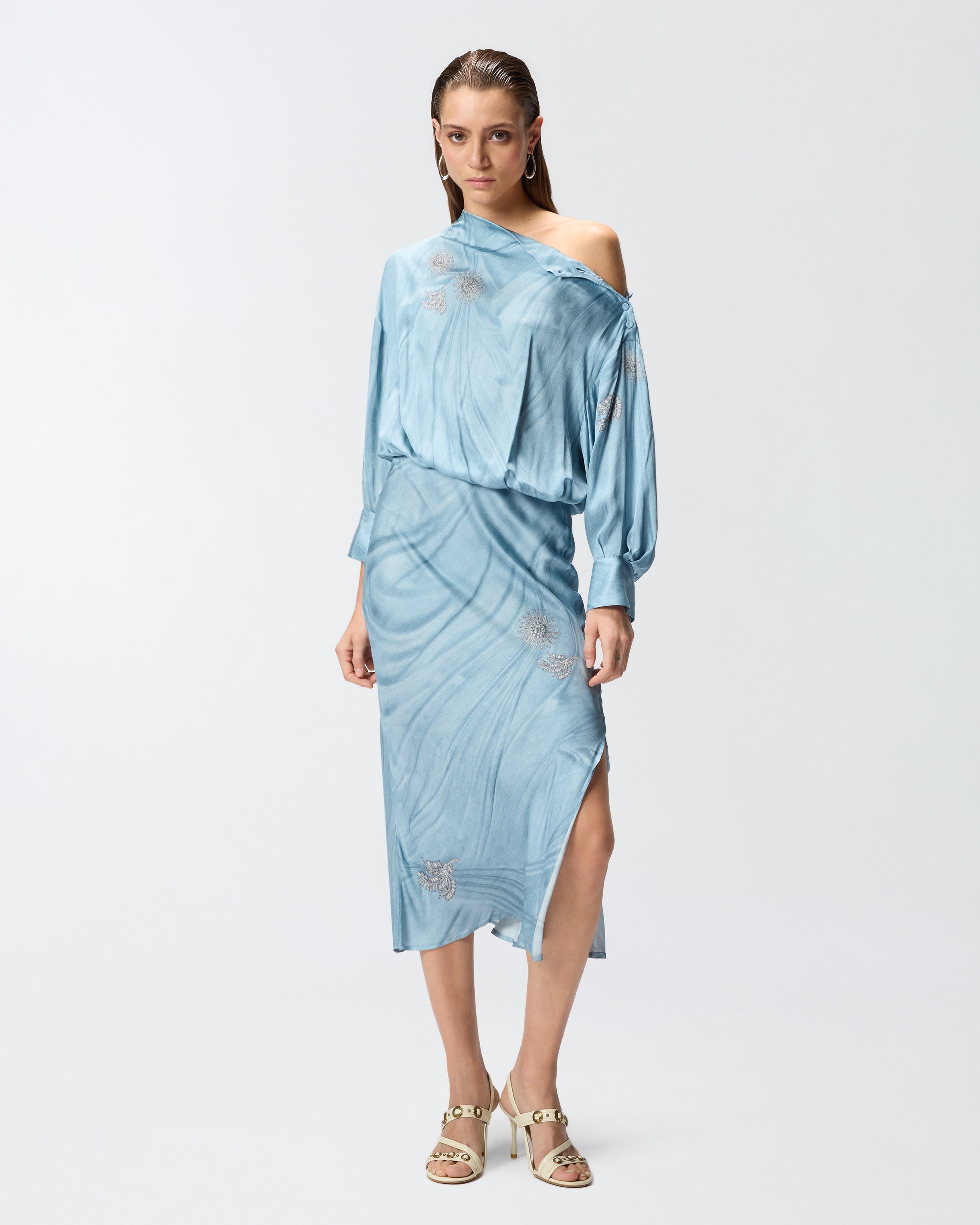 Abito midi caratterizzato da una parte superiore con taglio in vita rimborsato, collo leggermente rialzato e maniche lunghe con polsino, e da una gonna scivolata con orlo dall'effetto ondulato. Il modello è realizzato in raso fluido di viscosa su cui è piazzata una stampa trompe-l'œil effetto denim scolorito e drappeggiato arricchita da un disegno con spille gioiello. Perfetto per un'occasione speciale o per una cerimonia, il vestito è completato da un'apertura su una spalla con delicati bottoncini ricoperti in tessuto. - AISLIN ABITO