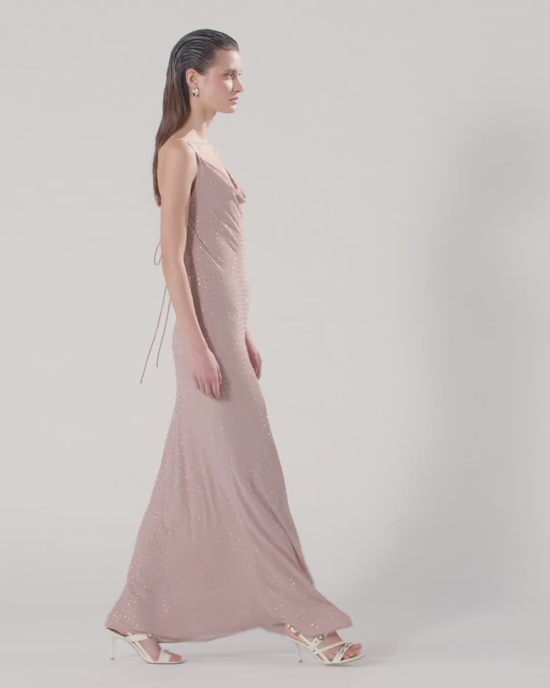 Abito lungo dalla silhouette a sottoveste con spalline sottili, morbido scollo frontale drappeggiato e ampio scollo tondo sul retro che lascia la schiena scoperta, attraversata solo da due nastrini da annodare al centro. Il modello è realizzato in un tessuto georgette dal raffinato aspetto opaco che accompagna il corpo con delicatezza e permette di ottenere una silhouette fluida e leggera, ed è impreziosito da brillanti strass disposti su tutta la superficie del capo, perfetta espressione del DNA PINKO. Questo vestito, femminile ma dalla personalità decisa, è destinato a diventare il protagonista assoluto dei tuoi look per serate speciali e cerimonie esclusive. - FARRO ABITI