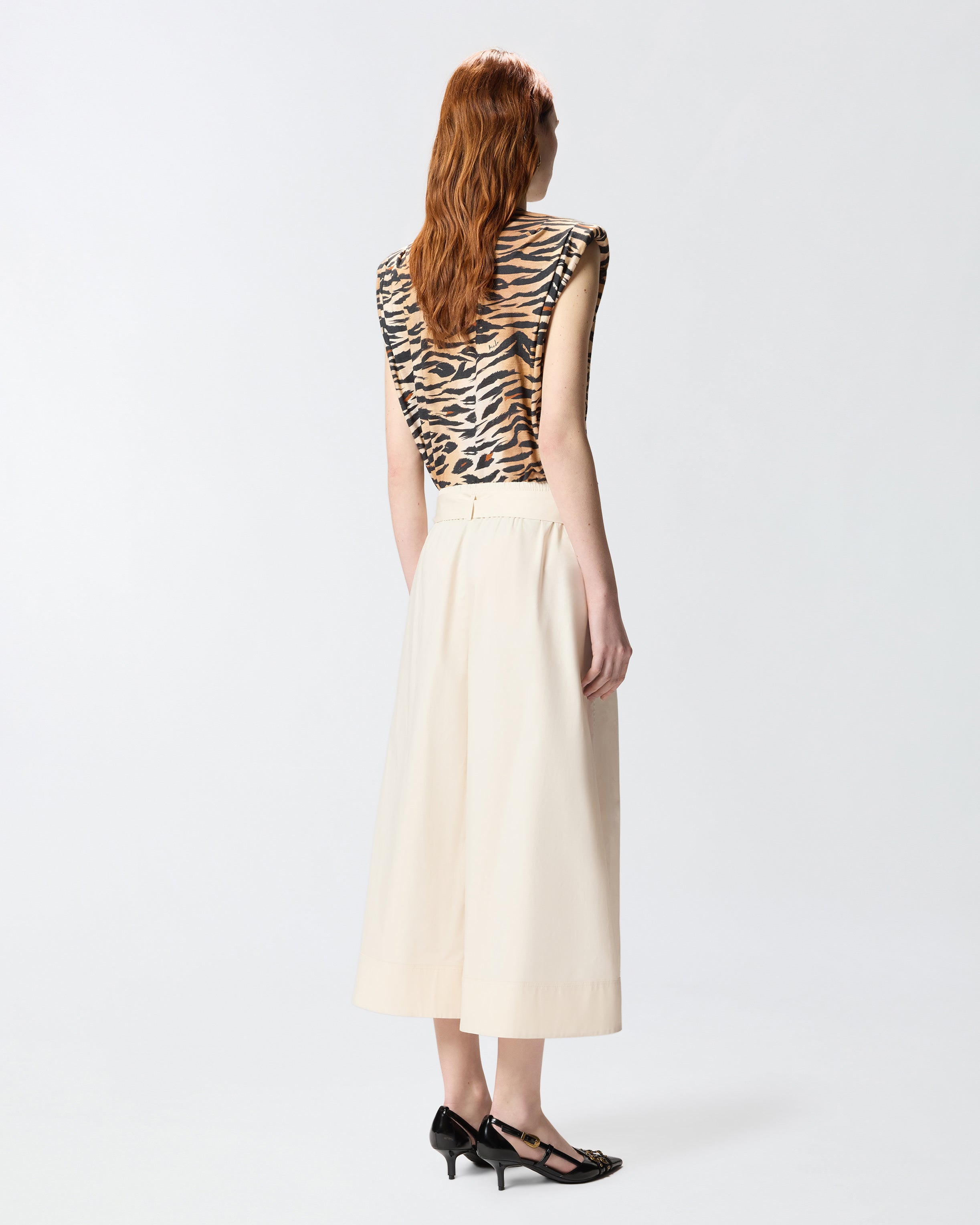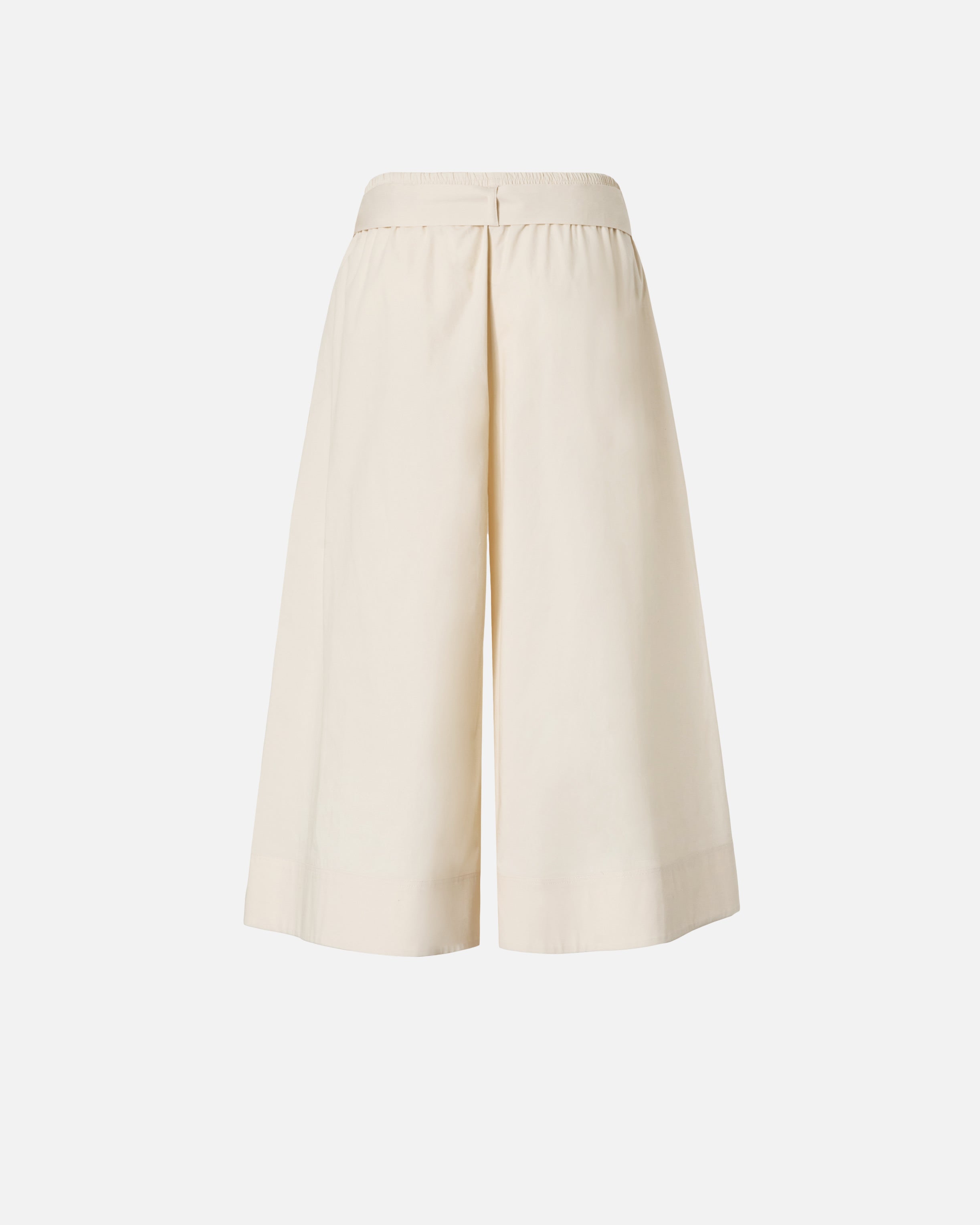 Bermuda lunghi con gamba leggermente svasata realizzati in comodo e fresco popeline di cotone stretch. Il modello presenta una vita elasticizzata e raffinate pinces sul davanti, ed è completato da una cintura in tessuto abbinato caratterizzata da una fibbia dorata con l'iconico logo Love Birds Diamond Cut. La grande versatilità del capo lo rende un autentico asso nella manica del guardaroba femminile per la bella stagione.