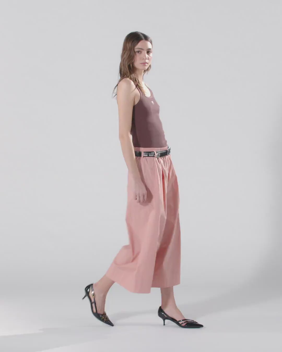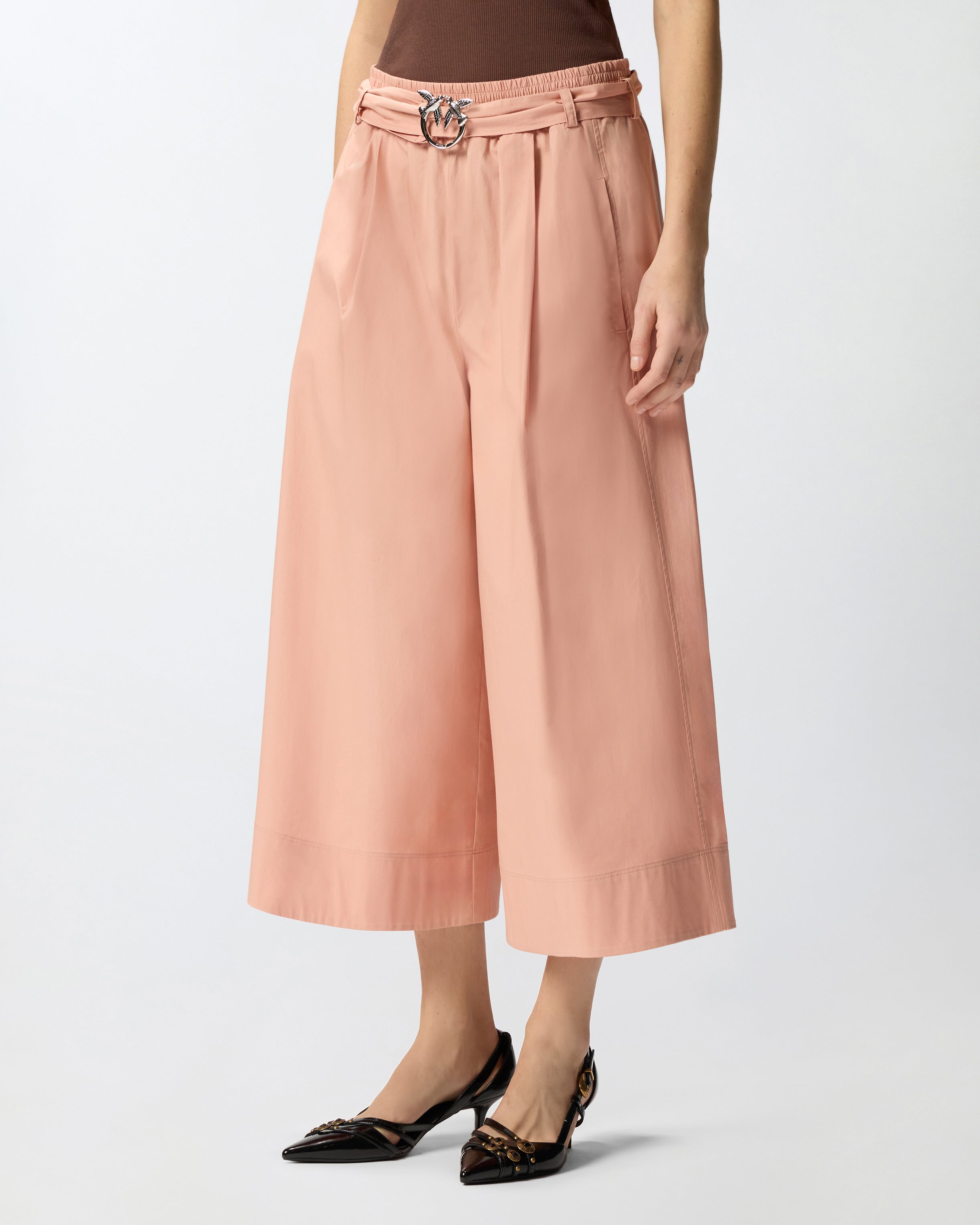 Bermuda lunghi con gamba leggermente svasata realizzati in comodo e fresco popeline di cotone stretch. Il modello presenta una vita elasticizzata e raffinate pinces sul davanti, ed è completato da una cintura in tessuto abbinato caratterizzata da una fibbia dorata con l'iconico logo Love Birds Diamond Cut. La grande versatilità del capo lo rende un autentico asso nella manica del guardaroba femminile per la bella stagione.