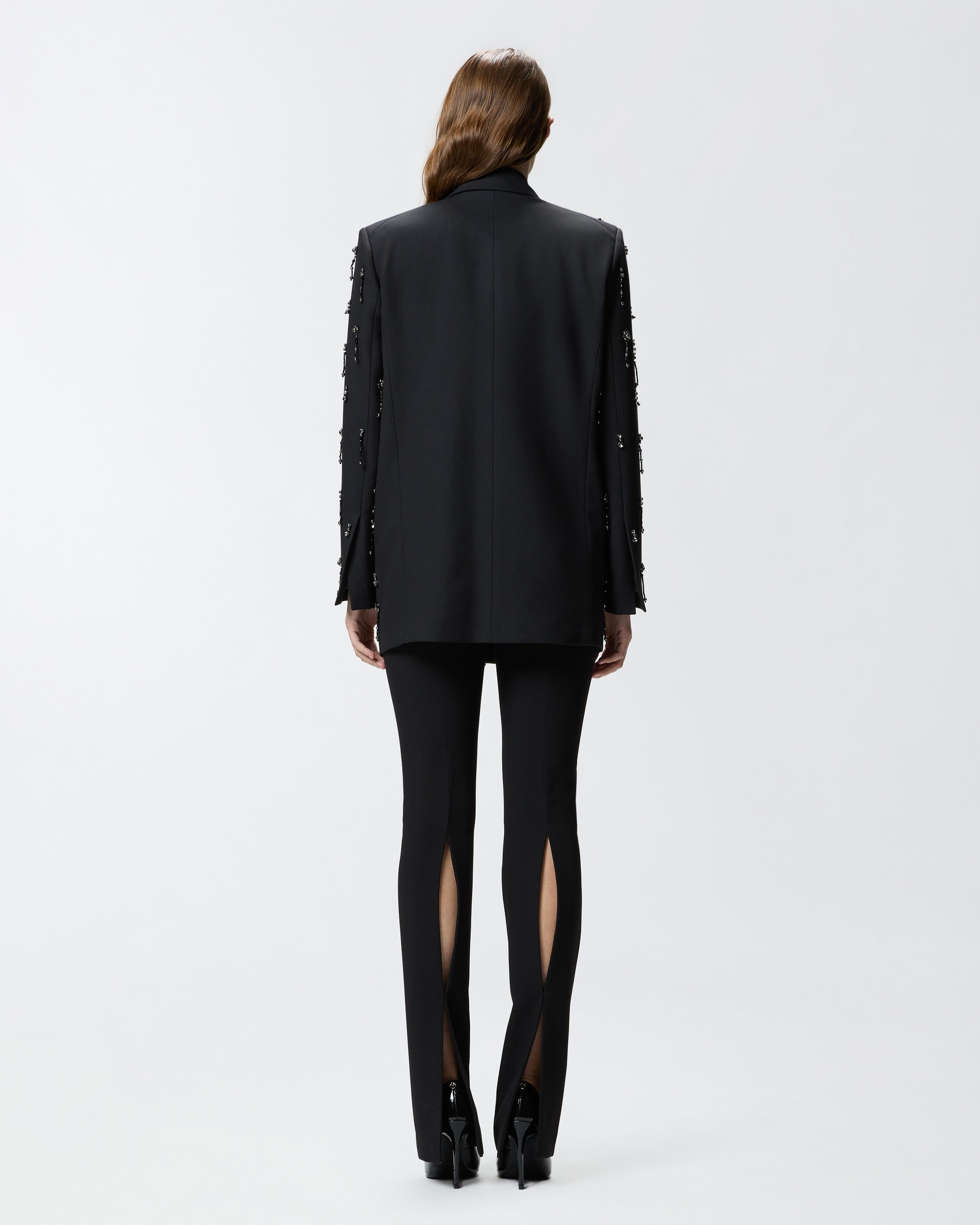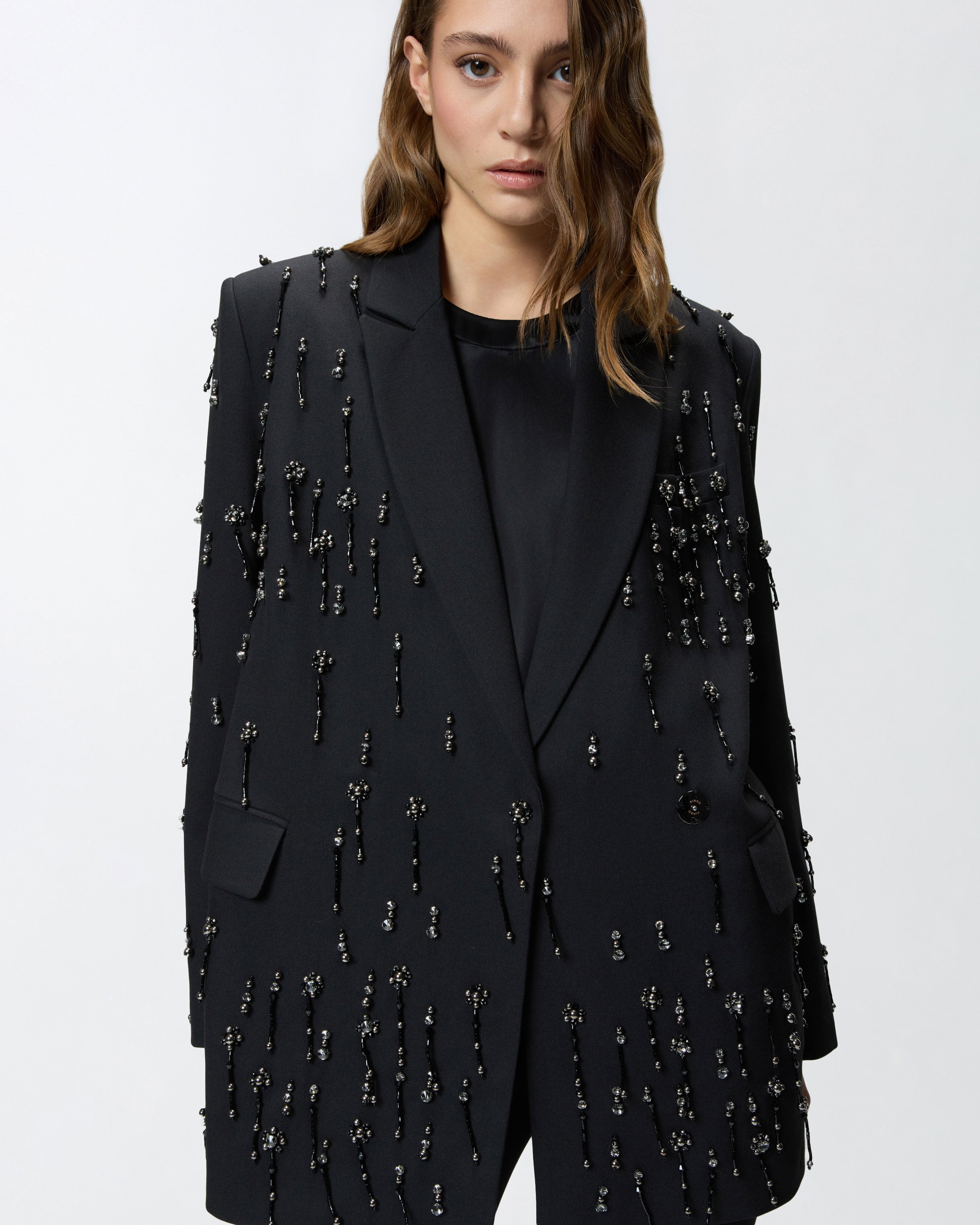 Blazer dalla vestibilità dritta con bottone invisibile, tasche sul davanti e taschino sul petto, realizzato in pregiato tessuto di poly viscosa. Perfetta unione di eleganza e artigianalità, questo modello è decorato da ricami con cristalli scintillanti e perle sulla parte frontale e sulle maniche: oltre a donare una luminosità senza pari, aggiungono un movimento fluido e contemporaneo. La vestibilità elegante e la finitura curata in ogni minimo dettaglio fanno di questa giacca un pezzo unico, ideale per serate speciali e occasioni di alta classe.