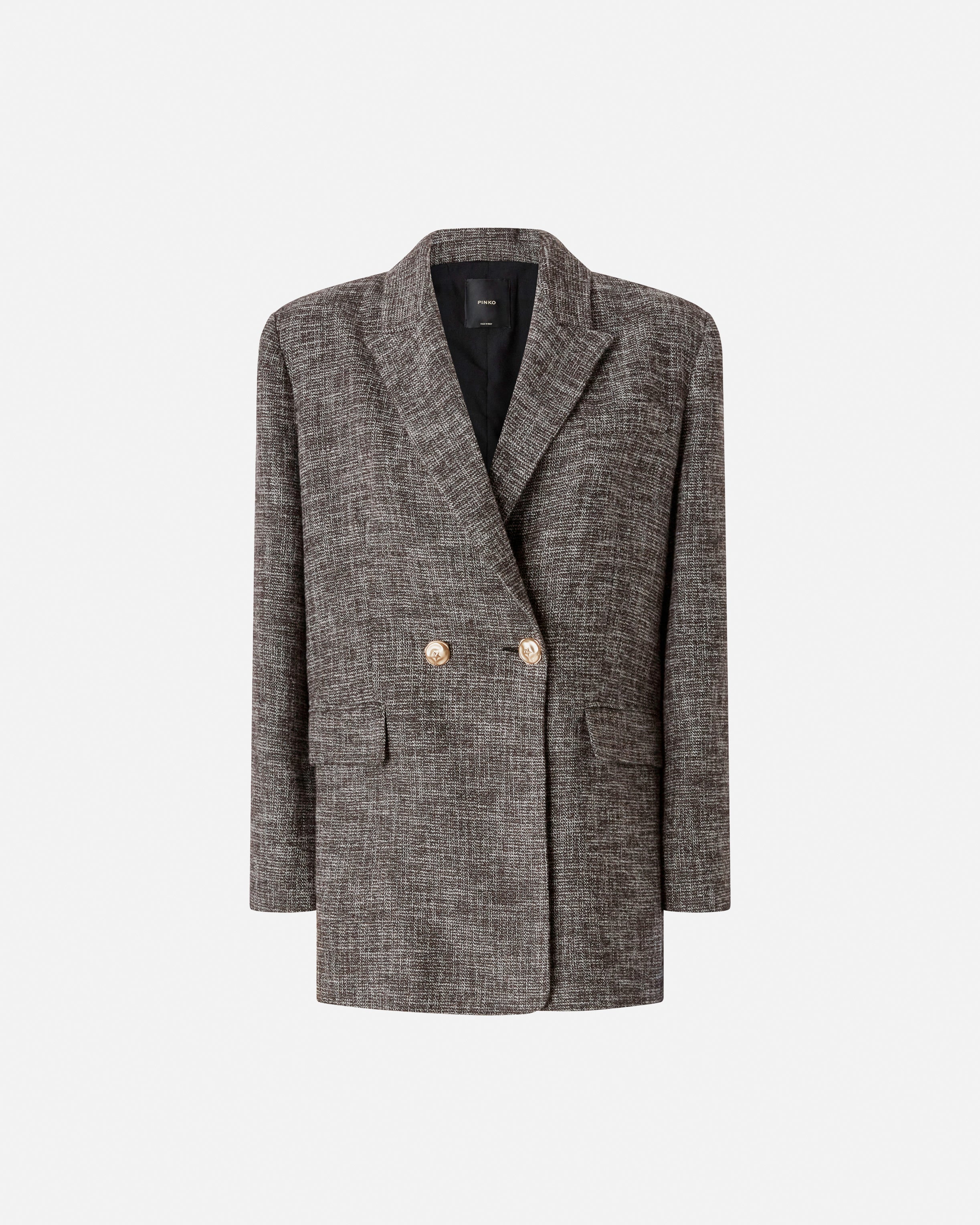Blazer doppiopetto dalla linea dritta e dalla vestibilità oversize con collo a revers e tasche anteriori con pattina. Il capo è realizzato in flanella dalla mano piacevole e calda, caratterizzata da un disegno tweed d'ispirazione classica. Il modello presenta una chiusura frontale con bottoni in metallo decorati da stella e uno spacco posteriore, anch'esso completato da bottoni. Abbina la giacca al pantalone nello stesso tessuto per creare un completo elegante e al tempo stesso contemporaneo.