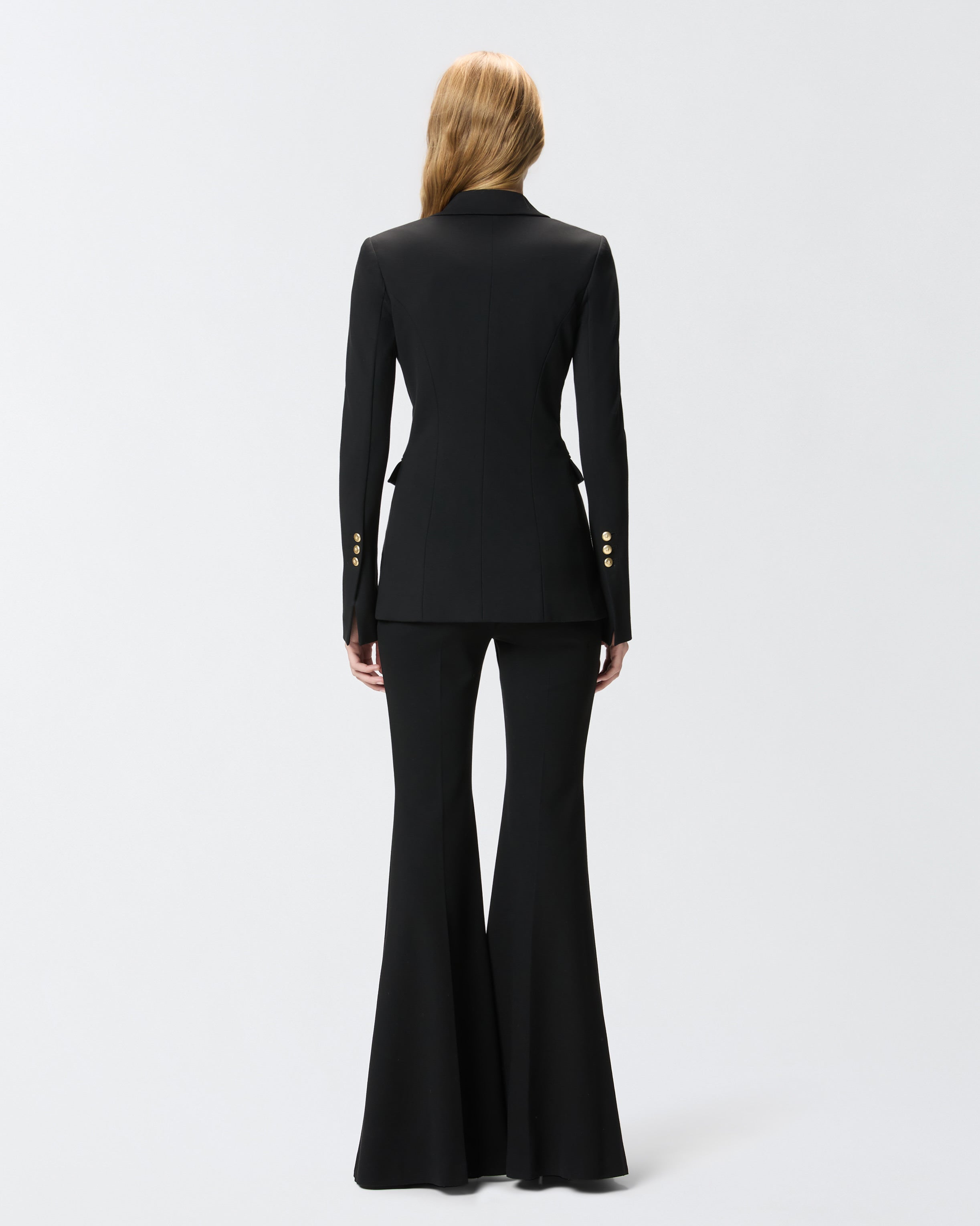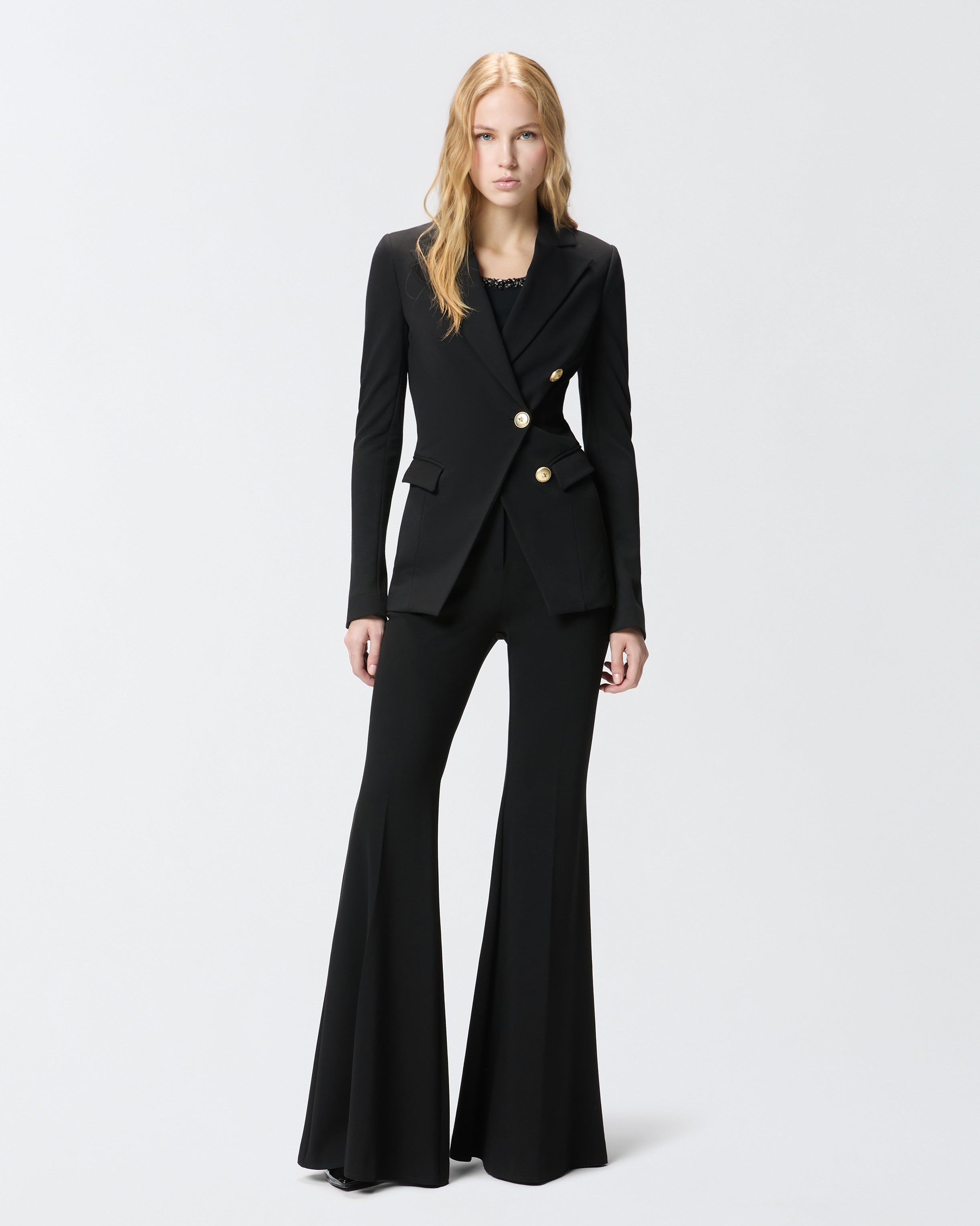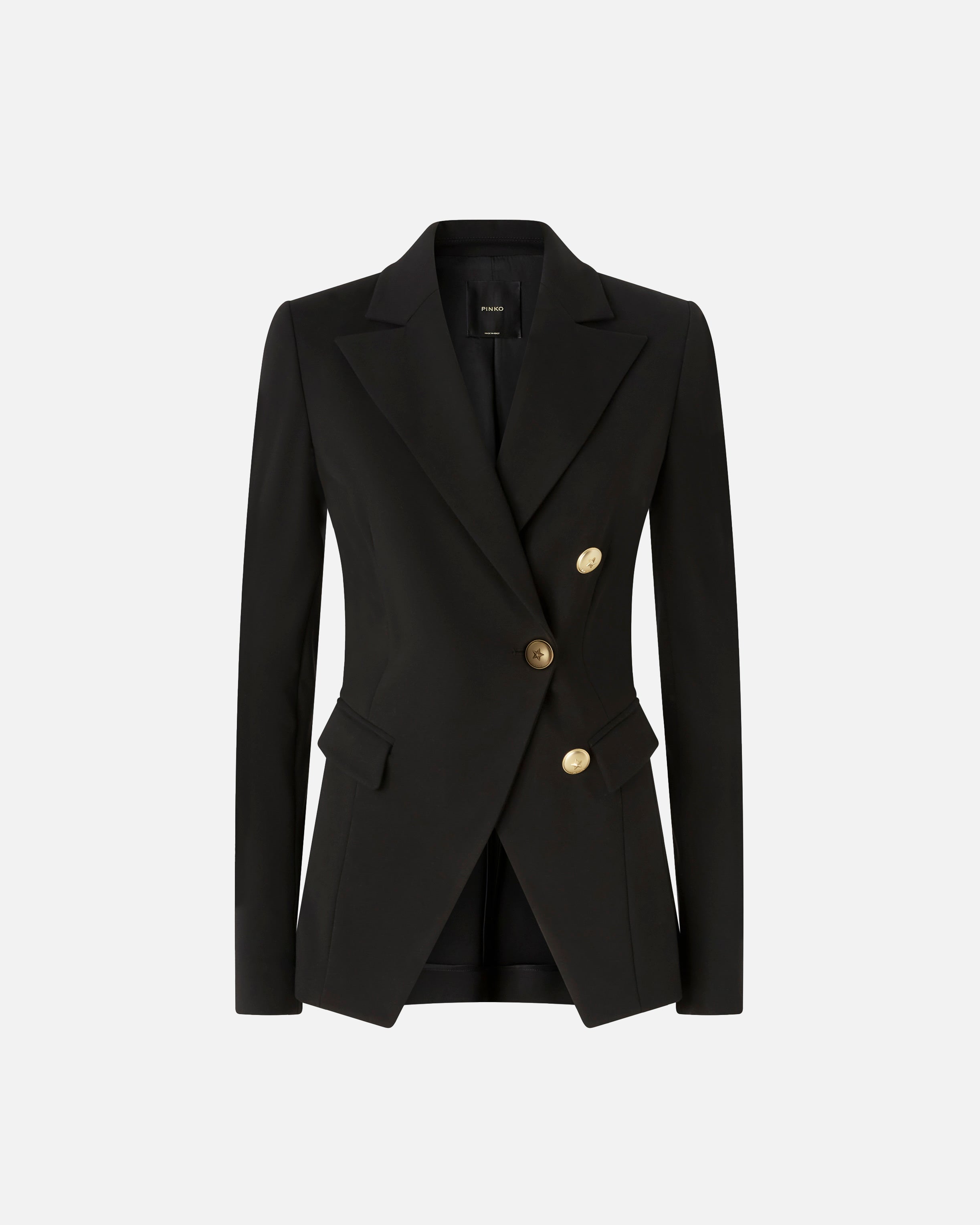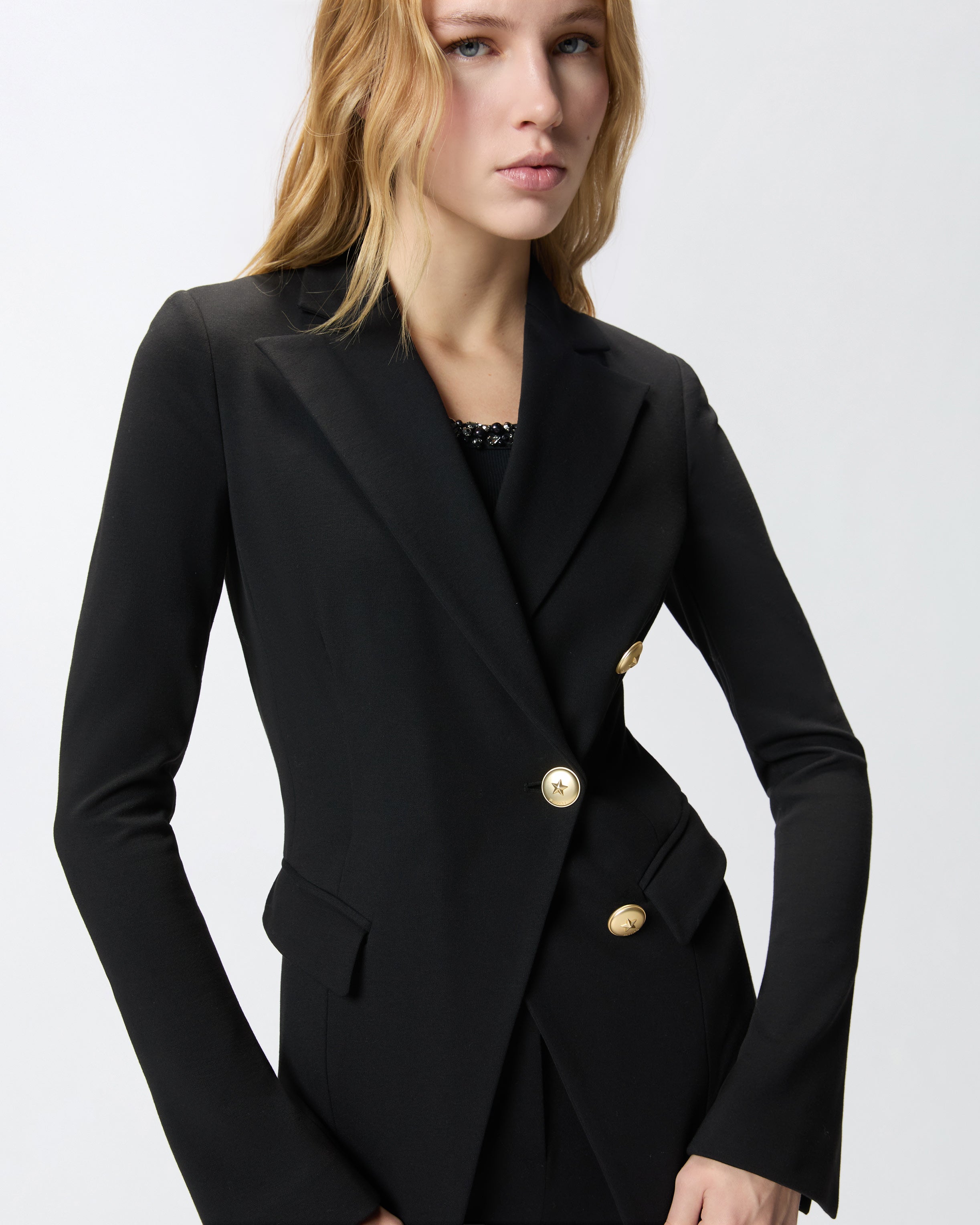 Giacca blazer elegante da donna realizzata in tessuto tecnico di viscosa stretch lavorato a punto stoffa, una speciale lavorazione che conferisce al tessuto una texture compatta e liscia. La vera protagonista del design è però la chiusura con bottoni decorati da stella, disposti in maniera tale da creare un particolare effetto di abbottonatura doppiopetto asimmetrica. Il capo presenta il carré posteriore foderato per garantire comfort e migliorare l'indosso, mentre il resto dell'interno è sfoderato per sfruttare al massimo il movimento del tessuto. Il modello presenta una vestibilità sfiancata, più aderente sui fianchi. Abbina il blazer con il pantalone nello stesso tessuto per un effetto tailleur, oppure indossa una camicia per un look formale, ma non troppo.