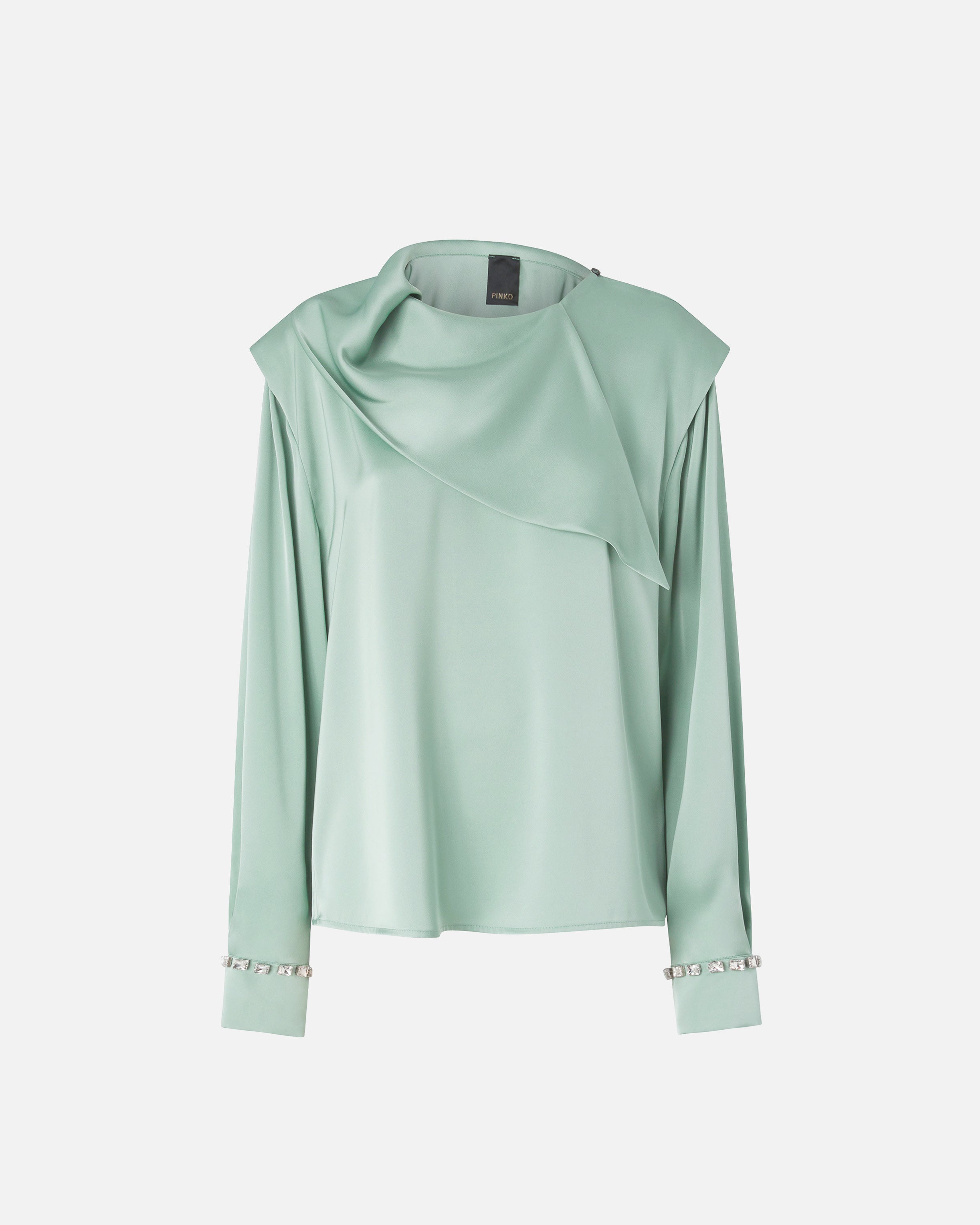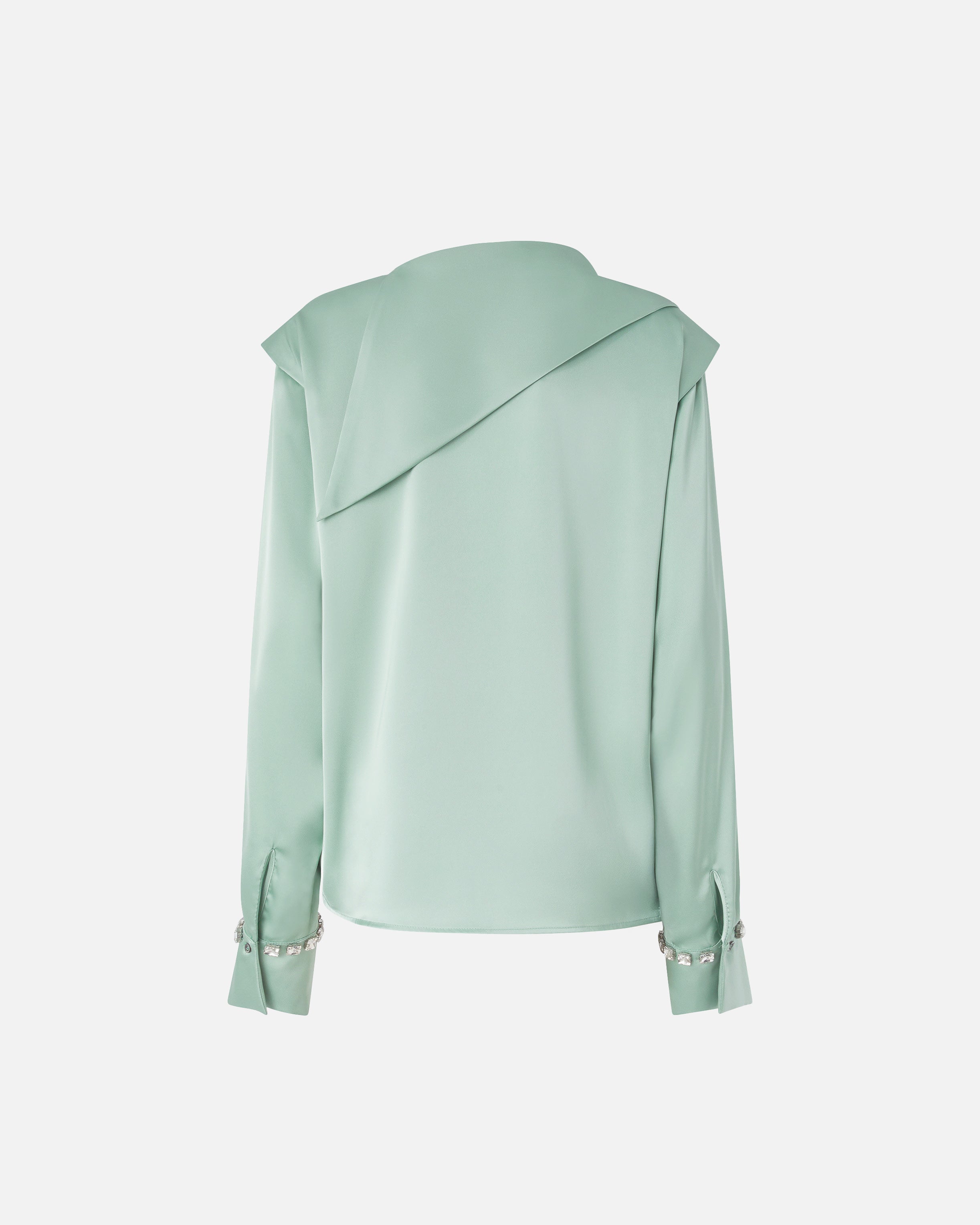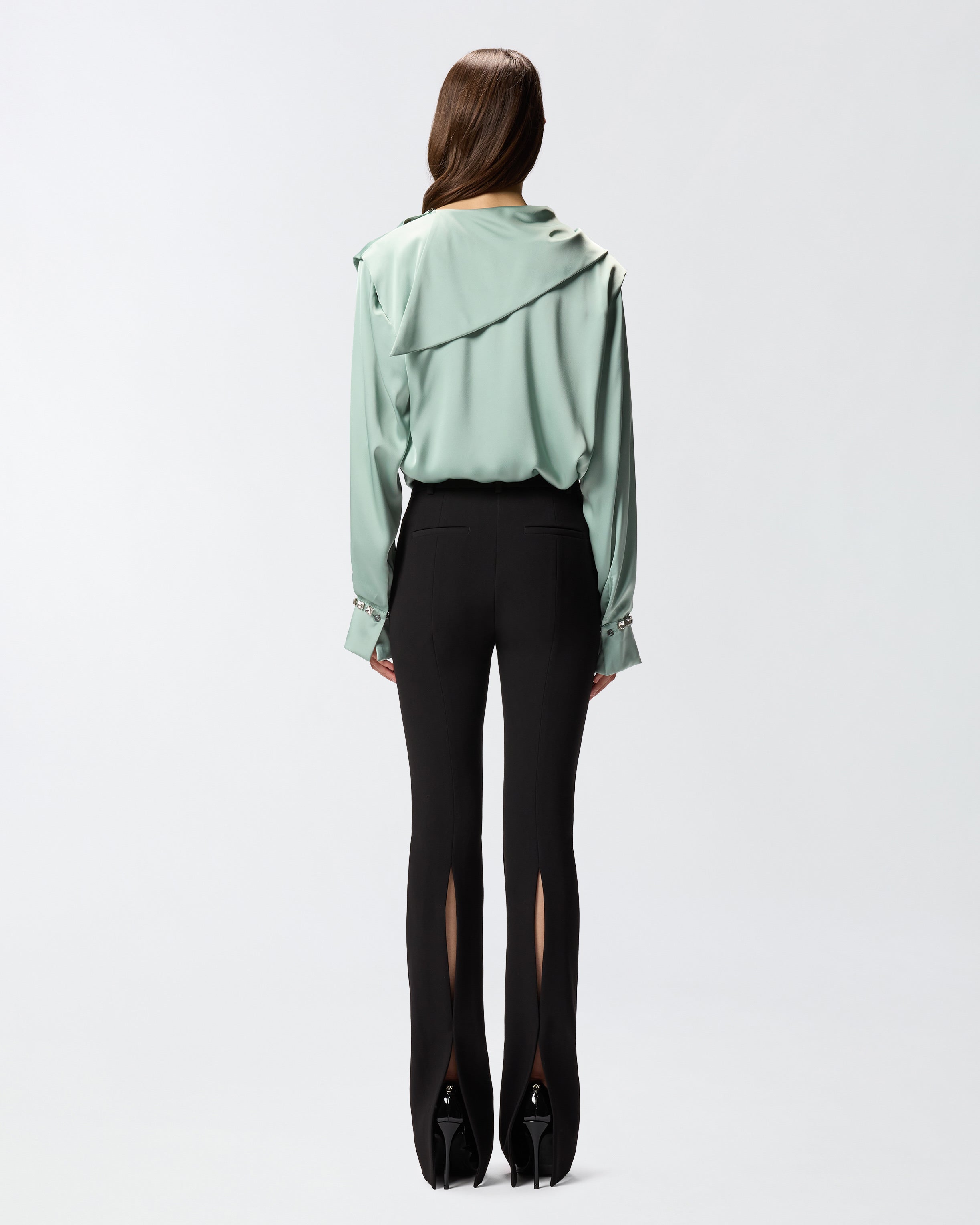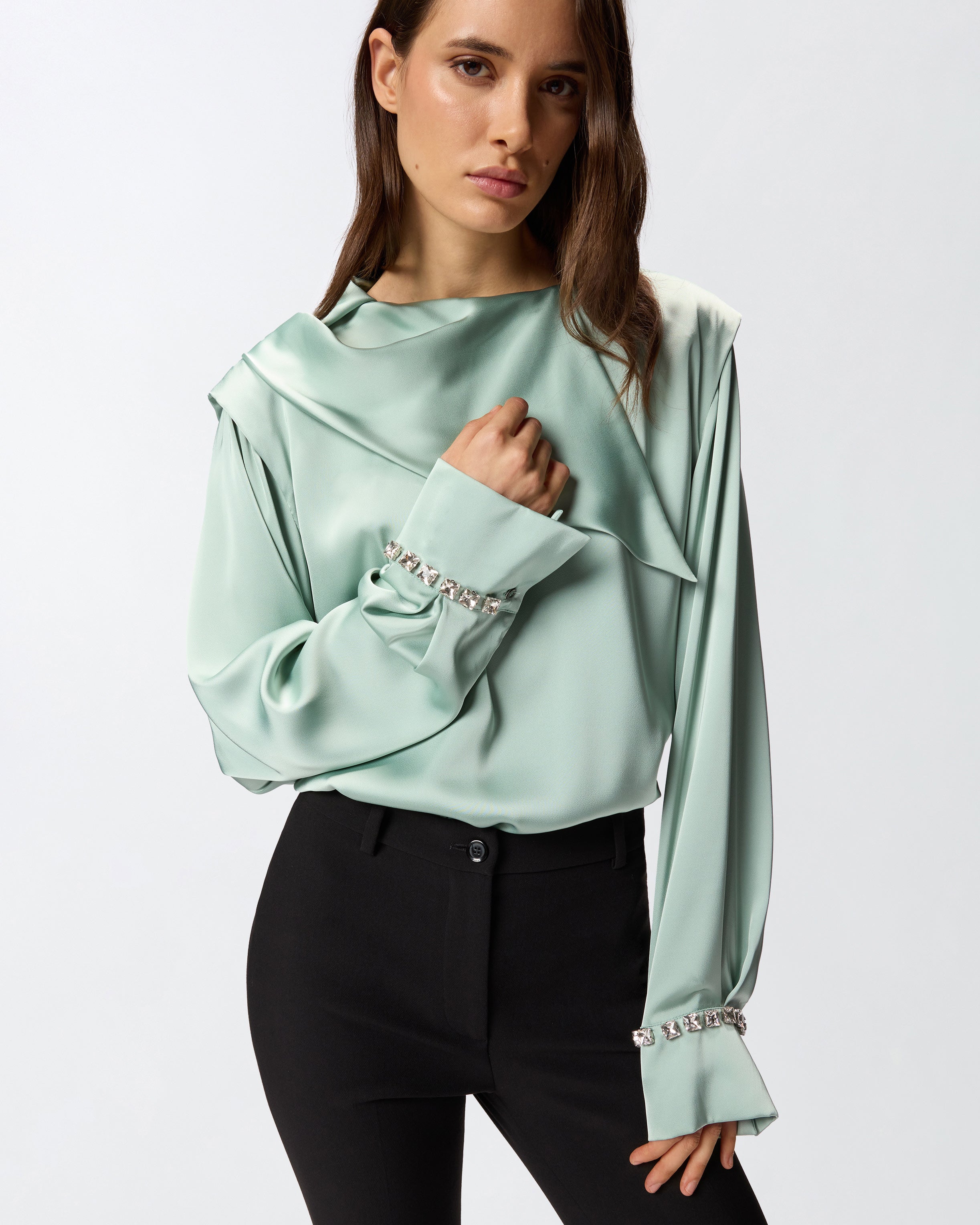 Blusa dalla vestibilità rilassata caratterizzata da maniche lunghe con bottone e da uno scollo drappeggiato asimmetrico che cade sul décolleté con pieghe morbide. Il capo è realizzato in tessuto crêpe satin dall'inconfondibile effetto lucido ed è impreziosito dai ricami gioiello che avvolgono i polsi come preziosi bracciali.