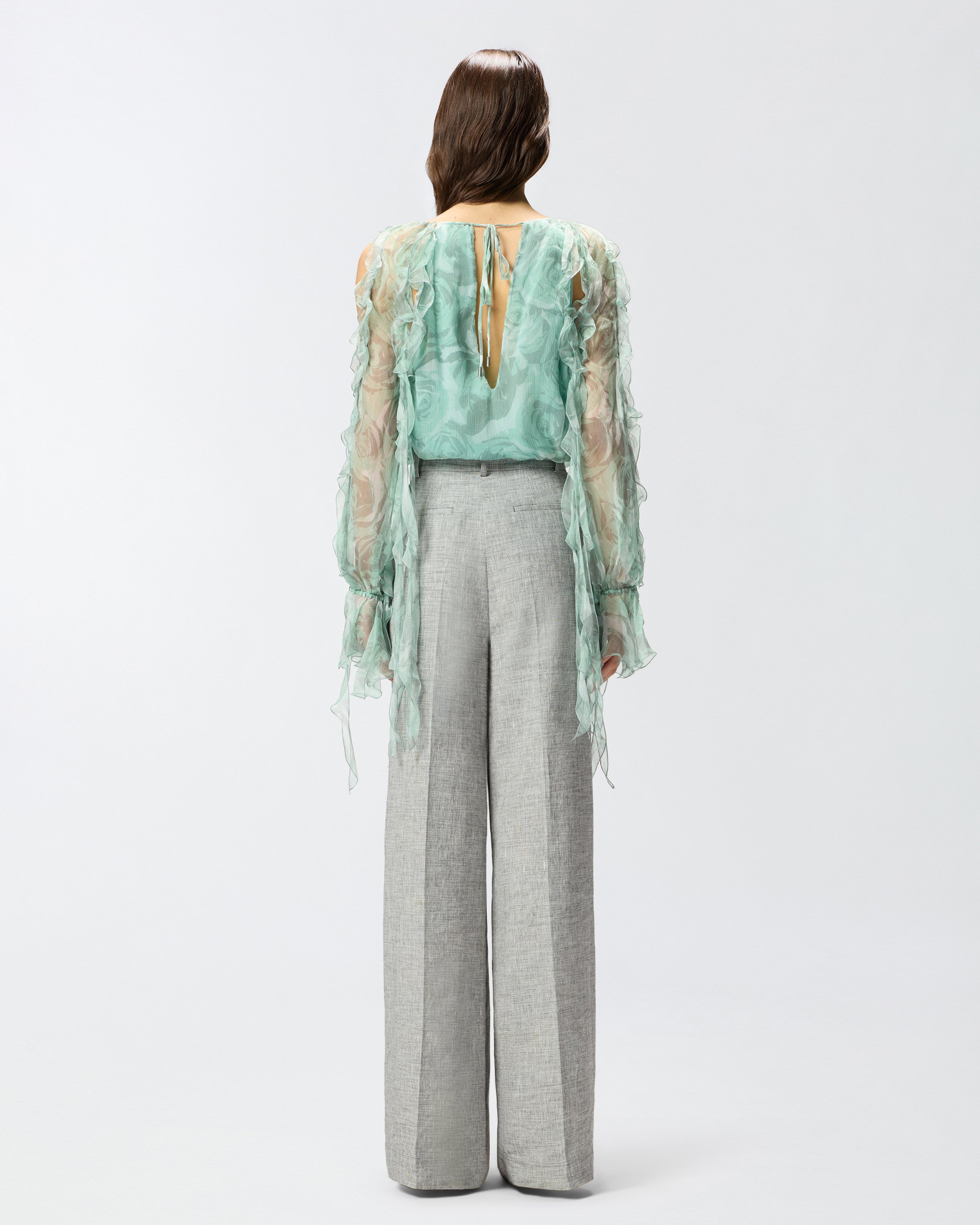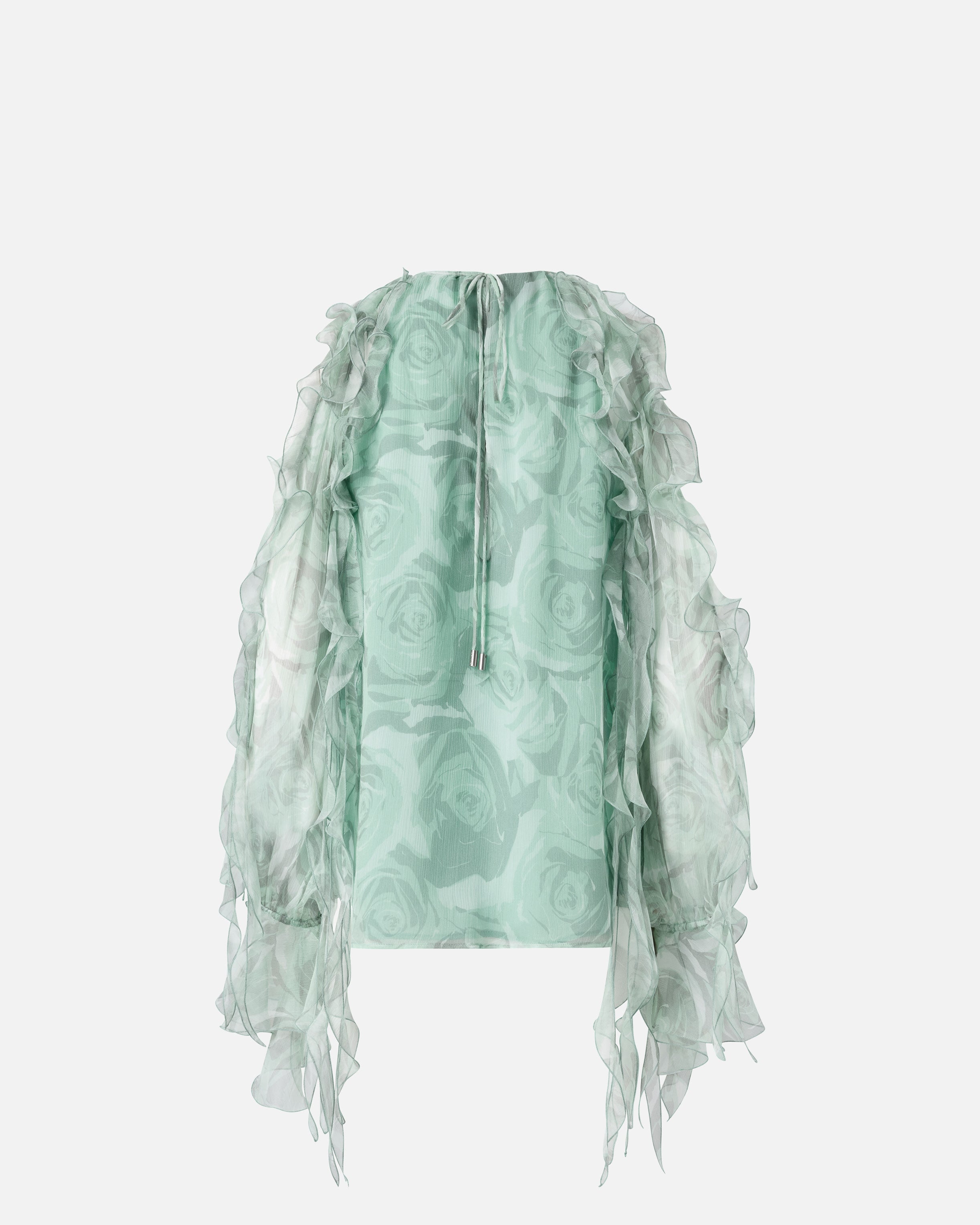Blusa a maniche lunghe con volant fino al polsino e spalle scoperte, caratterizzata da una vestibilità morbida e chiusa sul girocollo da una coulisse con laccetti da annodare per uno styling personalizzato. Il modello è realizzato in leggero creponne di pura seta dall'aspetto increspato, perfetto per conferire un tocco di dinamismo insieme alla stampa rose tono su tono dall'effetto tridimensionale. Le delicate trasparenze e la texture vibrante rendono questo capo estremamente femminile, ideale da indossare per una cerimonia da giorno o un'occasione un po' più formale in cui farsi notare con grazia. - SAIAK BLUSA