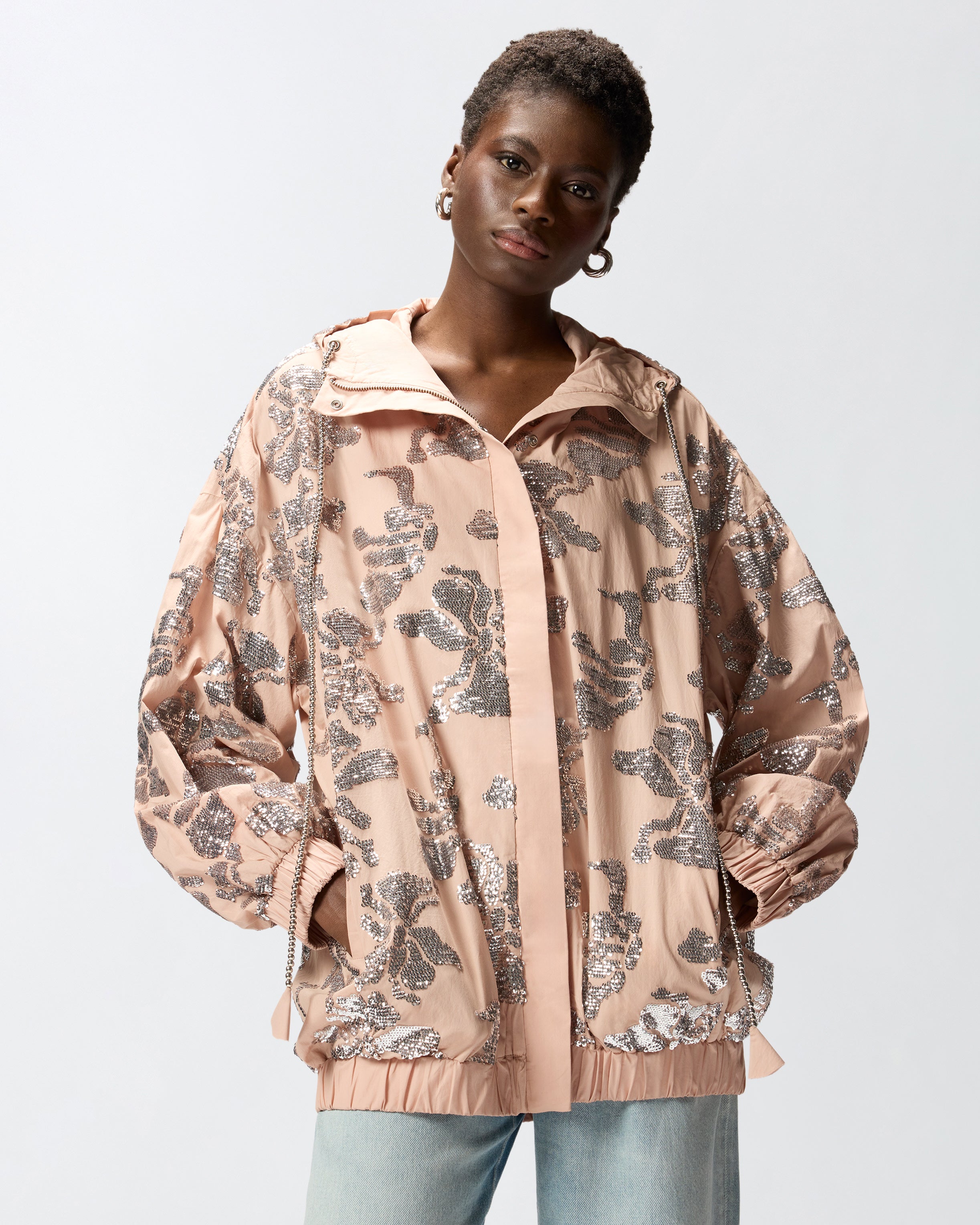 Bomber realizzato in comodo e resistente popeline tecnico, impreziosito su tutta la superficie da un raffinato ricamo floreale in paillettes argentate che dona al capo brillantezza e fascino etereo. Il modello è dotato di polsini e fondo capo elasticizzati, una chiusura con zip nascosta e un cappuccio regolabile tramite coulisse formata da luminose perline con finalino in stoffa. Il perfetto connubio di praticità e glamour rende questo bomber un capo irrinunciabile per chi ama distinguersi con eleganza anche nei look di tutti i giorni.