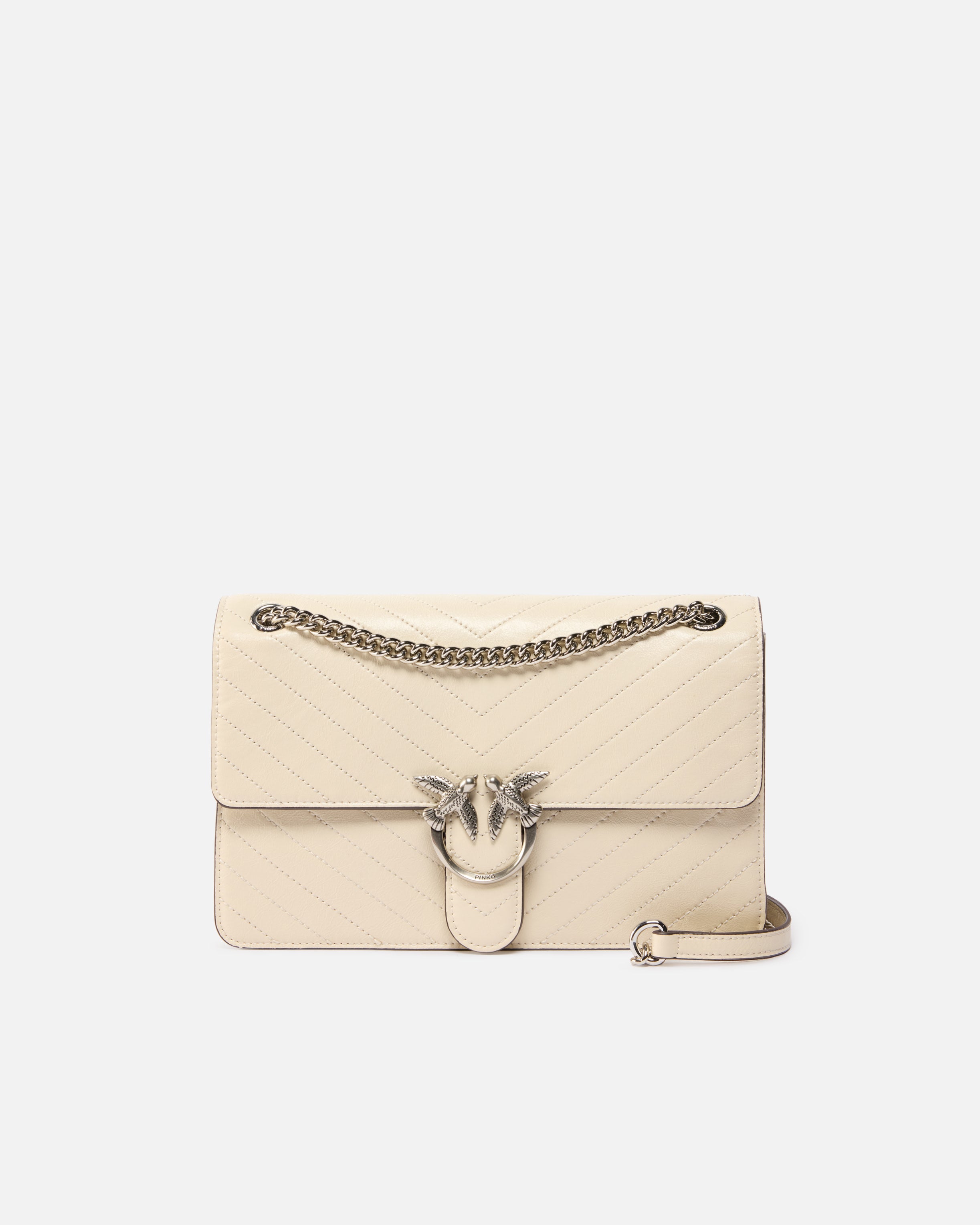 Borsa Love Bag One di medie dimensioni e dalla struttura leggera, realizzata in pelle dalla texture wrinkle e impreziosita da un motivo chevron. Il modello include tracolla a catena con filo tondo e spallaccio in pelle, che permette di ottenere tre diverse opzione di portabilità: a mano, crossbody e a spalla. La borsa risulta contemporanea e raffinata, mentre la fibbia Love Birds Diamond Cut sulla chiusura a baccello si fa portavoce dell'inimitabile stile PINKO. L'interno è foderato in tessuto drill di cotone e include una tasca a parete chiusa con zip. Attiva la tua borsa PINKO: verifica l'autenticità del tuo prodotto e accedi all'esperienza personalizzata avvicinando il tuo smartphone al ricamo Love Birds che trovi sul retro della borsa!