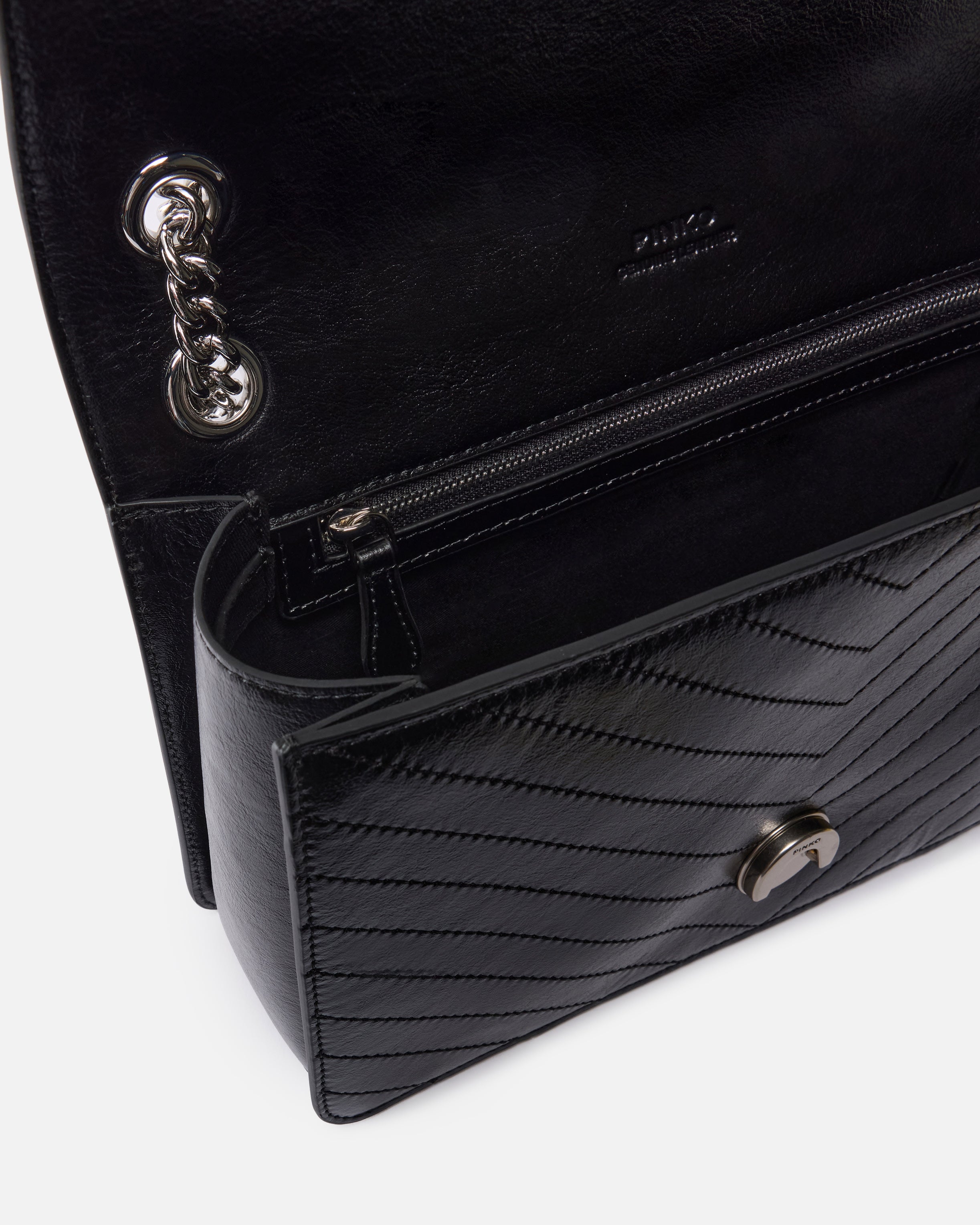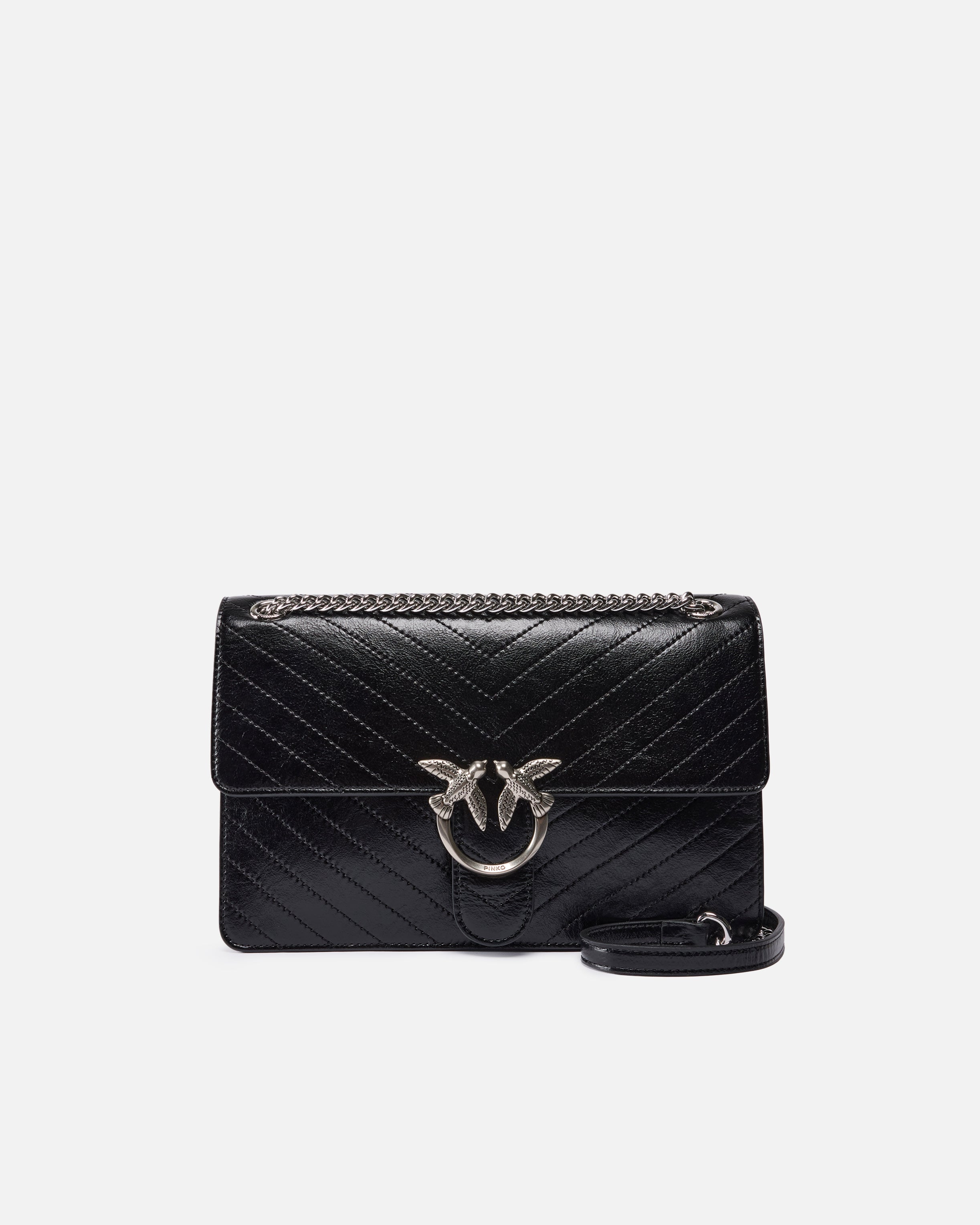Borsa Love Bag One di medie dimensioni e dalla struttura leggera, realizzata in pelle dalla texture wrinkle e impreziosita da un motivo chevron. Il modello include tracolla a catena con filo tondo e spallaccio in pelle, che permette di ottenere tre diverse opzione di portabilità: a mano, crossbody e a spalla. La borsa risulta contemporanea e raffinata, mentre la fibbia Love Birds Diamond Cut sulla chiusura a baccello si fa portavoce dell'inimitabile stile PINKO. L'interno è foderato in tessuto drill di cotone e include una tasca a parete chiusa con zip. Attiva la tua borsa PINKO: verifica l'autenticità del tuo prodotto e accedi all'esperienza personalizzata avvicinando il tuo smartphone al ricamo Love Birds che trovi sul retro della borsa!