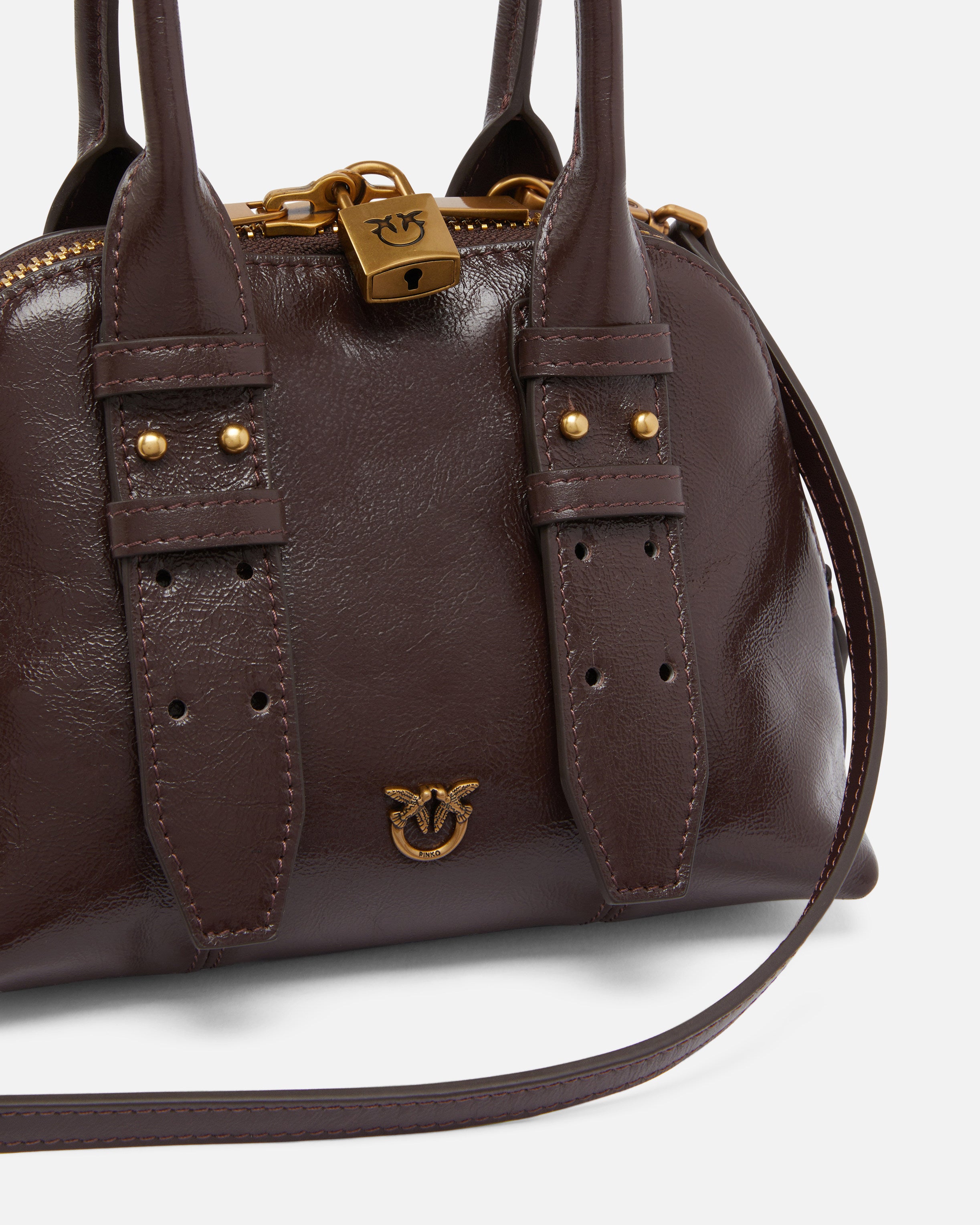 Borsa a mano piccola Escape Bag modello bowling, realizzata interamente in pelle dall'effetto verniciato. Caratterizzata dalla tracolla regolabile e rimovibile in pelle e da un doppio manico per la portata a mano o a spalla, la borsa risulta estremamente versatile e pratica. Il modello presenta un lucchetto funzionale che si apre e chiude grazie a una chiave contenuta nel charm abbinato, mentre il tocco finale è dato dalla piccola placca con logo Love Birds, portavoce dell'inimitabile stile del brand. La chiusura superiore con zip rivela un interno foderato in cotone e dotato di una una multitasca a parete. Attiva la tua borsa PINKO: verifica l'autenticità del tuo prodotto e accedi all'esperienza personalizzata avvicinando il tuo smartphone al ricamo Love Birds che trovi sul retro della borsa!