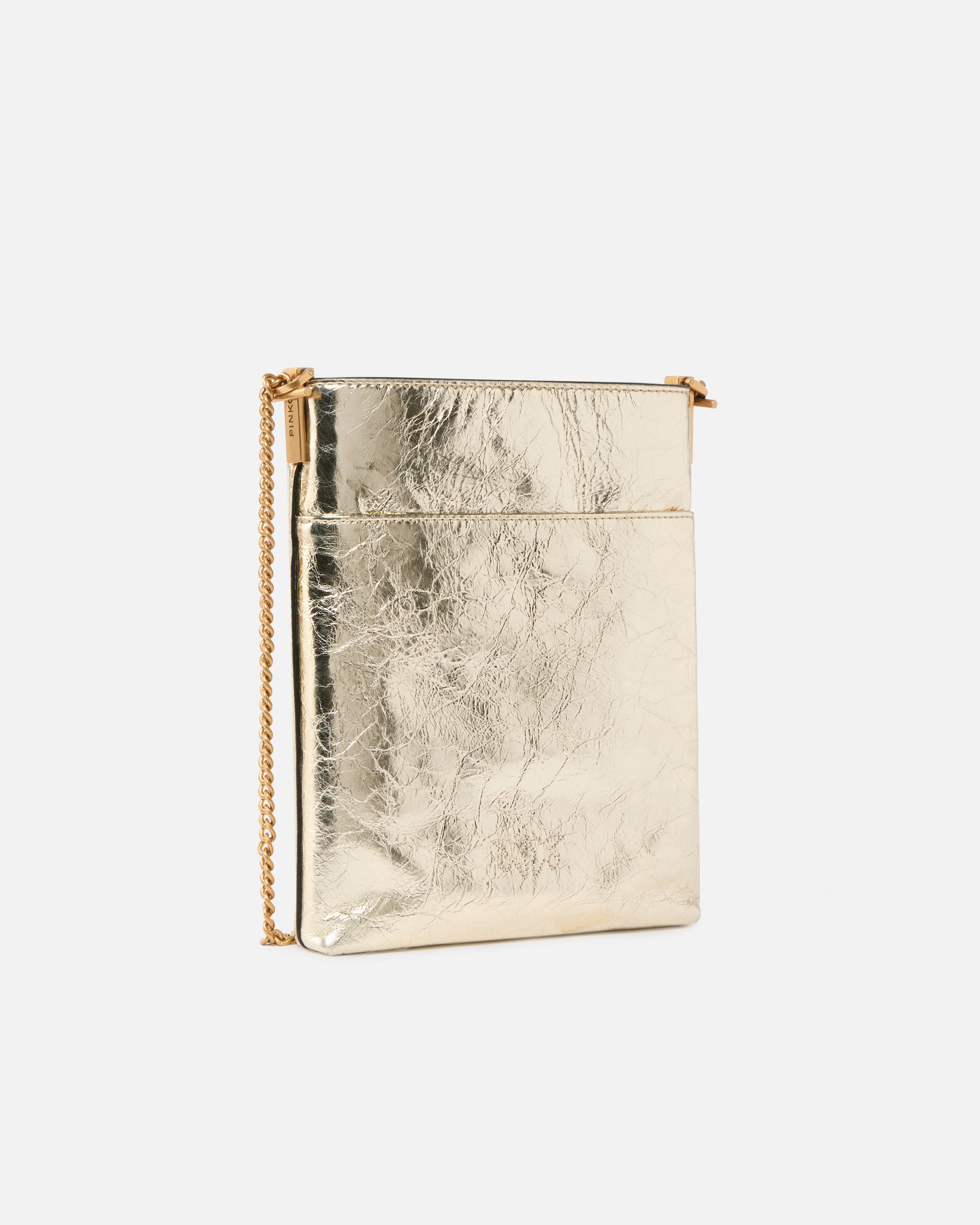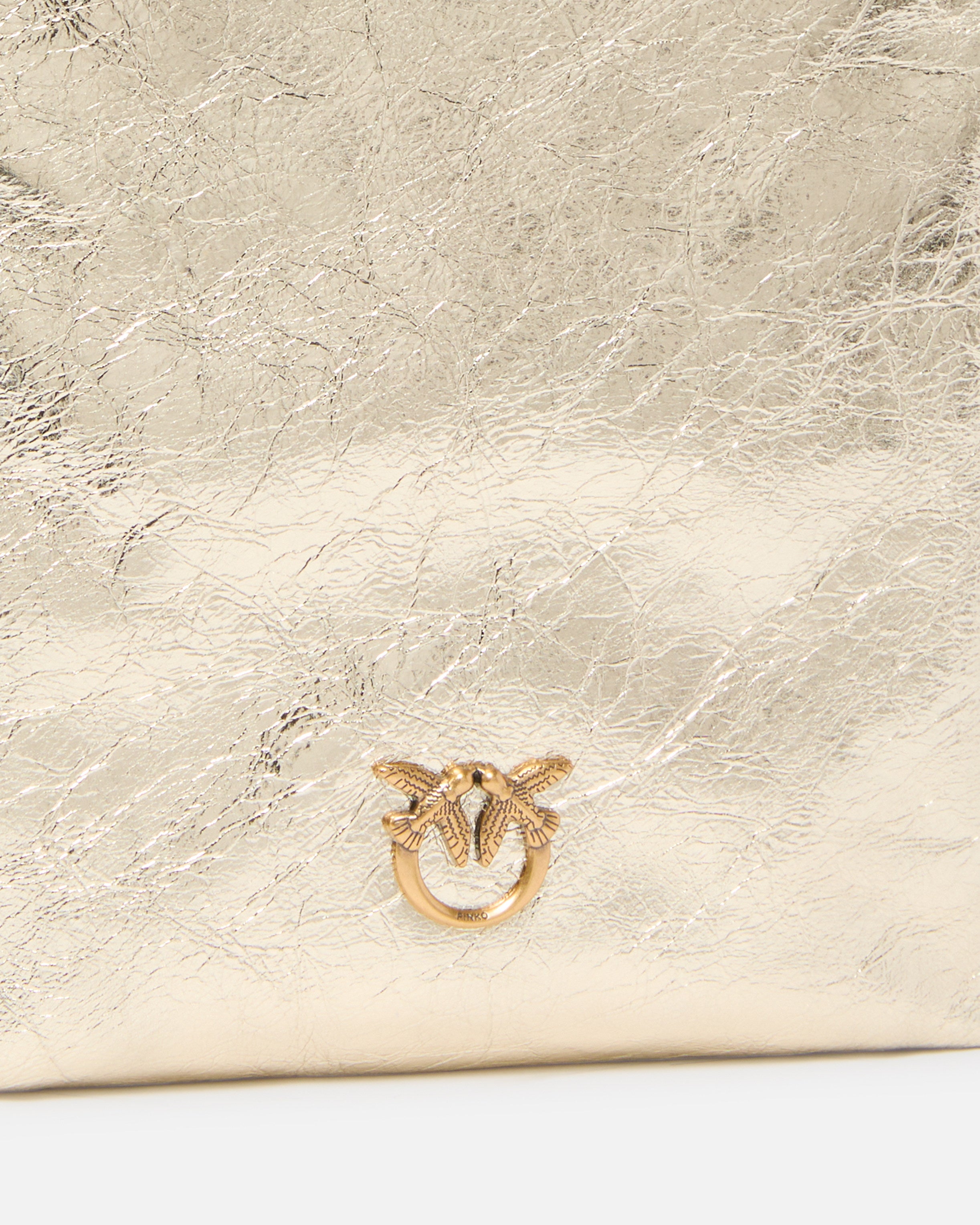 Borsa a mano dalla forma a secchiello piatto realizzata in pelle metallizzata effetto used, dotata di fodera in cotone e sottile tracolla a catena. Il design viene completato dal logo Love Birds, in galvanica resistente color antique gold, che si fa portavoce dell'inimitabile stile del brand. Essenziale e raffinato, questo accessorio è il pezzo mancante dei tuoi look da giorno e non solo. Attiva la tua borsa PINKO: verifica l'autenticità del tuo prodotto e accedi all'esperienza personalizzata avvicinando il tuo smartphone al ricamo Love Birds che trovi sul retro della borsa!