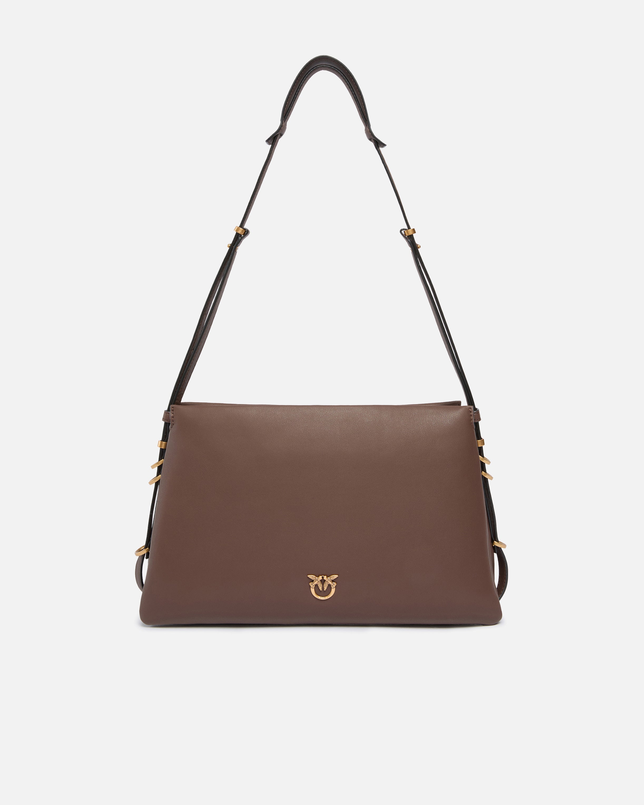 Borsa a tracolla One, Two, Three Bag dalla forma a trapezio in pelle mano seta, caratterizzata da una texture liscia e pregiata. La borsa dalla struttura morbida è costruita con tre diversi scomparti, dei quali quello centrale è chiuso con zip, foderati in cotone, per portare con te tutto quello che ti serve. La tracolla regolabile in pelle è personalizzata con dettagli in metallo alla base, mentre sulla parte frontale della borsa è applicato il logo uccellini Love Birds Diamond Cut. Il design minimalista e i materiali di alta qualità rendono questa borsa adatta sia per occasioni casual che per eventi più formali. Attiva la tua borsa PINKO: verifica l'autenticità del tuo prodotto e accedi all'esperienza personalizzata avvicinando il tuo smartphone al ricamo Love Birds che trovi sul retro della borsa!