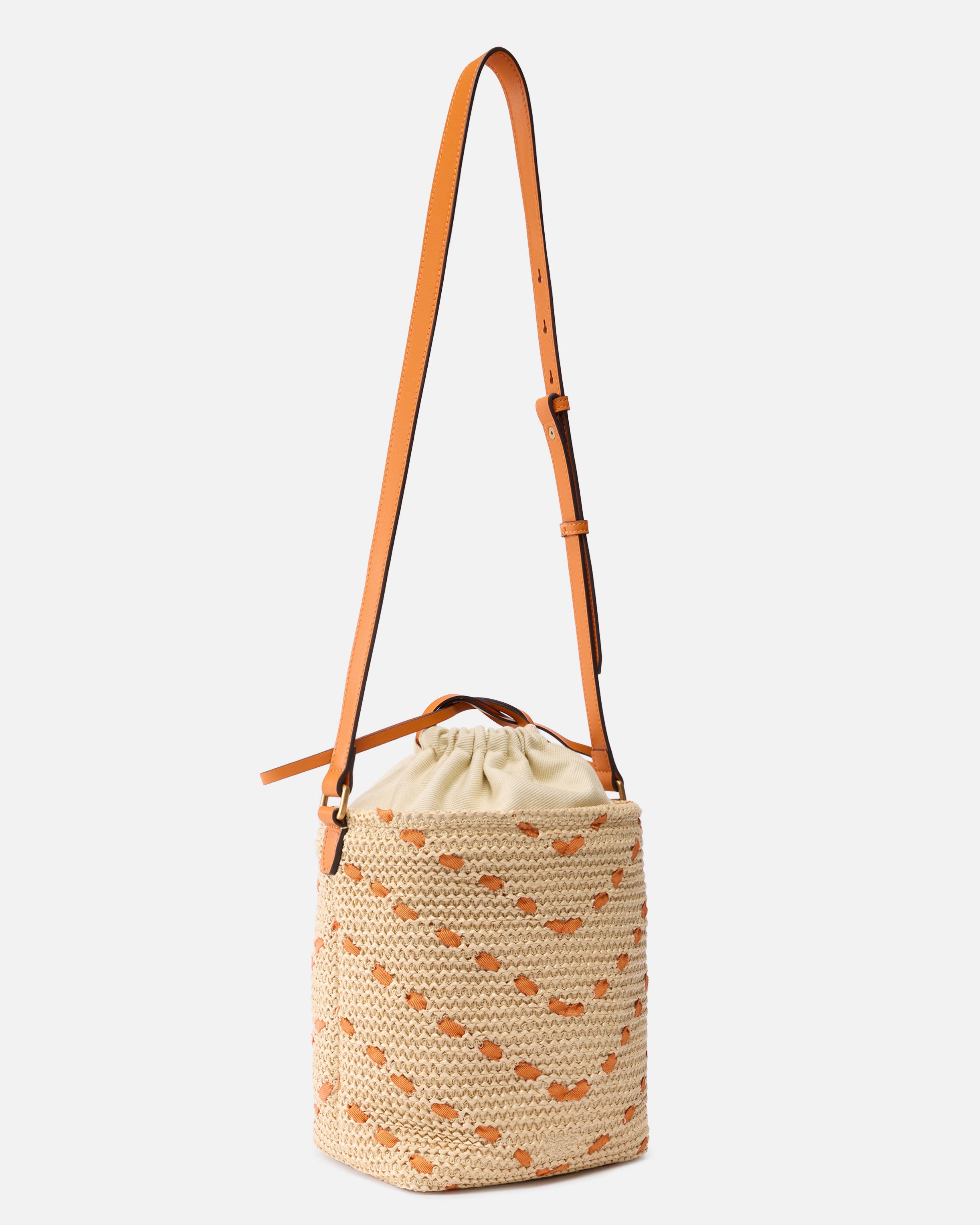 Borsa piccola a secchiello Bucket Mini in rafia intrecciata, dal gusto particolarmente estivo, decorata da un motivo chevron in fettuccia a contrasto e dall'inconfondibile logo metallico Love Birds Diamond Cut sul davanti. L'accessorio è dotato di una tracolla regolabile in pelle per una portabilità a spalla oppure crossbody, e presenta una fodera interna a sacchetto, realizzata in cotone, che può essere regolata tramite la chiusura con coulisse e che rivela una tasca a parete con zip e targhetta logata. Attiva la tua borsa PINKO: verifica l'autenticità del tuo prodotto e accedi all'esperienza personalizzata avvicinando il tuo smartphone al ricamo Love Birds che trovi sul retro della borsa!