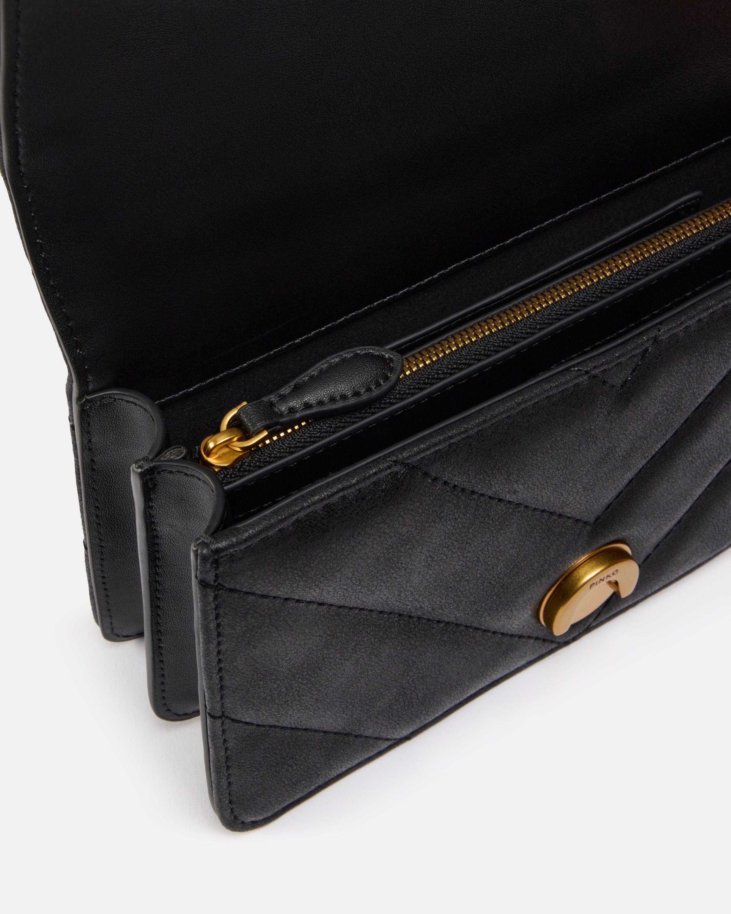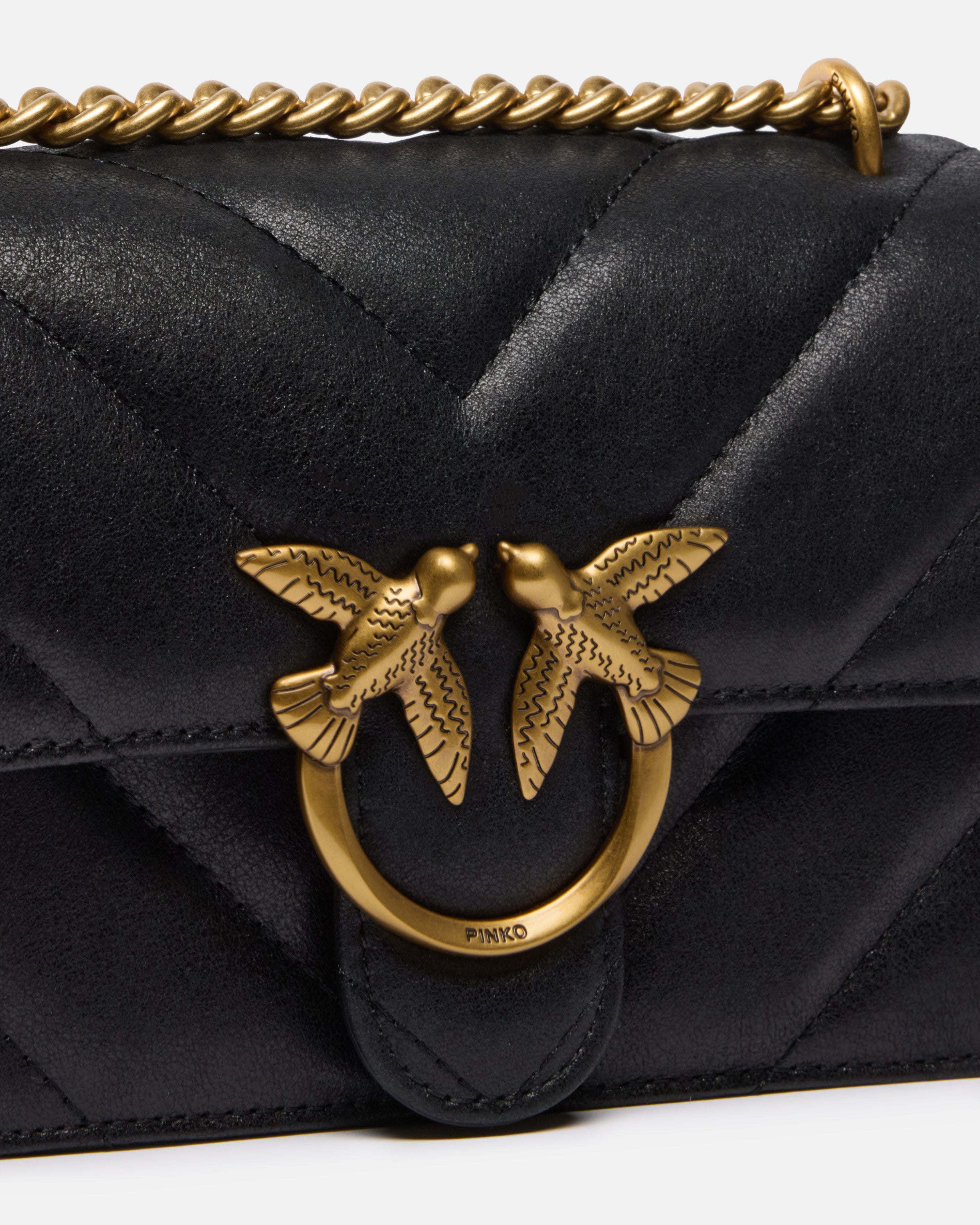 Borsa a tracolla dalle piccole dimensioni Mini Love Bag in pelle dal particolare effetto used, con dettagli che appaiono come consumati dall'uso, trapuntata con disegno chevron a punta. La tracolla scorrevole con spallaccio regolabile in pelle può essere doppiata per poter indossare la borsetta anche a spalla, oltre che a tracolla. La chiusura con patta è personalizzata con l'iconica fibbia Love Birds Diamond Cut, mentre l'interno della borsa è foderato in microfibra effetto scamosciato e include una pratica tramezza chiusa con zip e una tasca a parete in pelle, per una migliore organizzazione dello spazio interno. La mini borsa Love Bag completa i tuoi look quotidiani con un tocco originale e di stile che non passa di certo inosservato. Attiva la tua borsa PINKO: verifica l'autenticità del tuo prodotto e accedi all'esperienza personalizzata avvicinando il tuo smartphone al ricamo Love Birds che trovi sul retro della borsa!