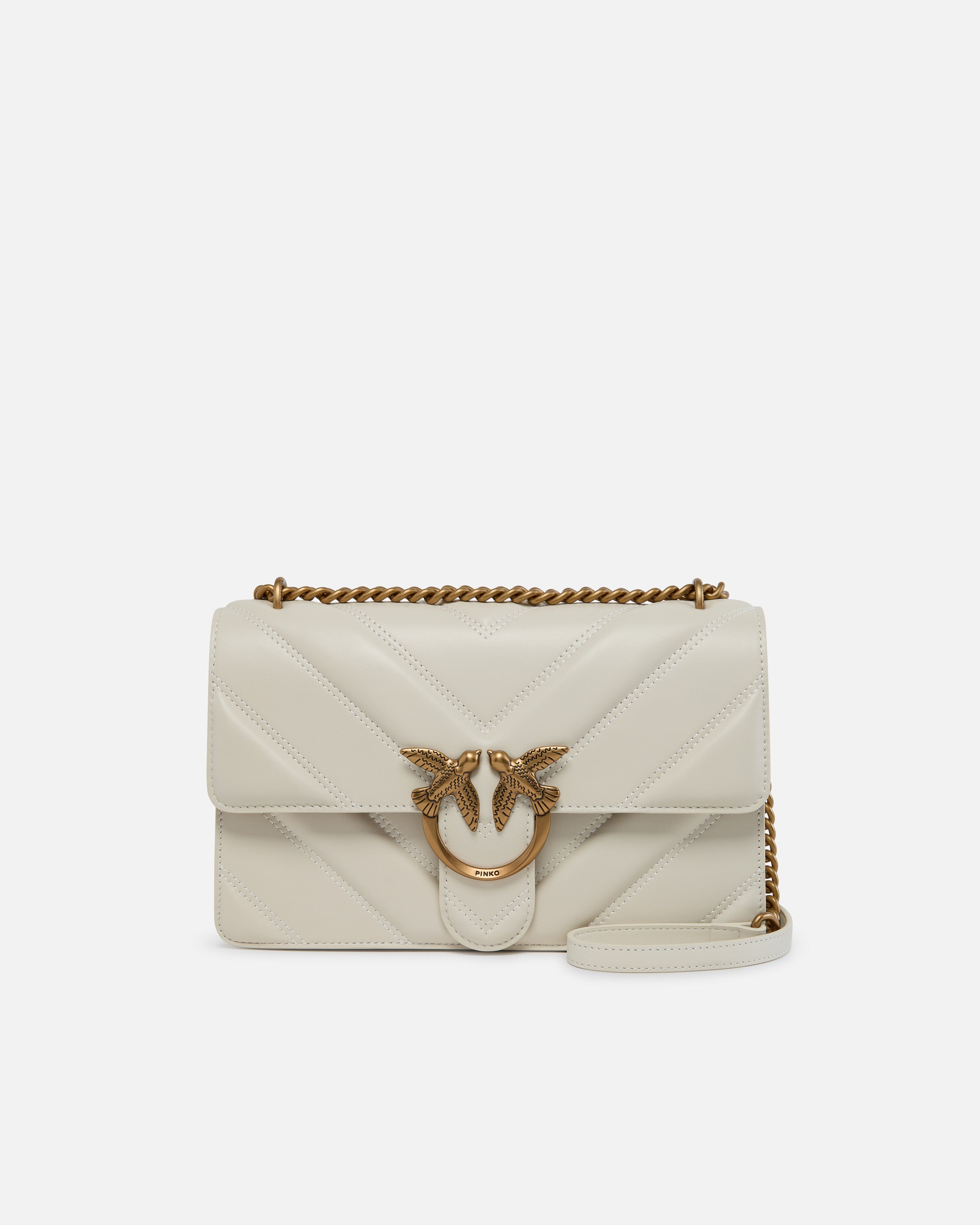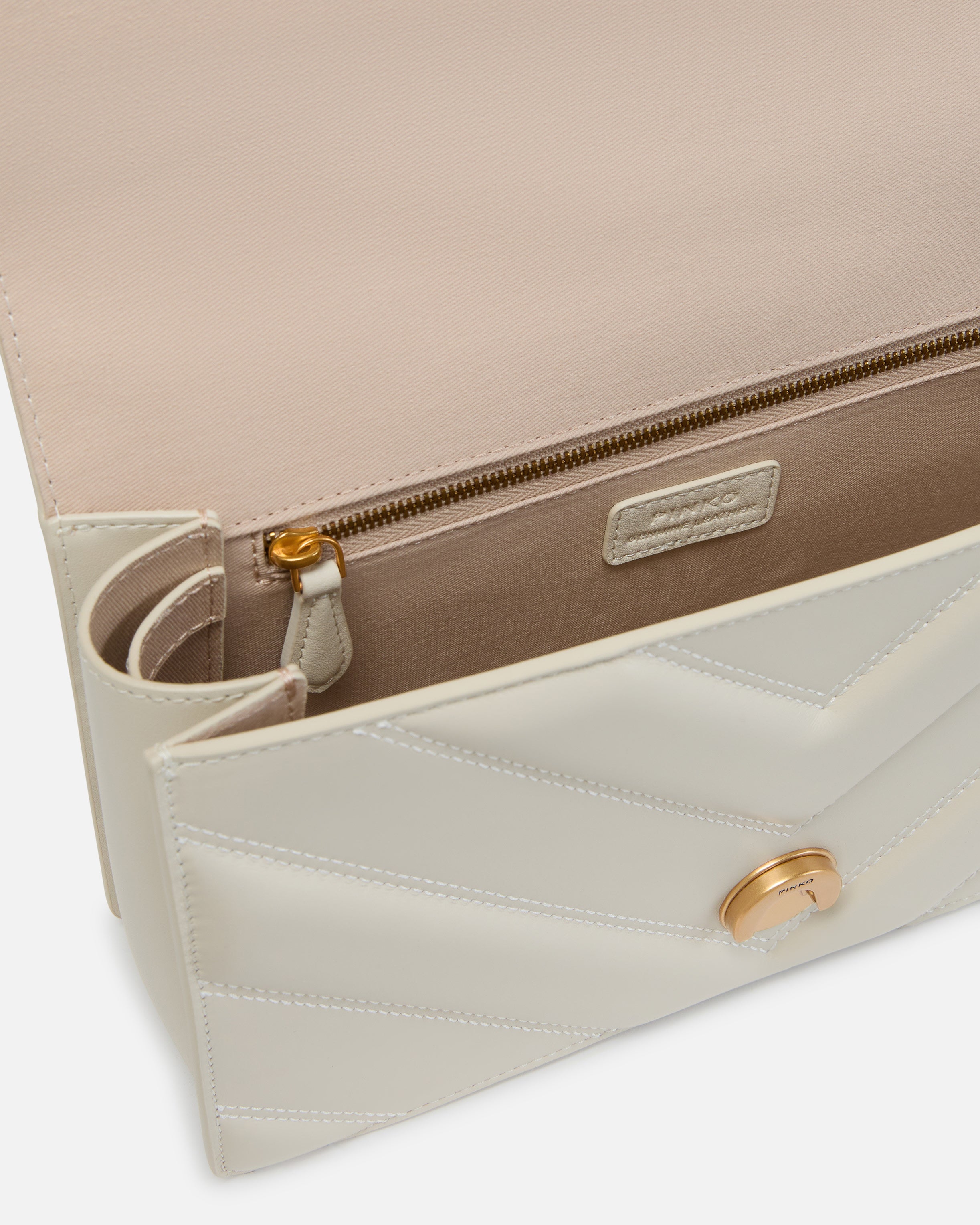 Borsa grande a tracolla Love Bag in nappa con intarsio in rilievo che crea un effetto trapuntato con disegno chevron, dal caratteristico pattern a V. La tracolla scorrevole, che combina la classica catena in metallo allo spallaccio in pelle, permette di portare la borsa sia a tracolla che a spalla, doppiandola. L'interno della borsa è foderato in tessuto drill di cotone e include una tasca a parete chiusa con zip. La borsa ha una struttura semirigida, perfetta per una portata quotidiana, e la personalizzazione con la fibbia con logo uccellini Love Birds aggiunge un tocco iconico a uno dei modelli di punta della nuova collezione. Attiva la tua borsa PINKO: verifica l'autenticità del tuo prodotto e accedi all'esperienza personalizzata avvicinando il tuo smartphone al ricamo Love Birds che trovi sul retro della borsa!