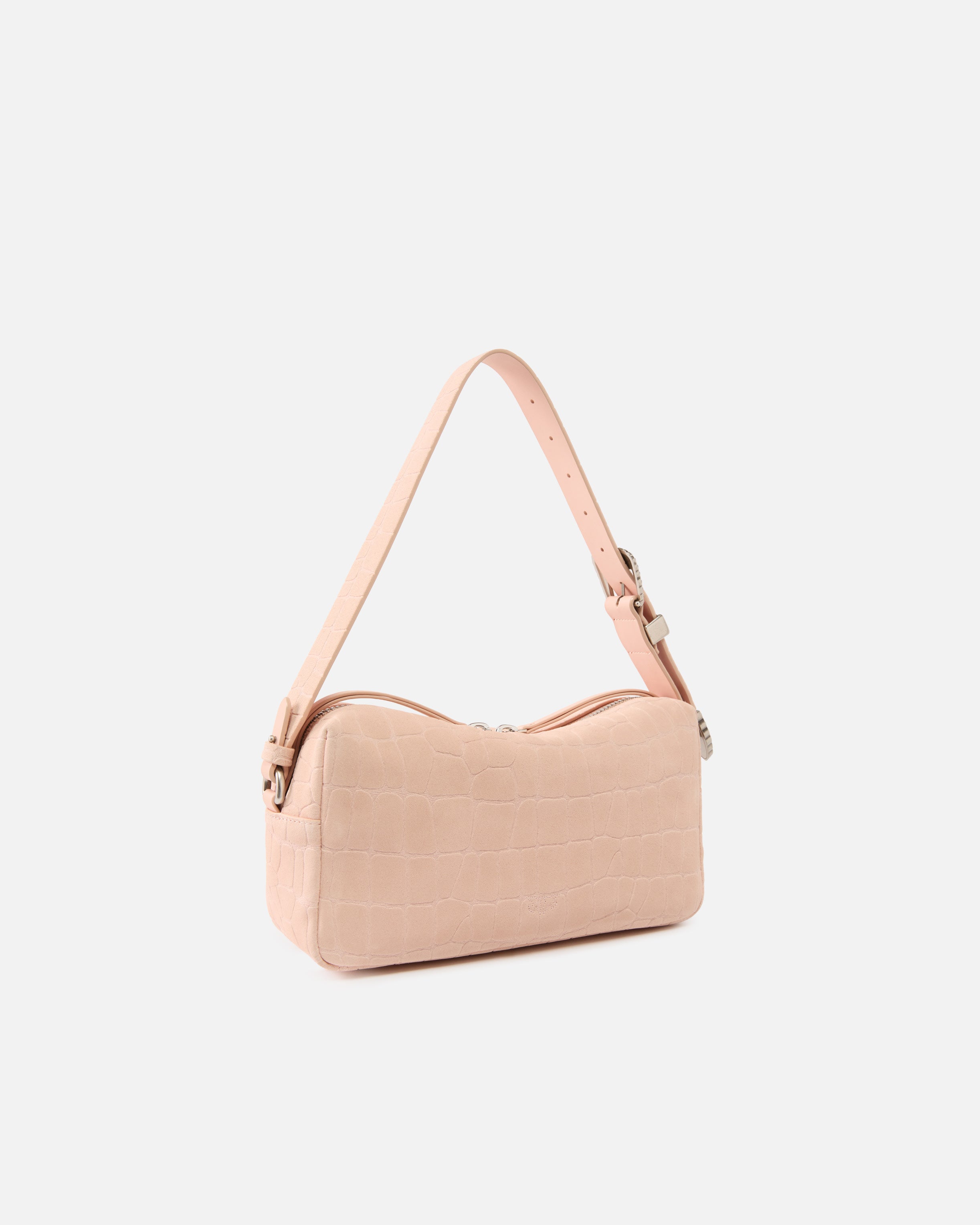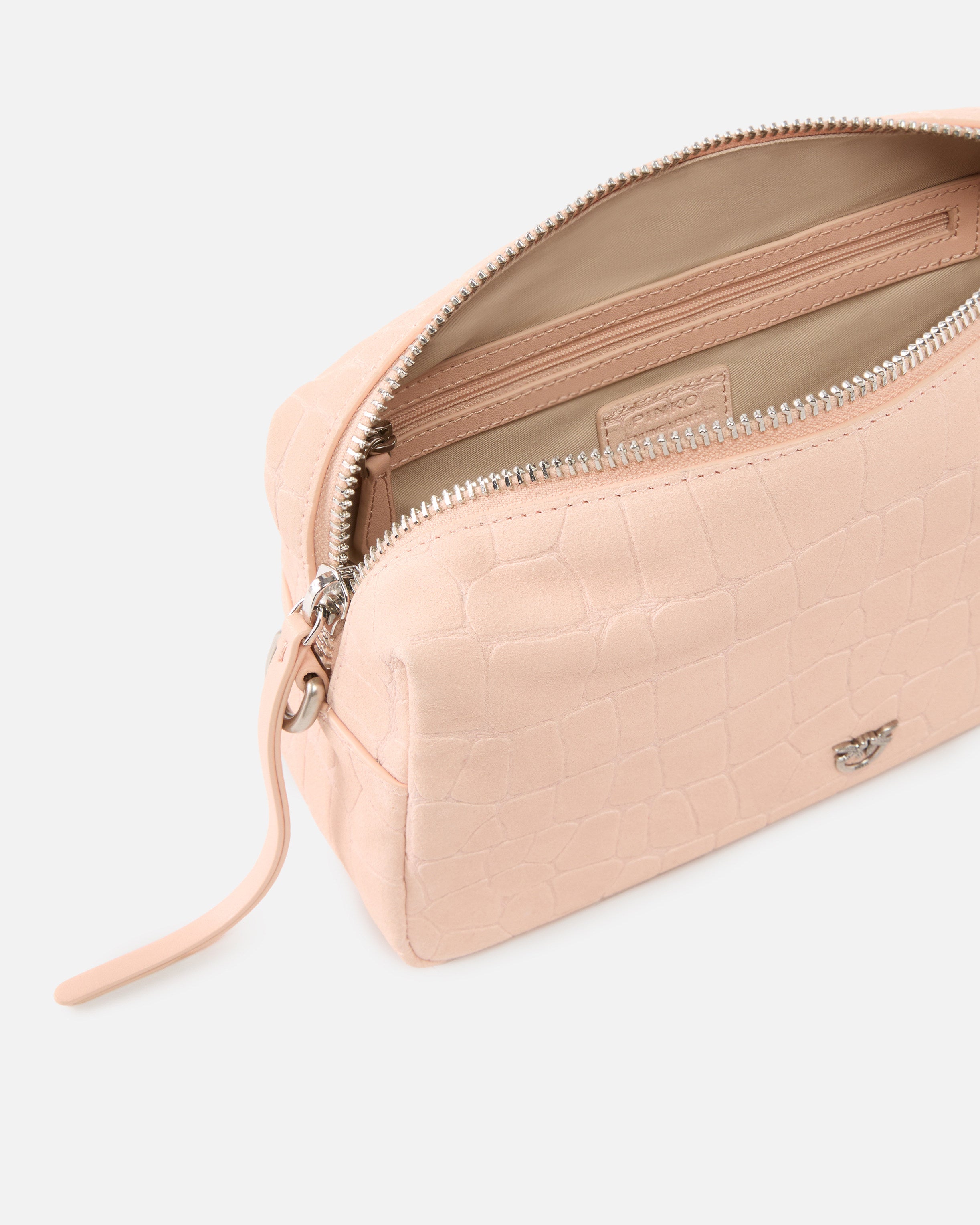 Borsa di medie dimensioni dal caratteristico design rettangolare a bauletto, realizzata in morbida pelle nabuk con un'accattivante stampa coccodrillo all over e personalizzata dall'iconico logo metallico Love Birds Diamond Cut sul davanti. La borsa può essere indossata a spalla, crossbody oppure a mano grazie alla tracolla più lunga in pelle rimovibile, e alla tracolla più corta in pelle nabuk stampata, anch'essa rimovibile, decorata da una minuziosa lavorazione d'ispirazione western sull'estremità e sulla fibbia con passante in metallo. La chiusura con zip a doppio cursore rivela un interno foderato in tessuto drill di cotone con tasca a parete con zip ed etichetta logata. Attiva la tua borsa PINKO: verifica l'autenticità del tuo prodotto e accedi all'esperienza personalizzata avvicinando il tuo smartphone al ricamo Love Birds che trovi sul retro della borsa!