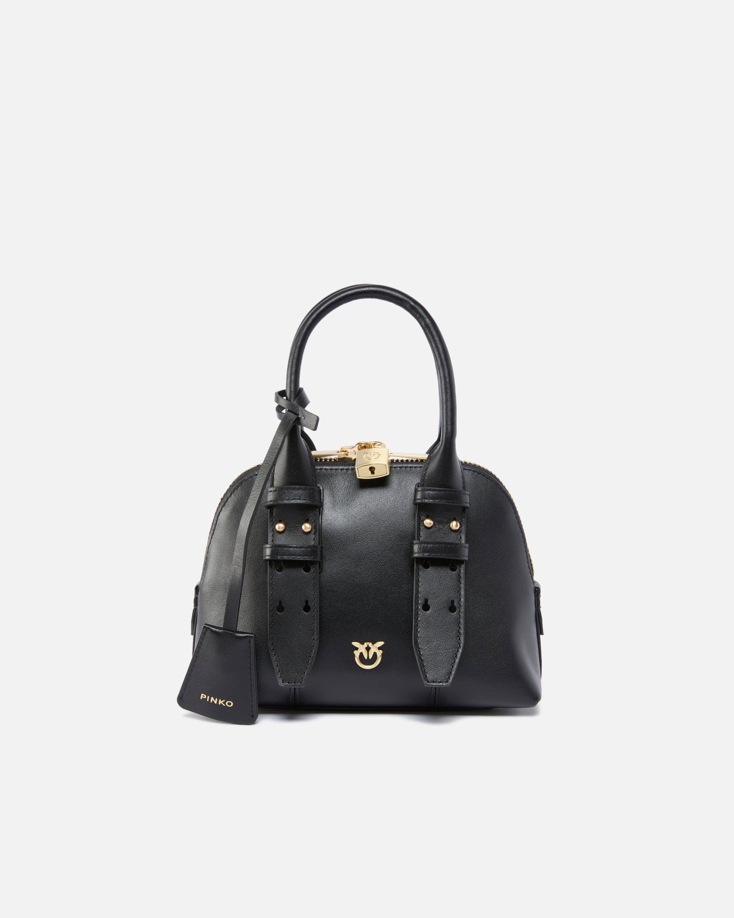 Borsa bowling a mano Mini Escape Bag dalle piccole dimensioni in morbida pelle, dotata di fodera in cotone e tasca a parete completa di portacarte. Caratterizzata dalla tracolla regolabile in pelle e da un doppio manico per la portata a mano o a spalla, la borsa risulta estremamente versatile e pratica. La chiusura superiore con zip a doppio cursore è personalizzata con un dettaglio inedito: un lucchetto decorato dall'iconico logo Love Birds che può essere aperto e chiuso grazie alla chiave contenuta nel charm in pelle che completa la borsa. Attiva la tua borsa PINKO: verifica l'autenticità del tuo prodotto e accedi all'esperienza personalizzata avvicinando il tuo smartphone al ricamo Love Birds che trovi sul retro della borsa!