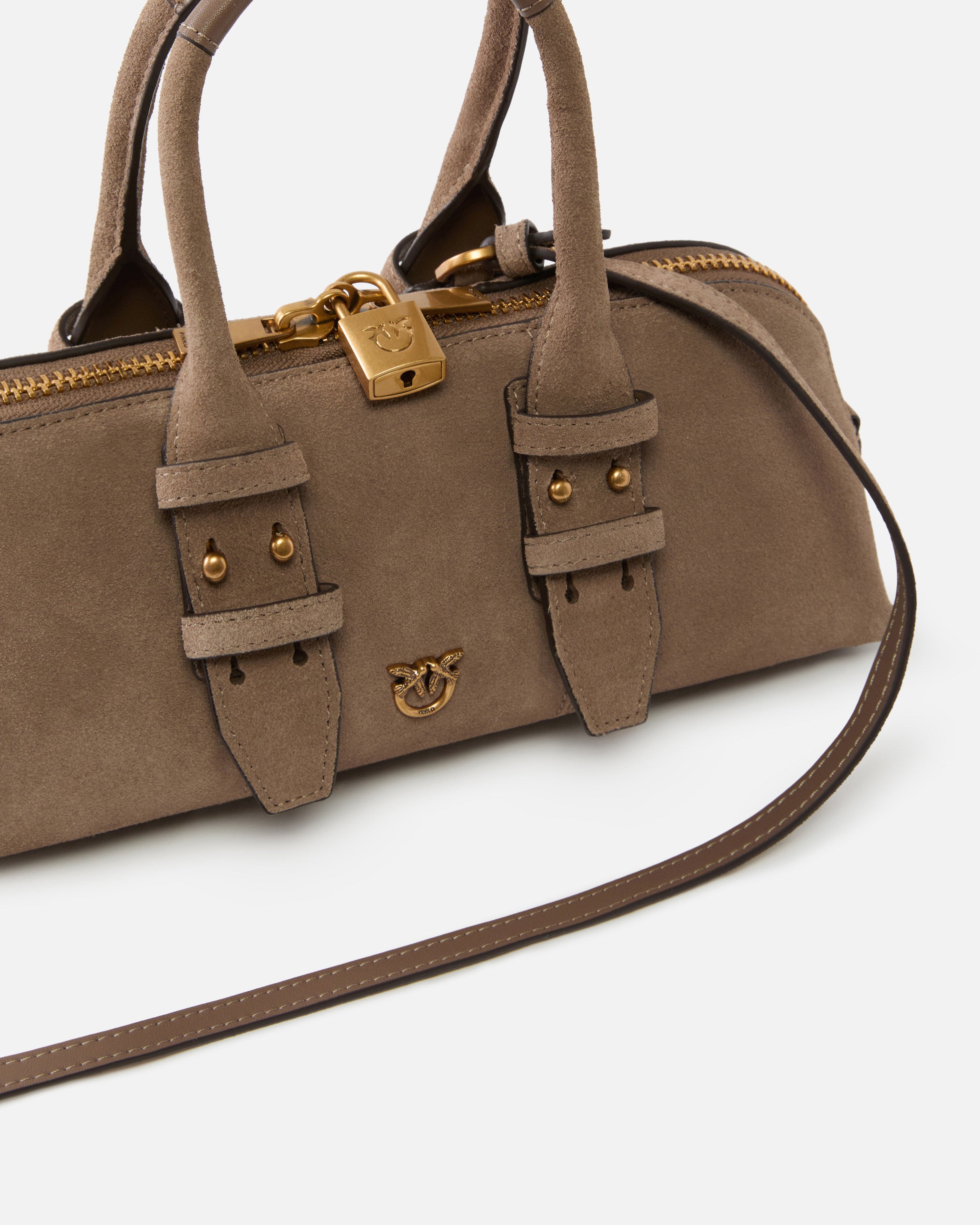 Borsa Escape Bag piccola in pelle scamosciata con rifiniture in pelle liscia dalla mano seta, contraddistinta da un'elegante silhouette rettangolare e allungata. Caratterizzata da un doppio manico per la portata a mano o a spalla, questa borsa è un alleato perfetto per qualsiasi occasione. Il modello presenta un lucchetto funzionale che si apre e chiude grazie a una chiave contenuta nel charm abbinato, mentre il tocco finale è dato dalla piccola placca con logo Love Birds, portavoce dell'inimitabile stile del brand. Attiva la tua borsa PINKO: verifica l'autenticità del tuo prodotto e accedi all'esperienza personalizzata avvicinando il tuo smartphone al ricamo Love Birds che trovi sul retro della borsa! - BOWLING BAG HORIZONTAL SUEDE