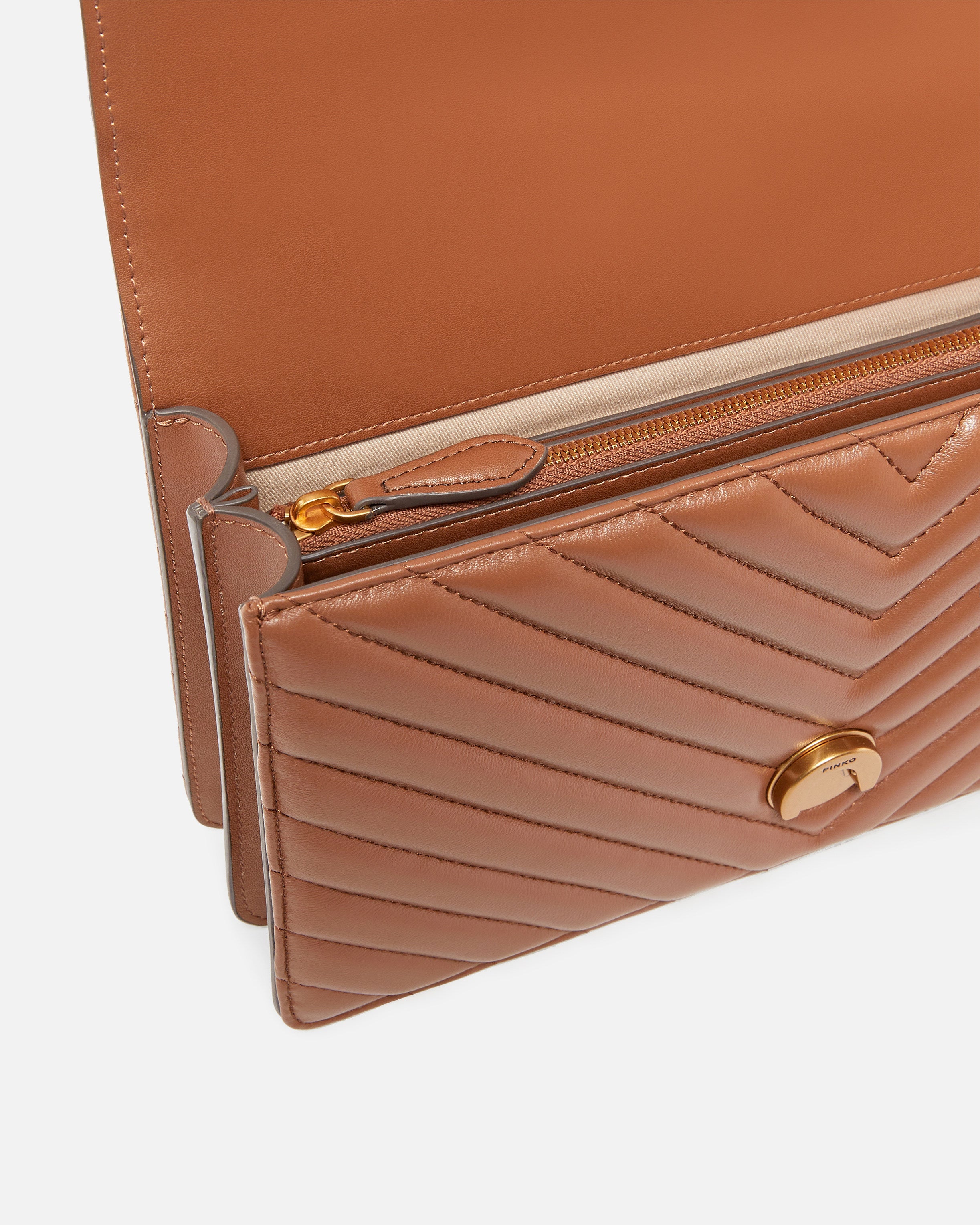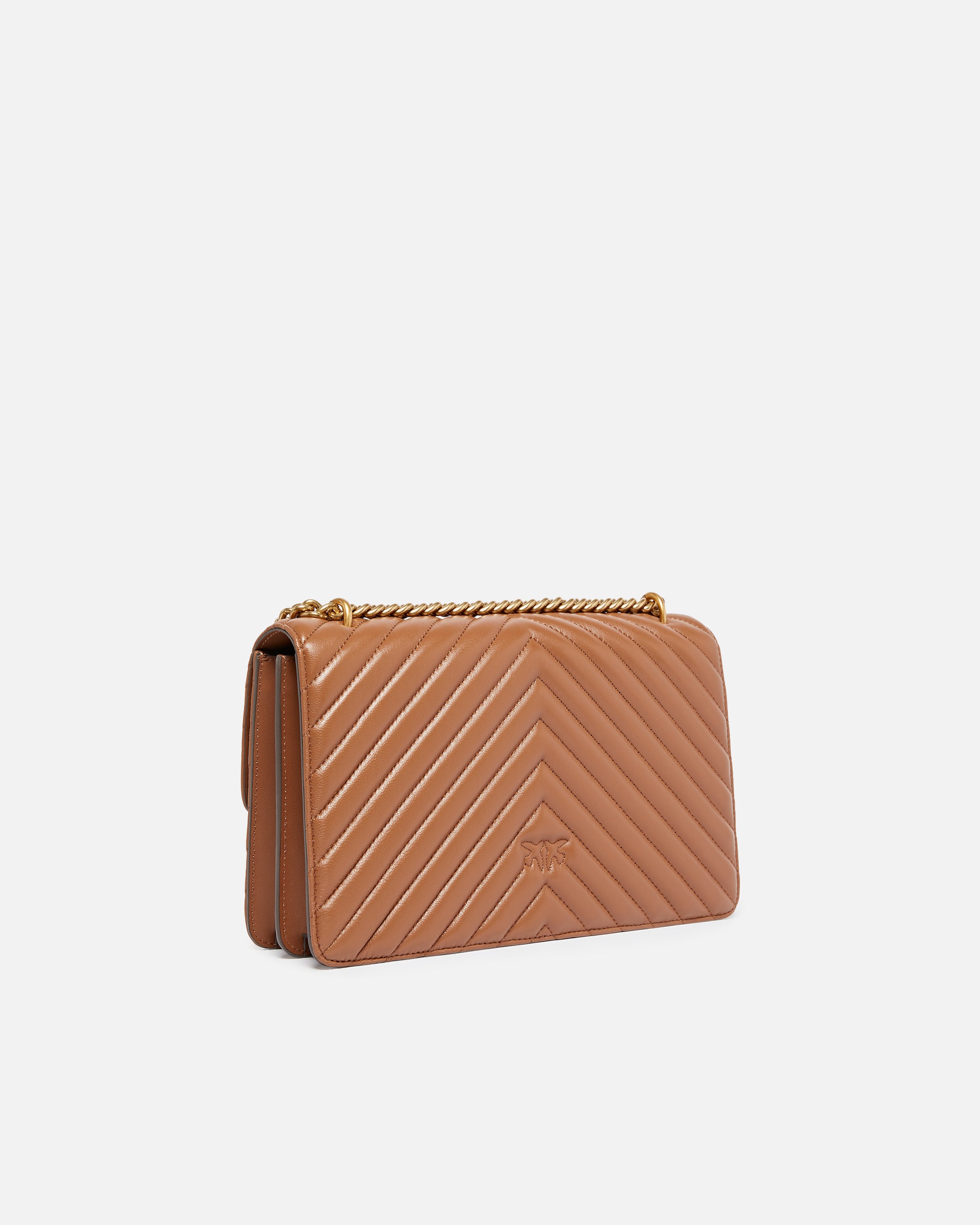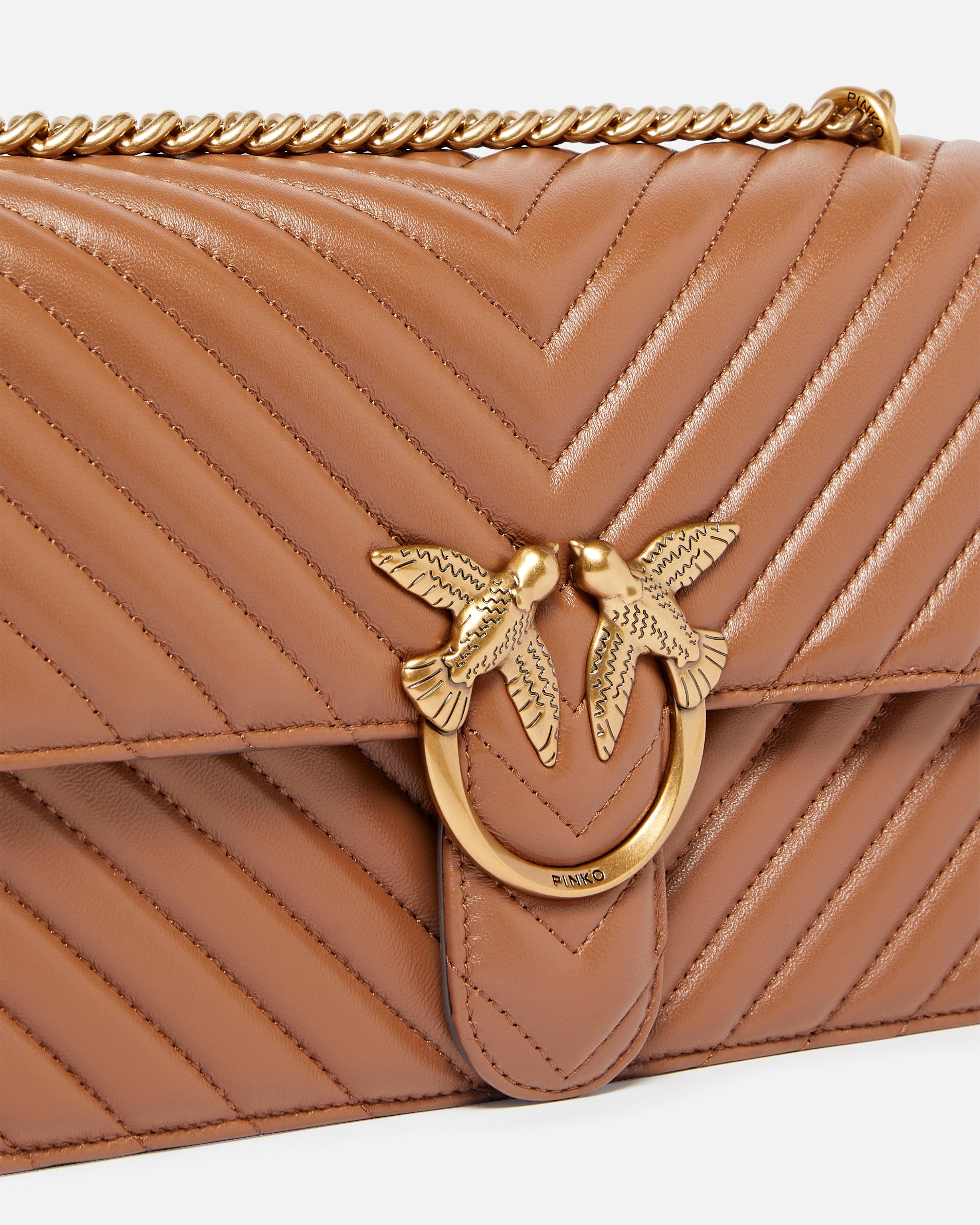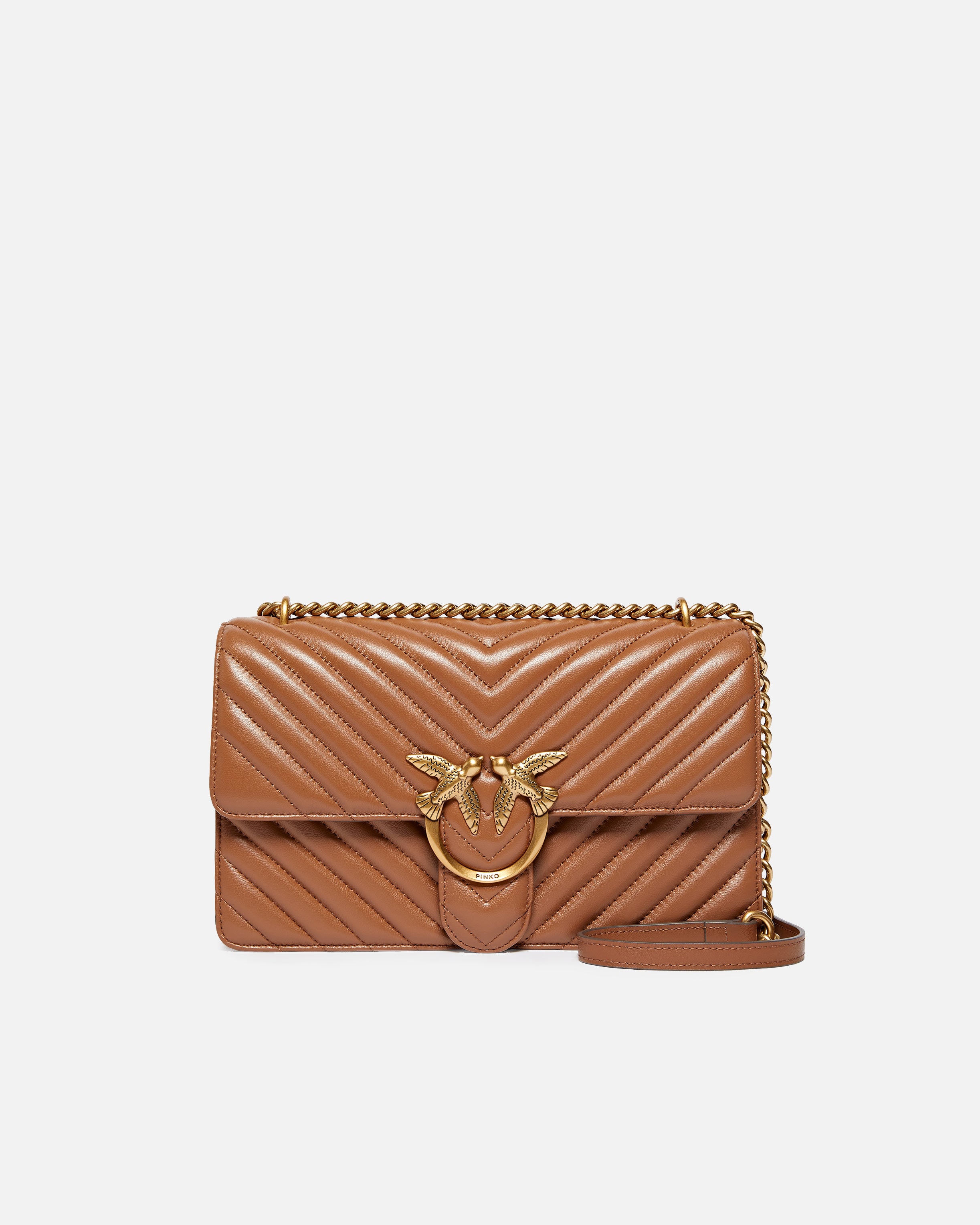 Classic Love Bag One in nappa trapuntata con motivo chevron. La chiusura è completata dall'iconica fibbia Love Birds Diamond Cut in metallo. L'interno è foderato in microfibra scamosciata e comprende tramezza chiusa con zip e tasca a parete in pelle. La tracolla combina la classica catena rotonda al pratico spallaccio in pelle regolabile.