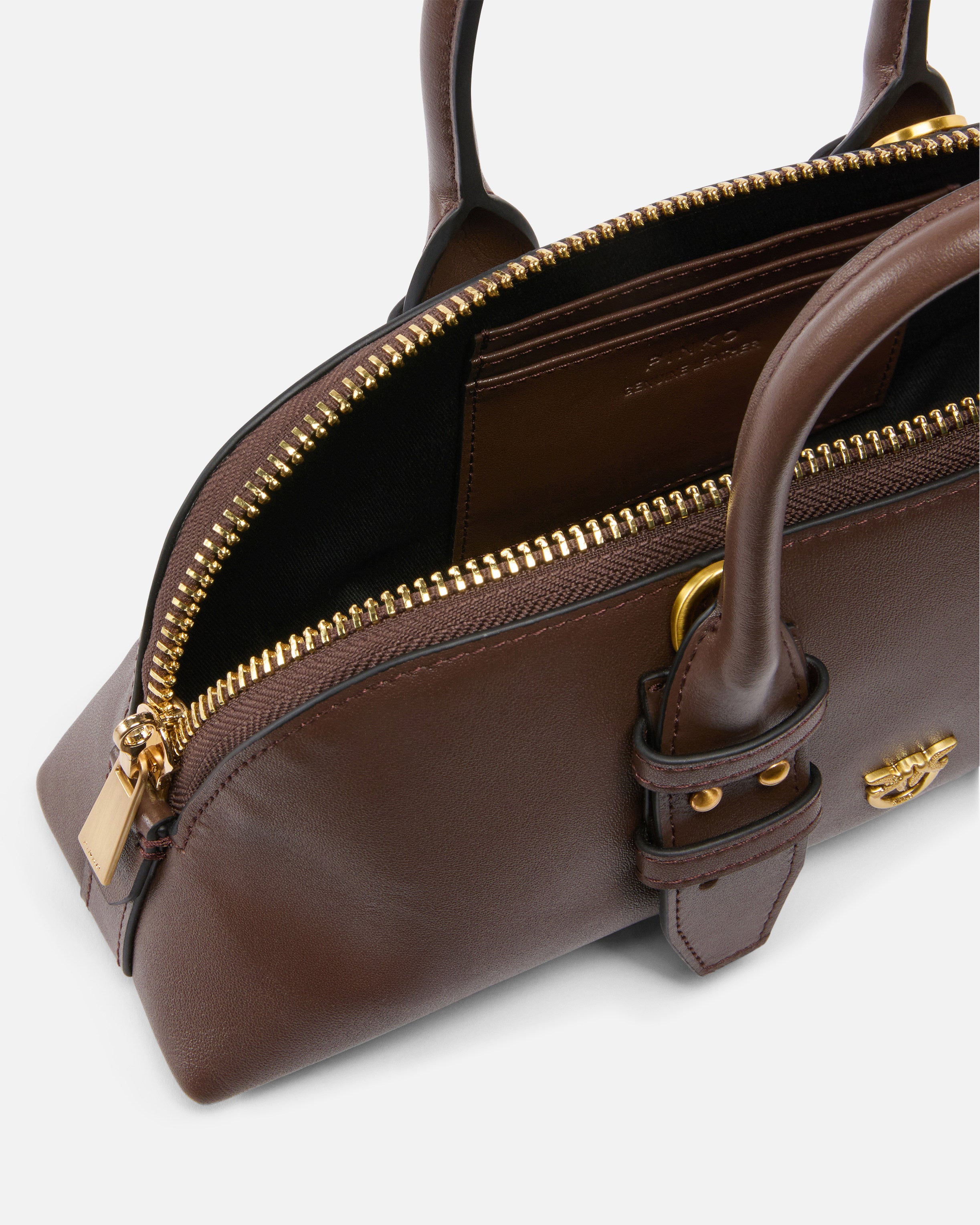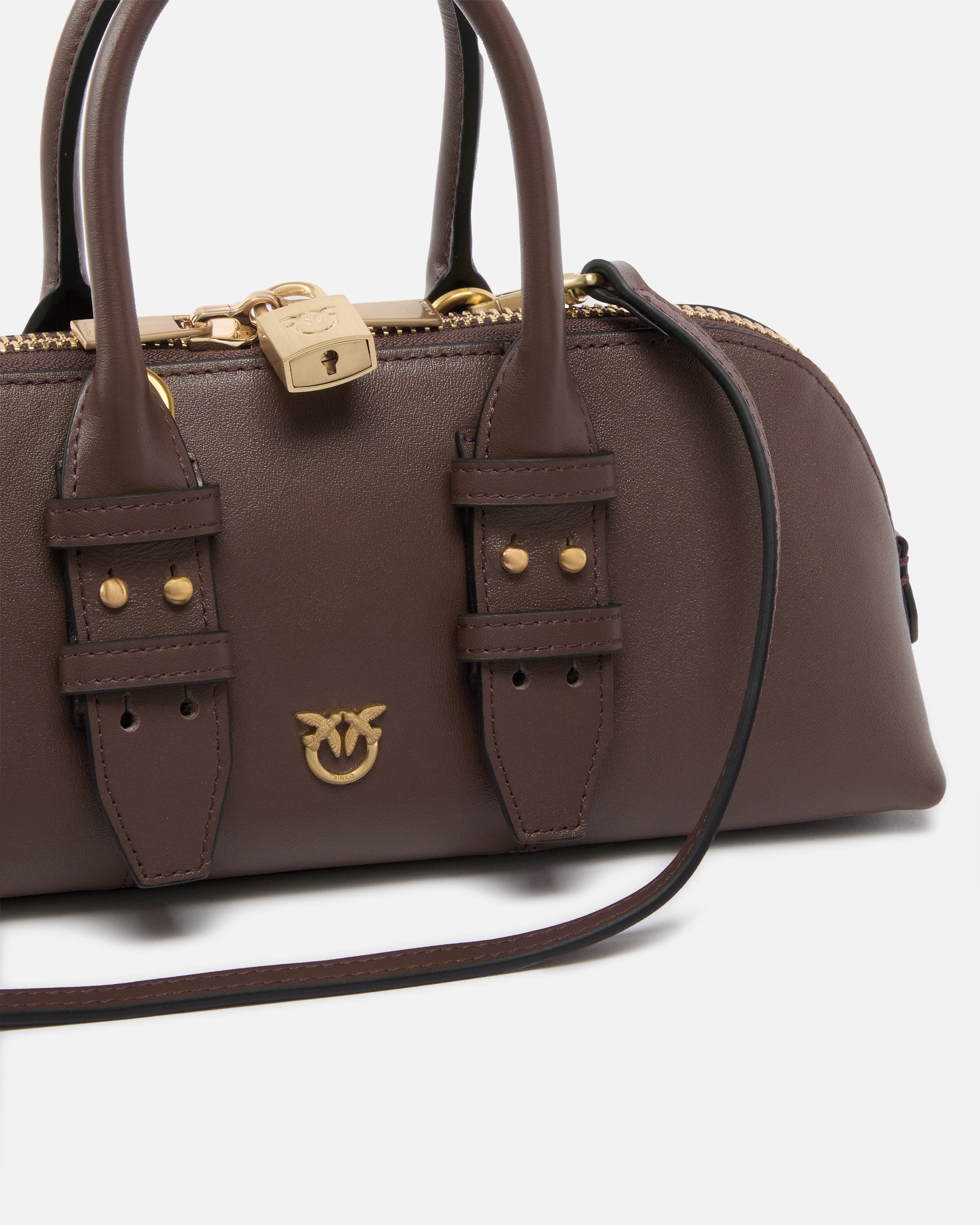 Borsa bowling Escape Bag dalle piccole dimensioni in morbida pelle, dotata di fodera in cotone e tasca a parete completa di portacarte. Caratterizzata dalla tracolla regolabile e rimovibile in pelle e dal manico per la portata a mano o a spalla, la borsa risulta estremamente versatile e pratica. La chiusura superiore con zip a doppio cursore è personalizzata con un dettaglio inedito: un lucchetto decorato dall'iconico logo Love Birds che può essere aperto e chiuso grazie alla chiave contenuta nel charm in pelle che completa la borsa. Attiva la tua borsa PINKO: verifica l'autenticità del tuo prodotto e accedi all'esperienza personalizzata avvicinando il tuo smartphone al ricamo Love Birds che trovi sul retro della borsa!