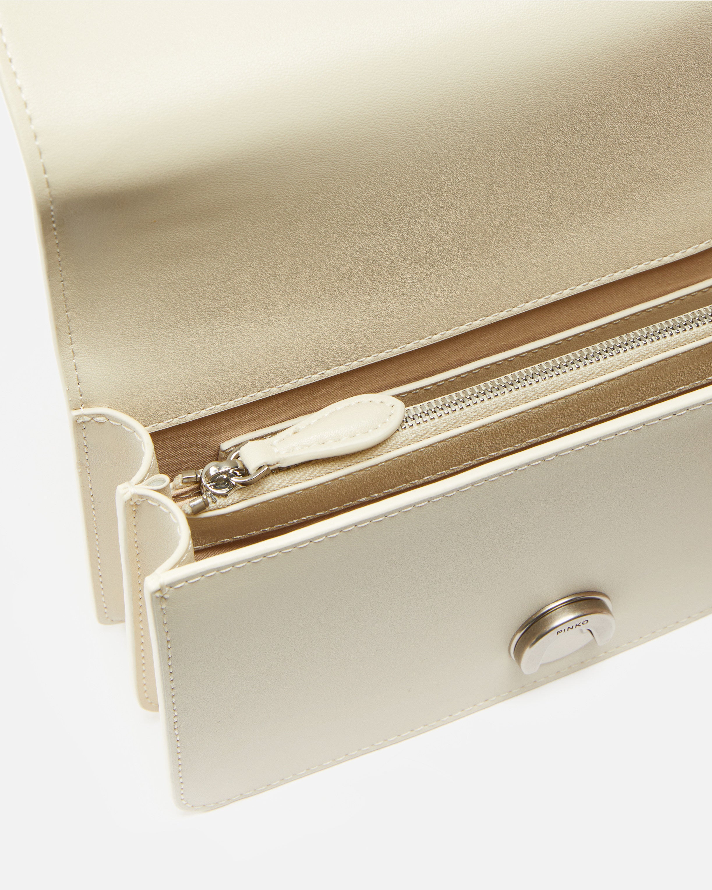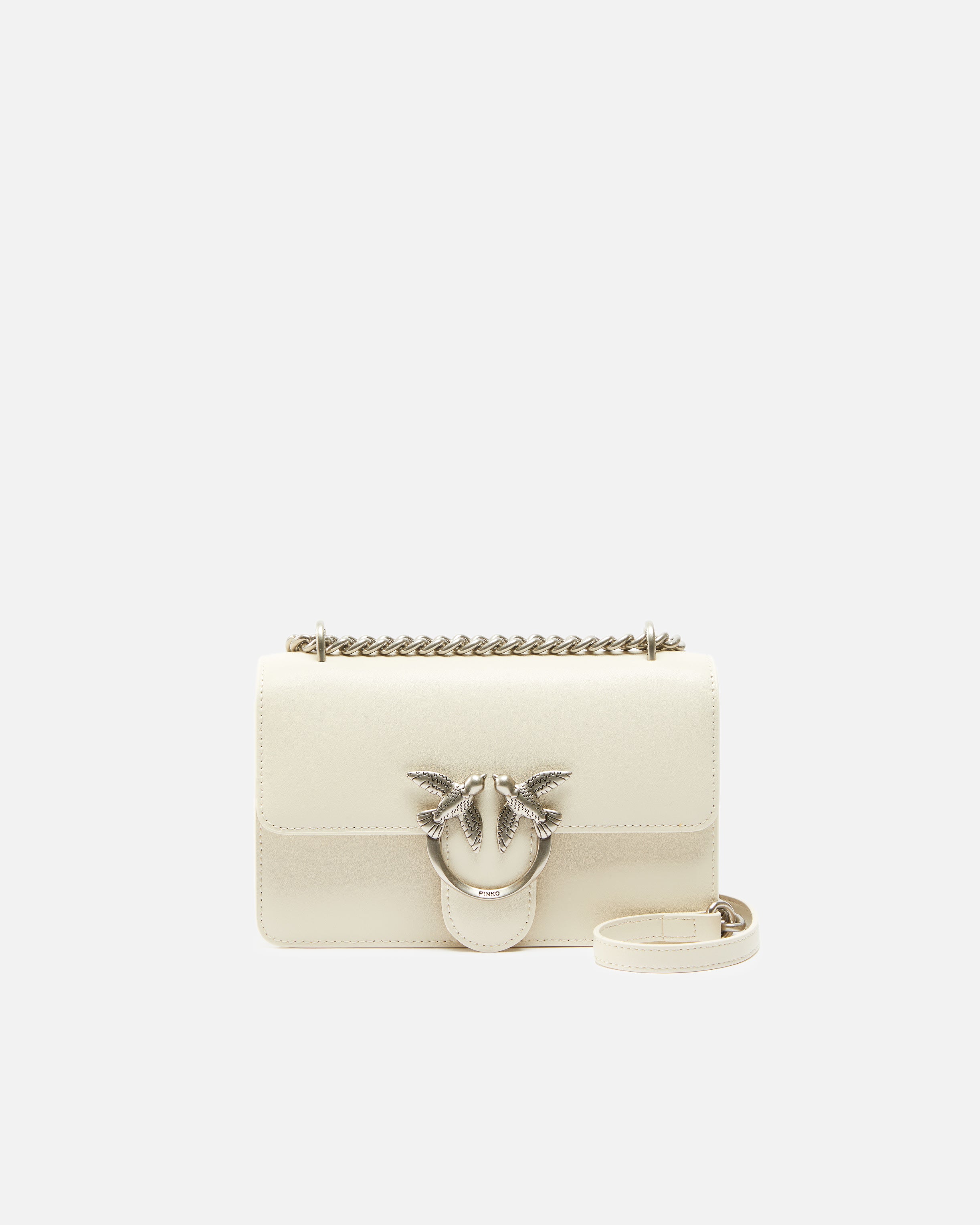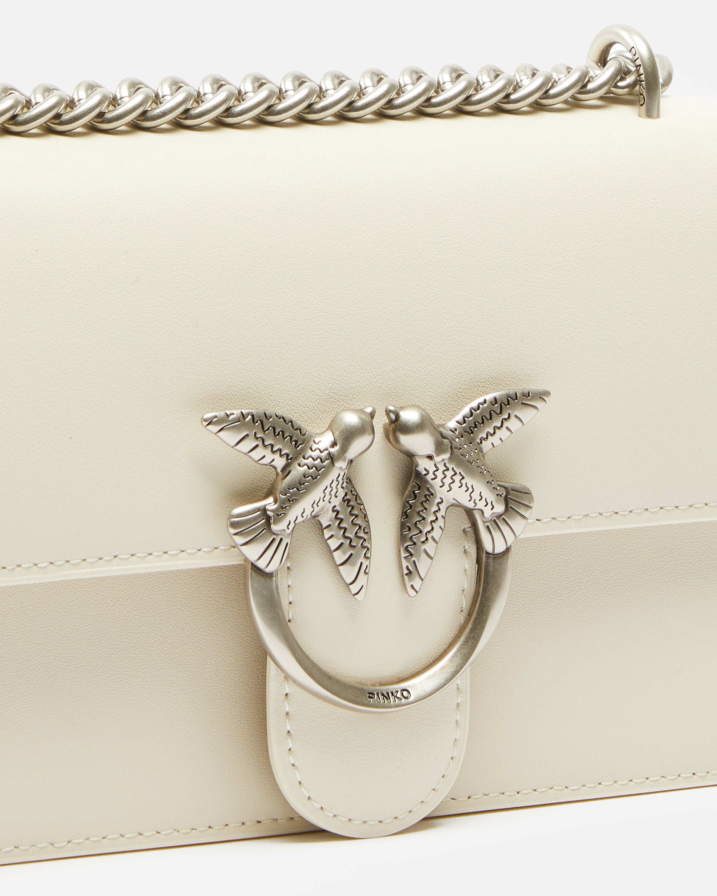 Mini Love Bag One in morbida pelle mano seta. La chiusura è completata dall'iconica fibbia in metallo Love Birds Diamond Cut in metallo. L'interno è foderato in microfibra scamosciata e comprende tramezza chiusa con zip e tasca a parete in pelle. La tracolla combina la classica catena rotonda al pratico spallaccio in pelle regolabile.
