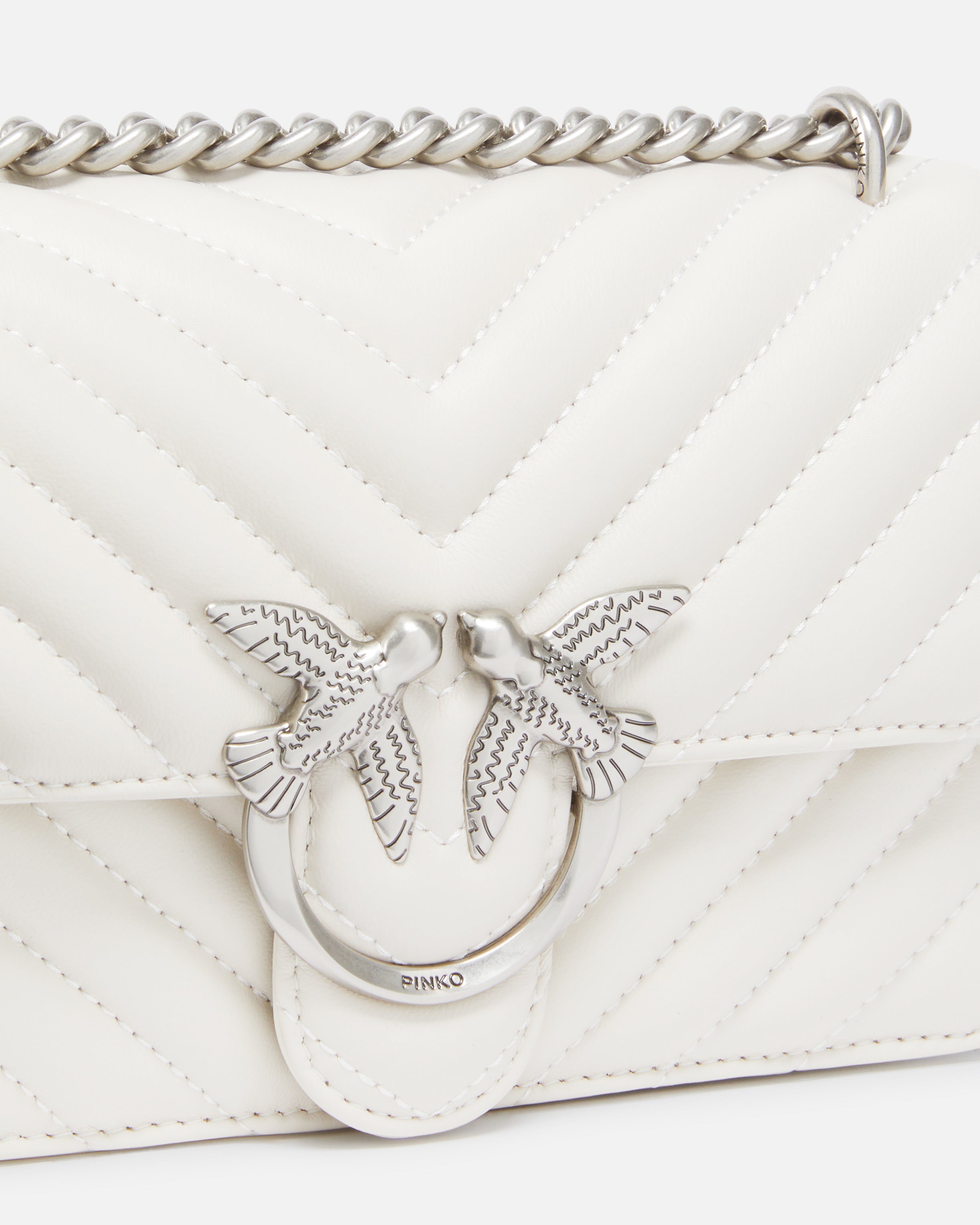 Mini Love Bag One in nappa trapuntata con motivo chevron. La chiusura è completata dall'iconica fibbia in metallo Love Birds Diamond Cut in metallo. L'interno è foderato in microfibra scamosciata e comprende tramezza chiusa con zip e tasca a parete in pelle. La tracolla combina la classica catena rotonda al pratico spallaccio in pelle regolabile.