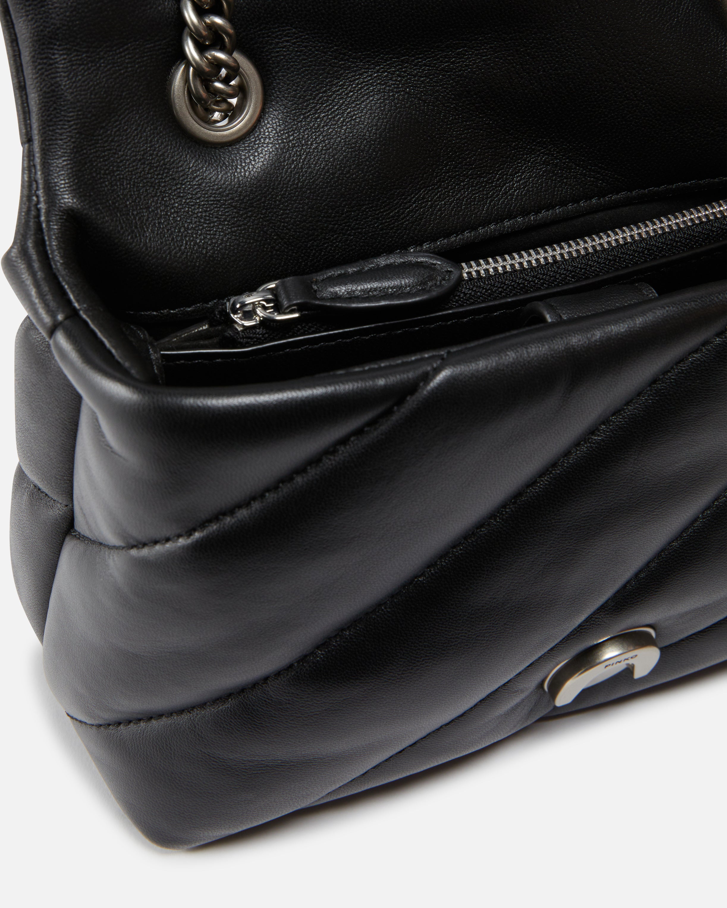 Mini Love Bag Puff in morbida nappa con maxi trapuntatura obliqua. La chiusura è completata dall'iconica fibbia in metallo Love Birds Diamond Cut. L'interno è foderato in microfibra scamosciata e comprende tramezza chiusa con zip e tasca a parete. La tracolla combina la classica catena metallica rotonda al pratico spallaccio in nappa.