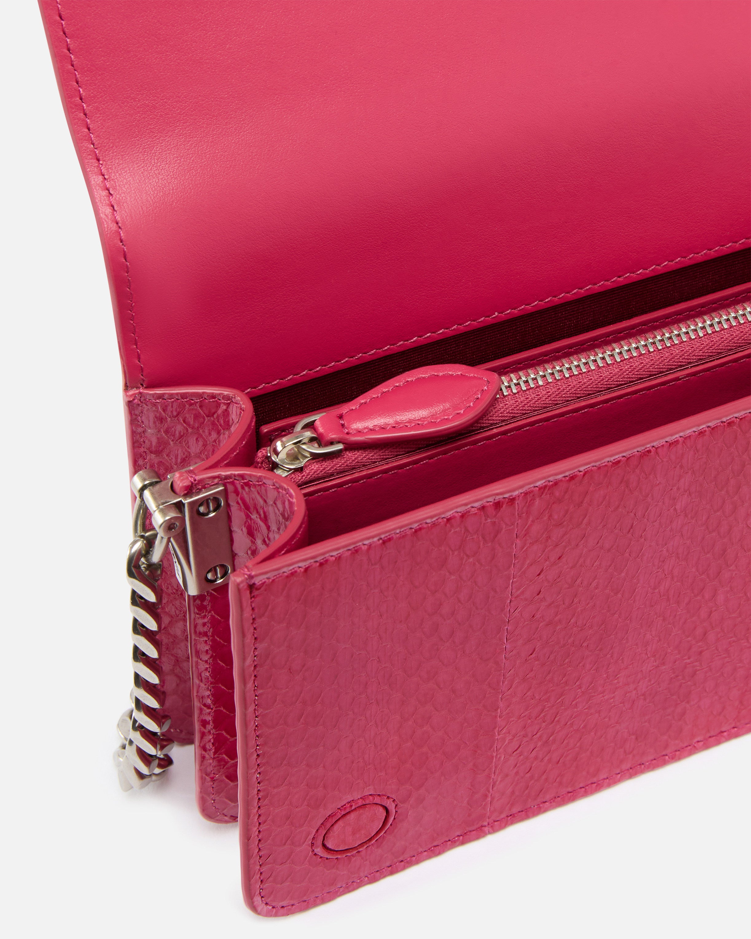 Borsa a tracolla di piccole dimensioni Mini Love Bag Click realizzata in pelle di rettile pitone ayers con una particolare rifinitura lucida. Questo particolare tipo di pellame viene piazzato sulla borsa e poi applicato a mano su ogni modello: in base alla pelle utilizzata, ogni borsa risulta perciò unica nel suo genere, eventuali imperfezioni sono da considerarsi un dettaglio caratteristico e distintivo. La tracolla a catena, completa di spallacccio regolabile in pelle, consente un appoggio comodo sulla spalla. L'interno della borsetta è foderato in tessuto e comprende una tasca tramezza chiusa con zip. L'iconica fibbia Love Birds Diamond Cut in metallo è resa ancora più preziosa dal pavè di cristalli applicato, per rendere uniche tutte le occasioni speciali in cui la indosserai. La borsa fa parte della speciale capsule collection Limited Edition realizzata in tiratura limitata esclusivamente per PINKO Galleria. Utilizza lo speciale chip NFC per vivere una speciale experience dedicata alla borsa che hai acquistato!