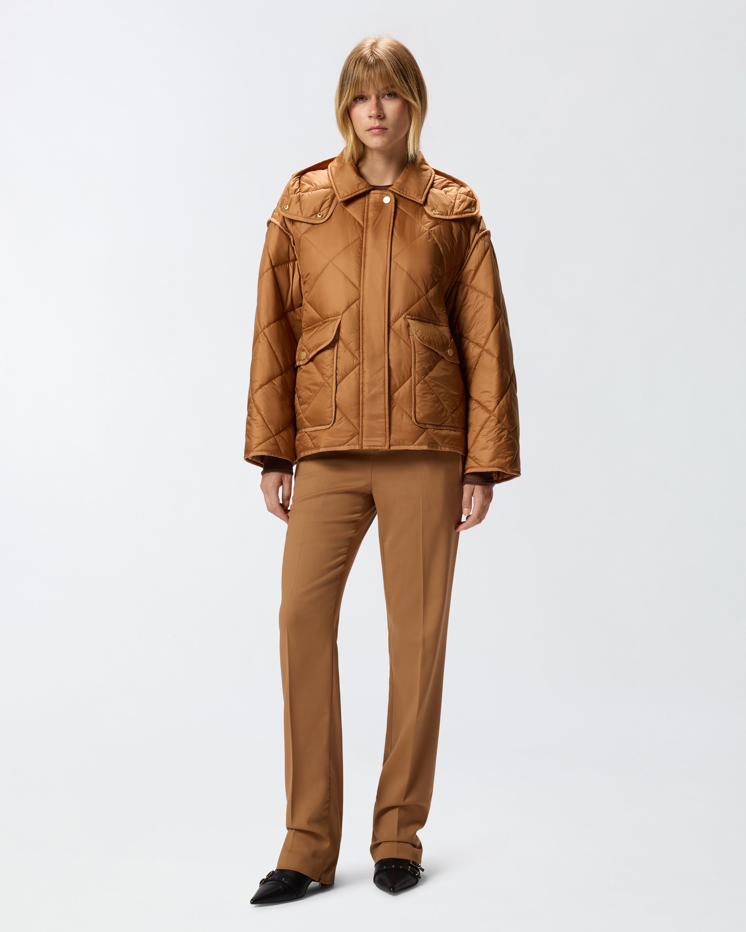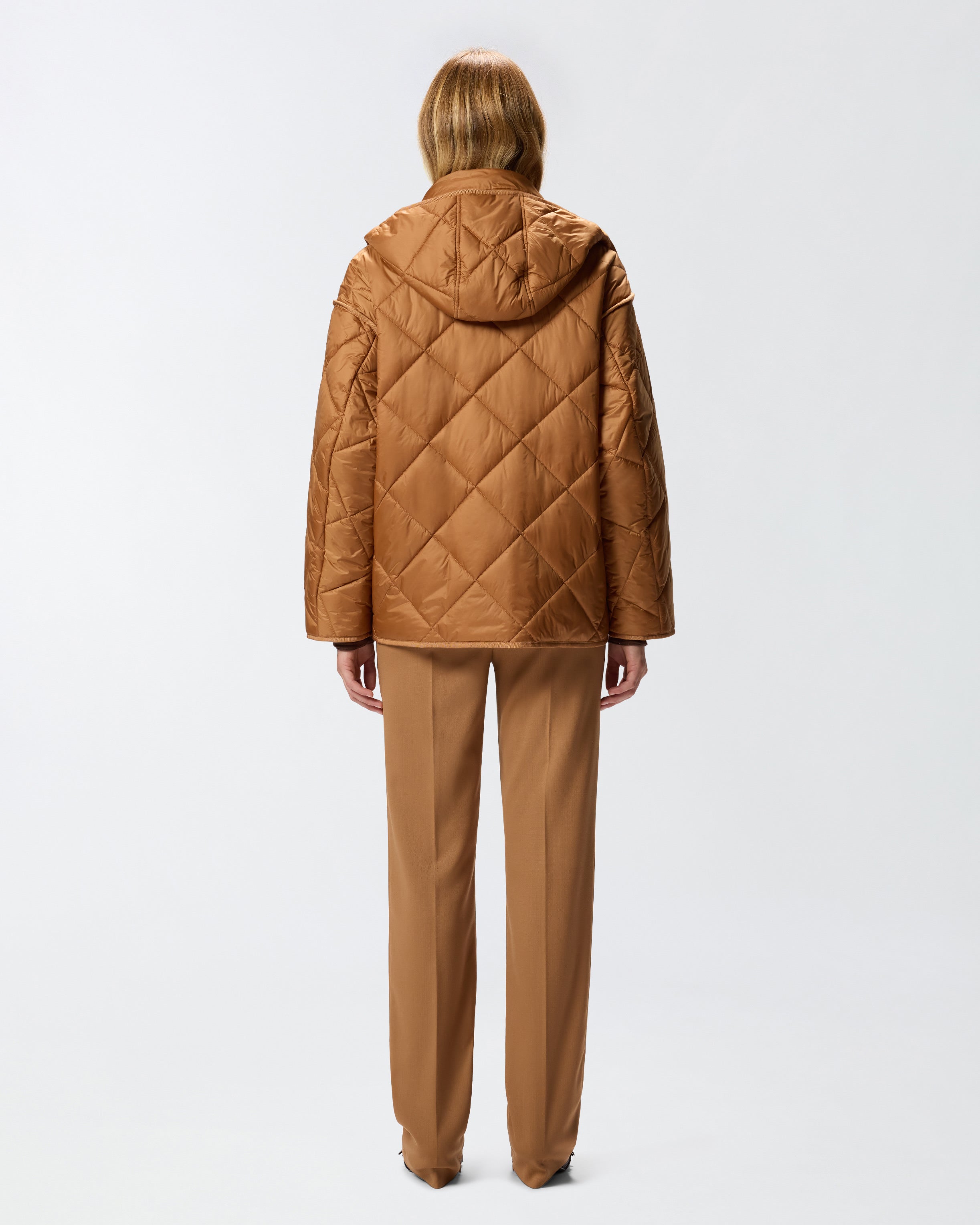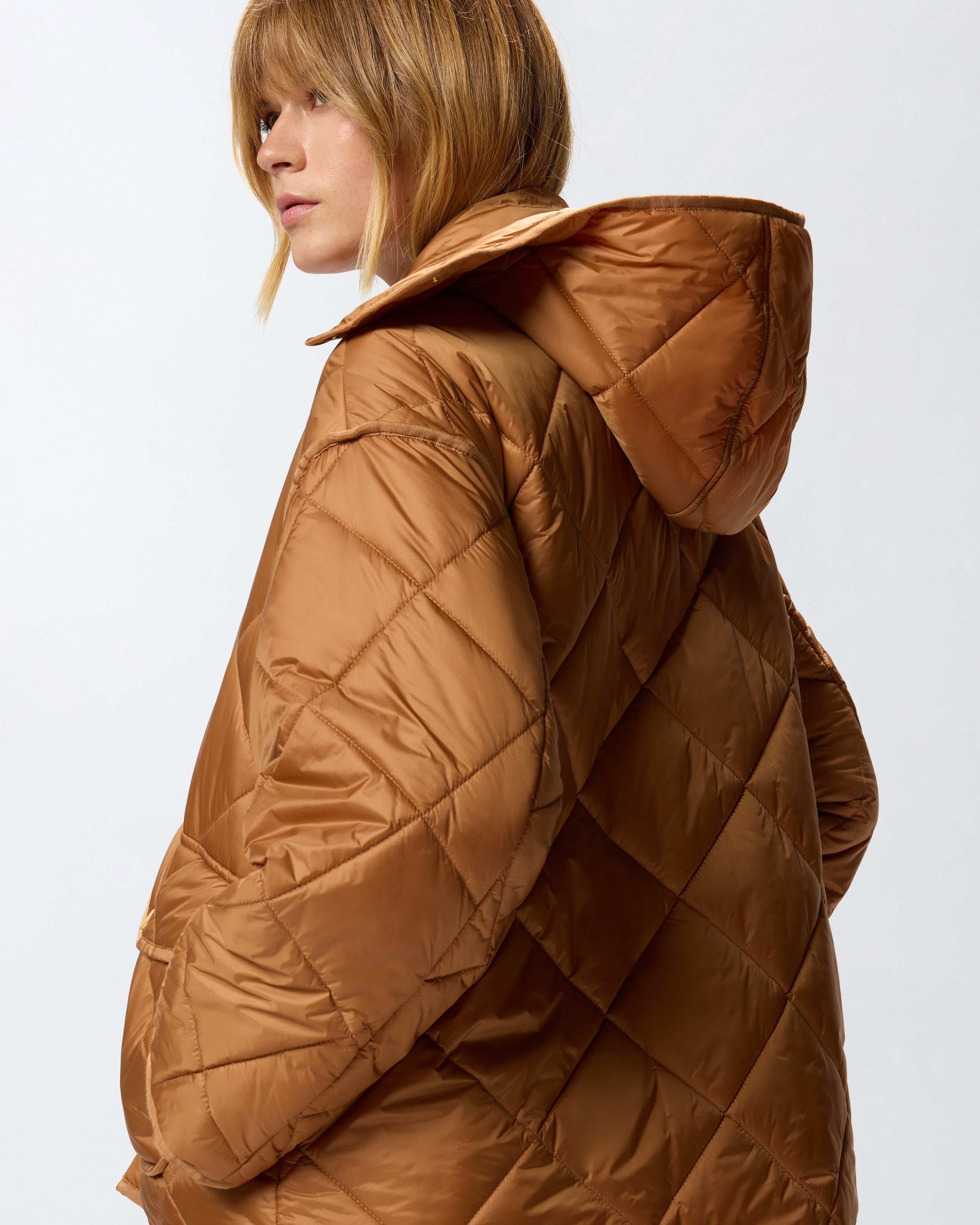 Caban leggermente imbottito, realizzato in tela tecnica dal particolare effetto semilucido e caratterizzato da una trapuntatura a rombi. Il modello è dotato di collo a camicia con cappuccio rimovibile e di ampie tasche applicate con pattina e bottone a pressione. Il taglio corto del piumino lo rende un capospalla perfetto da indossare tutti i giorni, per affrontare le prime giornate fredde della stagione.