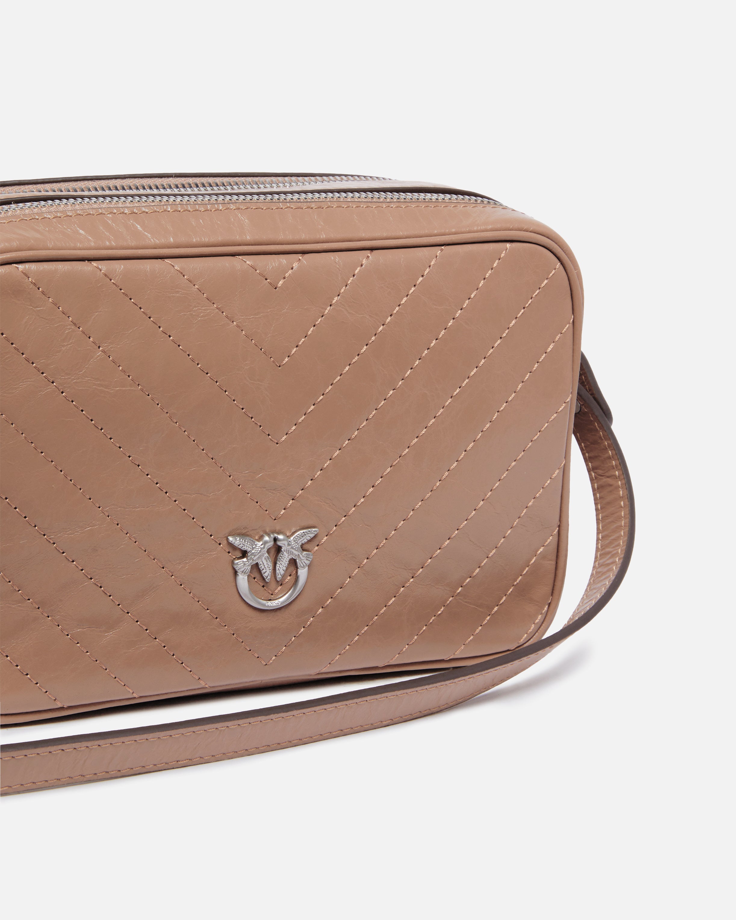 Borsa media stile camera bag foderata in cotone e realizzata in pelle con texture wrinkle, leggermente increspata, e trapuntatura con pattern chevron. Caratterizzata dalla tracolla regolabile in pelle per la portabilità a mano o a spalla, la borsa risulta estremamente versatile e pratica. Accessorio distintivo di infiniti look, questa borsetta è dotata di doppia zip e di tasche interne per tenere al sicuro i tuoi essenziali. Il design raffinato viene completato dal logo Love Birds che si fa portavoce dell'inimitabile stile del brand. Attiva la tua borsa PINKO: verifica l'autenticità del tuo prodotto e accedi all'esperienza personalizzata avvicinando il tuo smartphone al ricamo Love Birds che trovi sul retro della borsa!