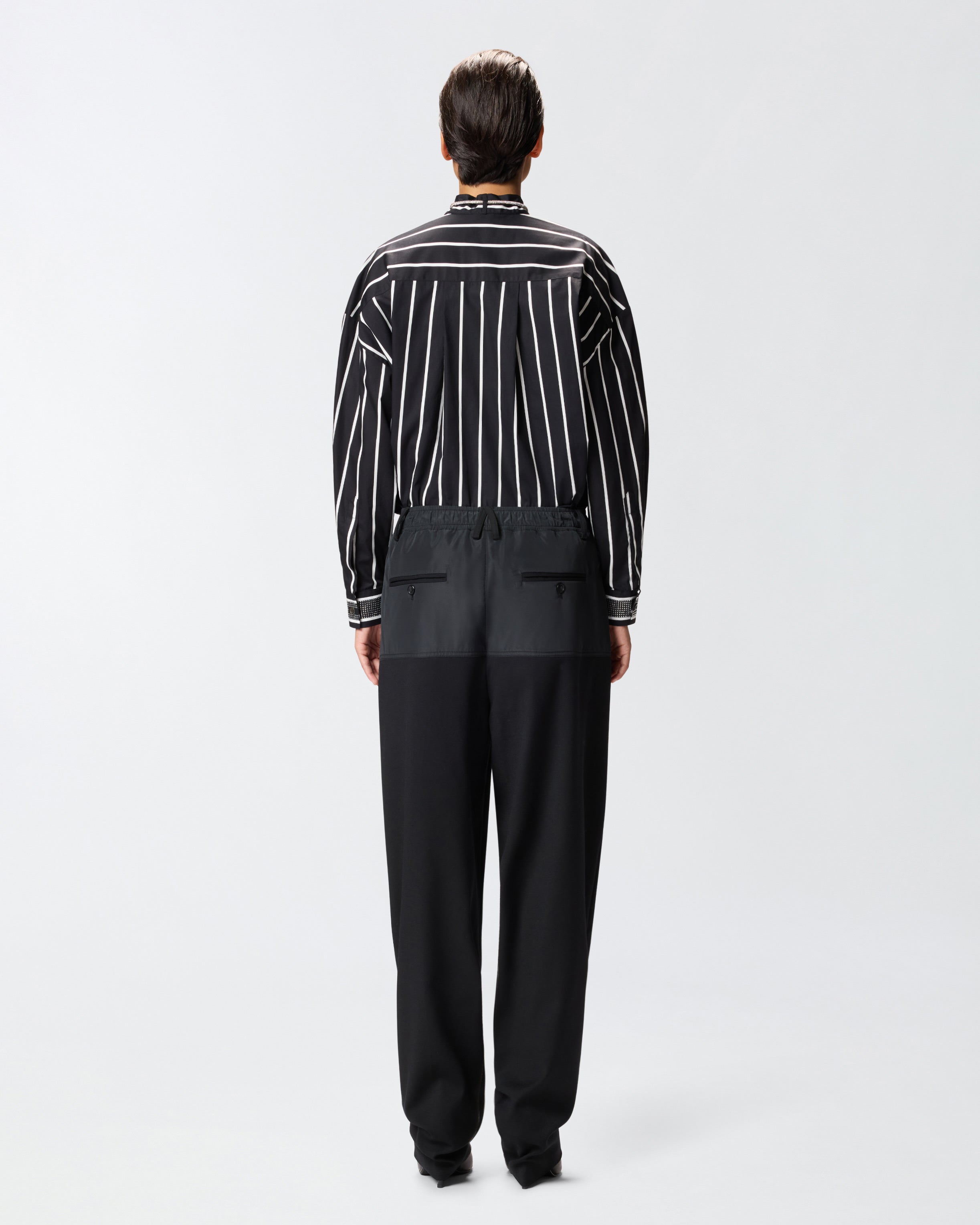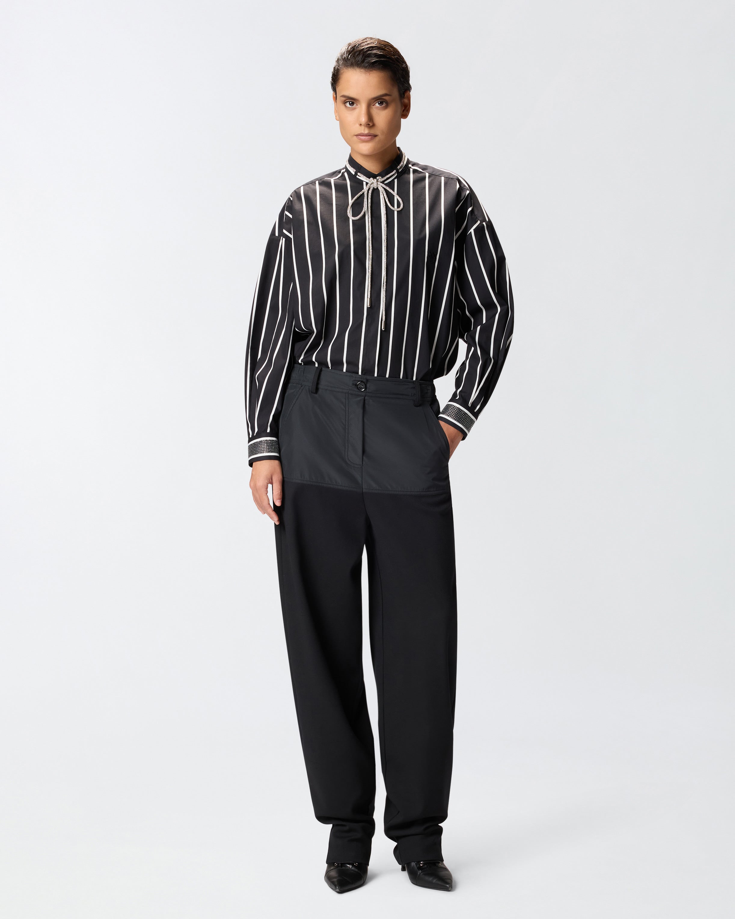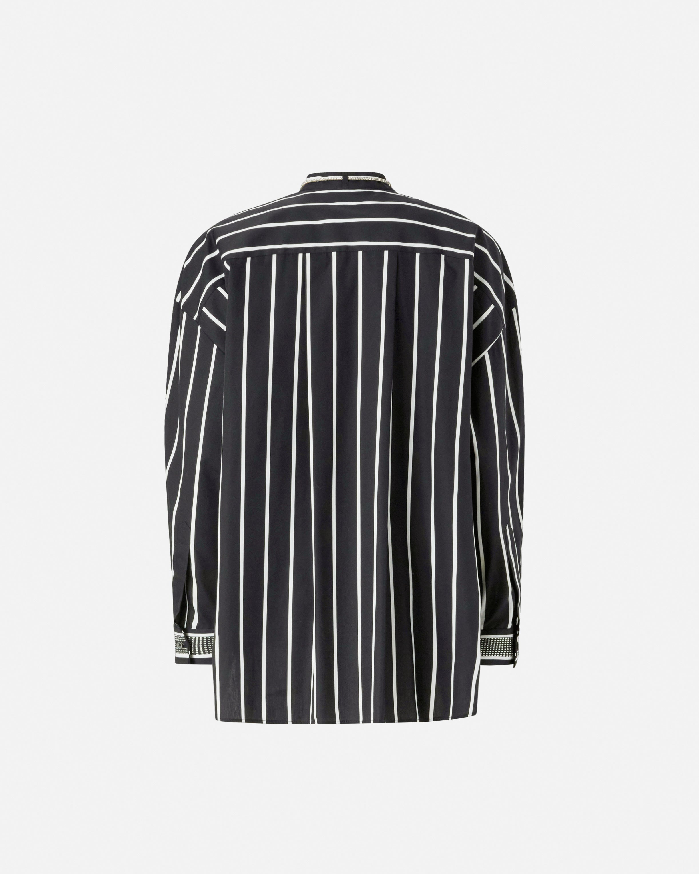 Camicia dal taglio classico e dal volume leggermente oversize, caratterizzata da una fantasia a righe verticali a contrasto. Il modello presenta un fondo capo dritto e una chiusura frontale nascosta, ed è impreziosito da un colletto rovesciato con laccetti ricoperti di strass, ripresi anche sul polsino delle maniche lunghe. Indossa questa camicia con un pantalone nero per un look elegante e femminile.