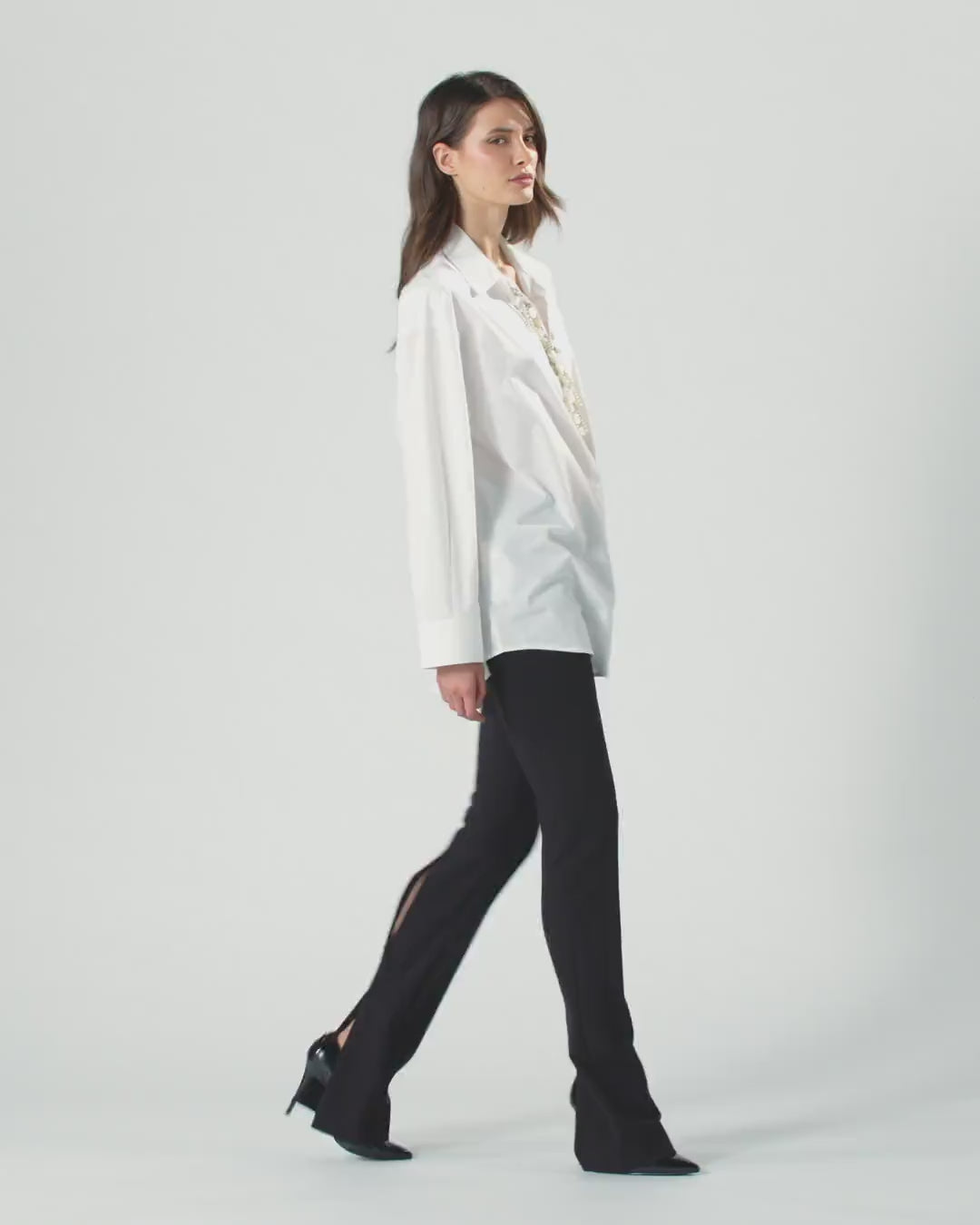 Camicia classica dal volume leggermente oversize in popeline di puro cotone. Il colletto si apre in un profondo scollo a V decorato da un prezioso ricamo fatto a mano con applicazioni in vetro e catenelle metalliche con strass, cucite una ad una, che donano movimento e luce al capo. Il volume morbido e le maniche lunghe a giro leggermente basso completano lo stile di questa camicia, da abbinare con facilità a una minigonna e a una giacca stampata per creare un outfit quotidiano femminile e caratteristico.