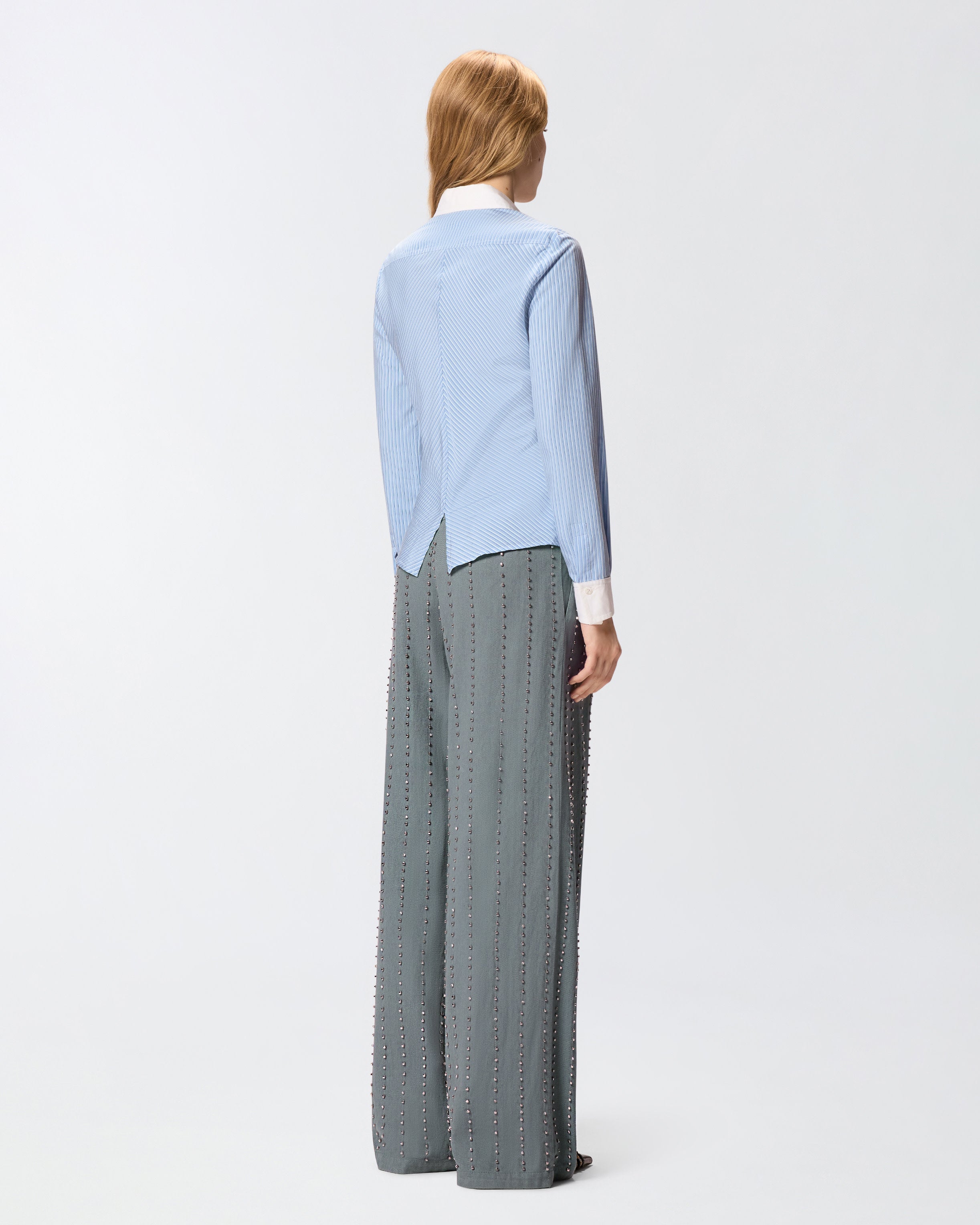 Camicia classica a maniche lunghe realizzata in popeline fluido tinto in filo con motivo a righe verticali dall'interessante effetto tridimensionale. Destinata a trasformarsi in un autentico passe-partout per dare un twist ai tuoi look quotidiani, questo modello è definito dal colletto e dai polsi che creano un piacevole contrasto, ed è completato da uno spacchetto centrale sul retro che conferisce ulteriore personalità al capo.